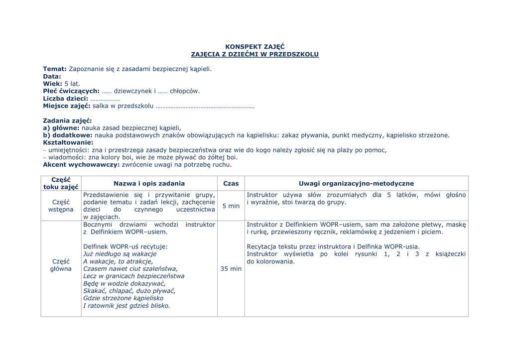 KONSPEKT ZAJĘĆ ZAJĘCIA Z DZIEĆMI W PRZEDSZKOLU Temat: Zapoznanie się z zasadami bezpiecznej kąpieli. Data: Wiek: 5 lat. Płeć ćwiczących: …… dziewczynek i …… chłopców. Liczba dzieci: ……………… Miejsce zajęć: salka w przedszkolu …………………………………………………… Zadania zajęć: a) główne: nauka zasad bezpiecznej kąpieli, b) dodatkowe: nauka podstawowych znaków obowiązujących na kąpielisku: zakaz pływania, punkt medyczny, kąpielisko strzeżone. Kształtowanie: umiejętności: zna i przestrzega zasady bezpieczeństwa oraz wie do kogo należy zgłosić się na plaży po pomoc, wiadomości: zna kolory boi, wie że może pływać do żółtej boi. Akcent wychowawczy: zwrócenie uwagi na potrzebę ruchu. Część toku zajęć Część wstępna Część główna Nazwa i opis zadania Przedstawienie się i przywitanie grupy, podanie tematu i zadań lekcji, zachęcenie dzieci do czynnego uczestnictwa w zajęciach. Bocznymi drzwiami wchodzi instruktor z Delfinkiem WOPR–usiem. Delfinek WOPR-uś recytuje: Już niedługo są wakacje A wakacje, to atrakcje, Czasem nawet ciut szaleństwa, Lecz w granicach bezpieczeństwa Będę w wodzie dokazywać, Skakać, chlapać, dużo pływać, Gdzie strzeżone kąpielisko I ratownik jest gdzieś blisko. Czas 5 min Uwagi organizacyjno-metodyczne Instruktor używa słów zrozumiałych dla 5 latków, mówi głośno i wyraźnie, stoi twarzą do grupy. Instruktor z Delfinkiem WOPR–usiem, sam ma założone płetwy, maskę i rurkę, przewieszony ręcznik, reklamówkę z jedzeniem i piciem. Recytacja tekstu przez instruktora i Delfinka WOPR-usia. Instruktor wyświetla po kolei rysunki 1, 2 i 3 z do kolorowania. 35 min książeczki Delfinek WOPR–uś recytuje: Ja najczęściej, mówię szczerze, Plackiem na słoneczku leżę, Bardzo lubię duże lody No i skoki: hop! – do wody. Choć naprawdę świetnie pływam, Po jedzeniu odpoczywam, A do wody wchodzę owszem, Ale zawsze z kimś dorosłym. Instruktor recytuje i wyświetla po kolei rysunki 4 i 5 z książeczki do kolorowania. Delfinek WOPR–uś recytuje: By uniknąć poparzenia, W dni słoneczne szukam cienia. A gdy słońce mocno praży, Zastosuję krem do twarzy. Wiem, też jako pływak młody, Że nie skacze się do wody. Instruktor recytuje i wyświetla po kolei rysunki 6 i 7 z książeczki do kolorowania. Delfinek WOPR–uś recytuje: Jak zobaczę ratownika, To się witam a nie zmykam, Pan ratownik mi doradzi, Jak poruszać się po plaży, Jak nie obić sobie głowy, By do domu wrócić zdrowy. Instruktor recytuje i wyświetla po kolei rysunki 8 i 9 z książeczki do kolorowania. Karta pracy nr 1. „Delfinek WOPR–uś pyta:” Zadaniem instruktora jest wyświetlenie na ekranie i odczytanie poszczególnych haseł oraz zainicjowanie swobodnych wypowiedzi przedszkolaków tak, by dopisać brakujące hasło (może być ich kilka). Karta pracy nr 2. „Delfinek WOPR-uś radzi jak zachować się nad wodą.” Zadaniem instruktora jest wyświetlenie na ekranie i odczytanie zdań. Zadaniem dzieci, jest dopasowanie brakujących wyrazów z ramki i wstawienie ich w brakujące miejsca. Po uzupełnieniu tekstu, instruktor odczytuje hasła na głos. Zadanie: kolorowanie książeczek. Część Końcowa Instruktor z WOPR–usiem omawia zrealizowane zadania lekcji, podsumowuje ją, zachęca dzieci do nauki pływania oraz bezpiecznego korzystania z kąpieli pod nadzorem ratownika i osób dorosłych w miejscach strzeżonych, przypomina o zasadach bhp i higieny, prosi o pokolorowanie książeczki. Pożegnanie grupy. 5 min Instruktor rozdaje książeczki do kolorowania i kredki każdemu dziecku. Prosi, by dzieci wspólnie wybrały jeden rysunek i teraz go pomalowały. Zwraca się z prośbą do wychowawców przedszkolnych, aby każda książeczka na ostatniej stronie była podpisane imieniem i nazwiskiem dziecka, ponadto aby na książeczce napisać nr przedszkola i nazwę miejscowości. Instruktor za pośrednictwem WOPR-usia chwali cała grupę, prosi również, by na następne zajęcia pokolorowali do końca książeczkę z rysunkami. Książeczka będzie brała udział w konkursie na najlepszego Młodego Malarza. Instruktor prosi wychowawców przedszkolnych o zebranie wszystkich pokolorowanych książeczek i oddanie ich instruktorowi na następnych zajęciach. Materiały i sprzęt wykorzystany do realizacji tematu: tablice edukacyjne, książeczki do kolorowania, kredki, ekran, rzutnik multimedialny, płetwy, maska, rurka, ręcznik, reklamówka z jedzeniem, piciem i kremem przeciwsłonecznym NIVEA. o nieszczęśliwego wypadku.
