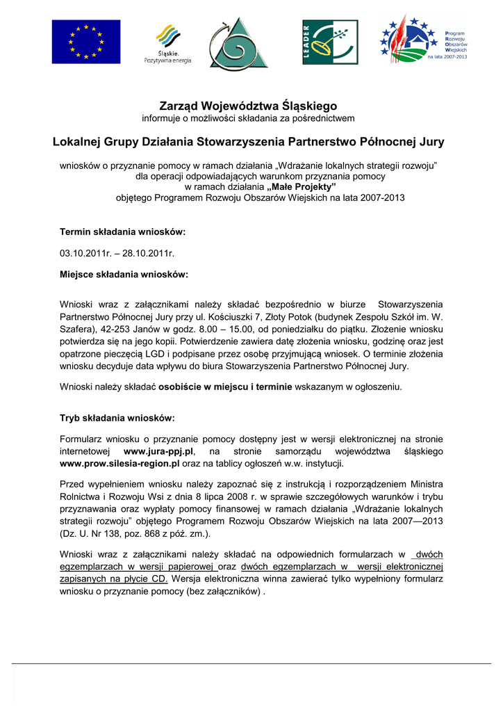 Zarząd Województwa Śląskiego informuje o możliwości składania za pośrednictwem Lokalnej Grupy Działania Stowarzyszenia Partnerstwo Północnej Jury wniosków o przyznanie pomocy w ramach działania „Wdrażanie lokalnych strategii rozwoju” dla operacji odpowiadających warunkom przyznania pomocy w ramach działania „Małe Projekty” objętego Programem Rozwoju Obszarów Wiejskich na lata 2007-2013 Termin składania wniosków: 03.10.2011r. – 28.10.2011r. Miejsce składania wniosków: Wnioski wraz z załącznikami należy składać bezpośrednio w biurze Stowarzyszenia Partnerstwo Północnej Jury przy ul. Kościuszki 7, Złoty Potok (budynek Zespołu Szkół im. W. Szafera), 42-253 Janów w godz. 8.00 – 15.00, od poniedziałku do piątku. Złożenie wniosku potwierdza się na jego kopii. Potwierdzenie zawiera datę złożenia wniosku, godzinę oraz jest opatrzone pieczęcią LGD i podpisane przez osobę przyjmującą wniosek. O terminie złożenia wniosku decyduje data wpływu do biura Stowarzyszenia Partnerstwo Północnej Jury. Wnioski należy składać osobiście w miejscu i terminie wskazanym w ogłoszeniu. Tryb składania wniosków: Formularz wniosku o przyznanie pomocy dostępny jest w wersji elektronicznej na stronie internetowej www.jura-ppj.pl, na stronie samorządu województwa śląskiego www.prow.silesia-region.pl oraz na tablicy ogłoszeń w.w. instytucji. Przed wypełnieniem wniosku należy zapoznać się z instrukcją i rozporządzeniem Ministra Rolnictwa i Rozwoju Wsi z dnia 8 lipca 2008 r. w sprawie szczegółowych warunków i trybu przyznawania oraz wypłaty pomocy finansowej w ramach działania „Wdrażanie lokalnych strategii rozwoju” objętego Programem Rozwoju Obszarów Wiejskich na lata 2007—2013 (Dz. U. Nr 138, poz. 868 z póź. zm.). Wnioski wraz z załącznikami należy składać na odpowiednich formularzach w dwóch egzemplarzach w wersji papierowej oraz dwóch egzemplarzach w wersji elektronicznej zapisanych na płycie CD. Wersja elektroniczna winna zawierać tylko wypełniony formularz wniosku o przyznanie pomocy (bez załączników) . Kryteria wyboru operacji w ramach „Małych Projektów” stosowane przez Stowarzyszenie Partnerstwo Północnej Jury Lokalne kryteria wyboru operacji oraz karta oceny zgodności operacji z Lokalną Strategią Rozwoju (LSR) dla działania „Małe Projekty” znajdują się na stronie www.jura-ppj.pl oraz na stronie samorządu województwa śląskiego www.prow.silesia-region.pl, w LSR Stowarzyszenia Partnerstwa Północnej Jury. Wykaz dokumentów niezbędnych do wyboru „Małych Projektów” przez Stowarzyszenie Partnerstwo Północnej Jury: 1. Wniosek o przyznanie pomocy wraz z wymaganymi załącznikami 2. Oświadczenie o przetwarzaniu danych osobowych Wykaz dokumentów niezbędnych do wyboru operacji „Małe Projekty” znajduje się na stronie www.jura-ppj.pl, na stronie samorządu województwa śląskiego www.prow.silesiaregion.pl. Minimalne wymagania, których spełnienie jest niezbędne do wyboru operacji w ramach „Małych Projektów” przez Radę Stowarzyszenia „Partnerstwo Północnej Jury” Operacjami wybranymi przez Radę do finansowania w ramach działania „Małe Projekty” są tylko te operacje, które uzyskały ocenę końcową wynoszącą, co najmniej 50% maksymalnej liczby punktów, co stanowi 40 punktów. Limit dostępnych środków Limit dostępnych środków w konkursie nr 3/2011/M w ramach „Małych Projektów” na rok 2011 wynosi 339 629,68 zł, przy czym wysokość pomocy przyznanej na realizację jednego „Małego Projektu” nie może być wyższa niż 25 tys. zł. Pomoc jest przyznawana jeśli całkowity planowany koszt operacji wynosi co najmniej 4,5 tys. złotych. Refundacji podlega nie więcej niż 70 % kosztów kwalifikowalnych „Małego Projektu” poniesionych przez beneficjenta. Pomoc na „ Małe Projekty” przyznaje się i wypłaca do wysokości limitu, który w okresie realizacji programu wynosi 100 tys. zł. na jednego beneficjenta. Szczegółowych informacji na temat konkursu udziela LGD Stowarzyszenie Partnerstwo Północnej Jury w biurze: ul. Kościuszki 7, Złoty Potok, 42- 253 Janów , tel. 034 327 89 43; e-mail: [email protected]