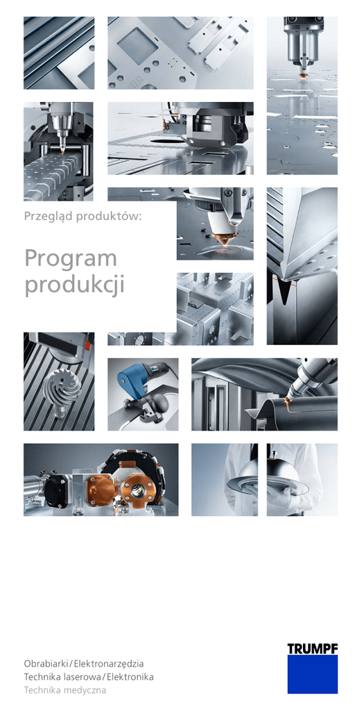 Przegląd produktów: Program produkcji Obrabiarki / Elektronarzędzia Technika laserowa / Elektronika Technika medyczna Produkty przedstawione w broszurze nie są dostępne we wszystkich krajach. Zastrzegamy sobie prawo do zmian. Obowiązują dane przedstawione w naszych ofertach oraz potwierdzeniach zamówień. Grupa TRUMPF należy do czołowych w skali światowej producentów maszyn do obróbki blachy i laserów przemysłowych i zatrudnia ok. 9900 pracowników w ponad 60 zakładach na całym świecie. Zaawansowane technologicznie rozwiązania o wysokim stopniu ekonomiczności znajdują się w centrum na szych działań od 1923 roku. Nasze innowacje wyznaczają standardy w tech nologii laserowej, laserach, obrabiarkach, elektronarzędziach oraz technice medycznej. Nasza firma zapewnia Państwu najwyższej klasy produkty oraz innowacyjne rozwiązania, które są proste w codziennym zastosowaniu przy zachowaniu najwyższej wydajności procesu. Nasz kompleksowy serwis obejmuje szereg usług: od konfiguracji Państwa maszyny aż po optymalizację przebiegu jej pracy. Jeśli potrzebują Państwo informacji o naszych urządzeniach, doradzimy Państwu w optymalny sposób. 3 Najbardziej zaawansowana technologia. Cięcie laserem 2D TruLaser: Ekonomiczne cięcie grubych i cienkich blach. 11–21 Obróbka 2D i 3D Systemy laserowe: Podejmujemy wyzwania. 23–29 Cięcie laserowe rur TruLaser Tube: Przygotowane na nowe pomysły. 31–33 Obróbka kombi TruMatic: Perfekcyjne połączenie wykrawania i cięcia laserem. 35–39 Wykrawanie TruPunch: Wykrawanie na wyższym poziomie wydajności. 41–45 Gięcie TruBend Większy zakres gięcia. 47–52 Automatyzacja gięcia TruBend Cell: Optymalna automatyzacja. 4 55–57 Wiązki laserowe Laser: Do każdego zadania doskonałe rozwiązanie. 59–69 Znakowanie laserowe Znakowarki: Łatwe znakowanie. 71–76 Systemy magazynowe TruStore: Kompaktowe i elastyczne składowanie. 79–81 Elektronarzędzia TruTool: Narzędzia z napędem elektrycznym i akumulatorowym. 82–83 Serwis TruServices: Serwis jak żaden inny. Sh Ma Join Designing Separatin g Shapi ng ing rki ng ip pi ng 85–97 Dodatkowo: etapy obróbki blachy Od pomysłu po gotowy detal dzięki firmie TRUMPF. 6–7 5 Etapy w procesie obróbki blachy. Konstruowanie R o z c i n a n ie P mow rzefor TruTops Fab Łatwe sterowanie całą produkcją. 6 ywan ie W Zn Łącz eni ak a ow nie ys ył ka e Zalety w skrócie. 1 Bezproblemowa integracja dzięki systemowi kompetencji TRUMPF. 2 Indywidualna ścieżka rozwoju. 3 Wszystko od jednego dostawcy. 7 Zalety w skrócie. Proces obróbki blachy obejmuje kompleksową produkcję, a więc etapy ko nieczne, aby z pomysłu powstał gotowy detal. Oferujemy Państwu rozwiązania podczas całego procesu obróbki blachy: od konstrukcji po wysyłkę detalu, a także od maszyny poprzez oprogramowanie aż do usług serwisowych. Bezproblemowa integracja dzięki systemowi kompetencji TRUMPF. Nadzorujemy etapy obróbki blachy. Nasze rozwiązania są do siebie doskonale dopasowane, dlatego na początku myślimy o wszystkim. Nasze maszyny, narzędzia, oprogramowanie i serwis są skonfigurowane w sposób optymalnie przygotowujący do następnego etapu obróbki. Szczególną uwagę poświęcamy systemom – nasze oferty towarzyszą Państwu na każdym etapie począwszy od doradztwa, tak aby proces przebiegał bez zarzutu. Indywidualna ścieżka rozwoju. Początki bywają skromne, jednak każdy chce się rozwijać i poszerzać swoje możliwości, tak aby odróżniać się od konkurencji. Dzięki nam osiągają Państwo poziom odpowiedni do Państwa sytuacji – rozwój Państwa firmy jest równoznaczny z rozwojem rozwiązań. Od początku pokazujemy drogę i sposób wejścia na szczyt. Nie muszą Państwo przy tym powielać schematów, lecz mogą podążać własnymi ścieżkami rozwoju. 8 Wszystko od jednego dostawcy. Dzięki temu, że nadzorujemy etapy obróbki blachy, jesteśmy partnerami dla naszych klientów na wszystkich etapach oraz zapewniamy bezproblemowy przebieg procesu. Nasze rozwiązania są do siebie doskonale dopasowane: obróbka jest zoptymalizowana w każdym calu, a dzięki inteligentnemu opro gramowaniu mają Państwo możliwość obserwacji całego przebiegu obróbki w czasie rzeczywistym. 9 10 TruLaser: Ekonomiczne cięcie grubych i cienkich blach. Urządzenia TruLaser dają Państwu zdecydowaną prze wagę w obróbce detali 2D. Przy pomocy laserów obrabiają Państwo dowolne kontury w blachach cienkich i grubych – to wszystko z zachowaniem najwyższej jakości. 11 TruLaser Seria 1000 Ekonomiczne i przyjazne w obsłudze maszyny kompaktowe. Niskie koszty inwestycyjne i eksploatacji Łatwość obsługi Mała powierzchnia zabudowy – tylko 25 m2 Szybka i łatwa instalacja Poszerzenie możliwości produkcyjnych o spawanie laserowe TruLaser 1030 TruLaser 1030 fiber Obszar roboczy 3000 x 1500 mm 3000 x 1500 mm Maks. prędkości symultanicznie 85 m/min 85 m/min TruCoax 2500 TruDisk 2001 2000 W Dostępne rezonatory laserowe Maks. moc lasera 2500 W Maks. grubość – stal konstr. 16 mm 12 mm Maks. grubość – stal nierdz. 8 mm 6 mm Maks. grubość – aluminium 6 mm 5 mm Maks. grubość – miedź 3 mm Maks. grubość – mosiądz 3 mm 12 TruDisk 3001 3000 W 16 mm 8 mm 6 mm 4 mm 4 mm 13 TruLaser Seria 3000 Elastyczne maszyny standardowe. Optymalna elastyczność obróbki Duże prędkości cięcia i minimalne czasy przestoju Ekonomiczna i prosta konserwacja Łatwość obsługi Zróżnicowane rozwiązania dotyczące automatyzacji TruLaser 3030 Lean Edition [1] TruLaser 3030 [2] Obszar roboczy 3000 x 1500 mm 3000 x 1500 mm Maks. prędkości symultaniczne 140 m/min 140 m/min TruFlow 3200 TruFlow 4000 Maks. moc lasera 3200 W 4000 W Maks. grubość – stal konstr. 20 mm 20 mm Maks. grubość – stal nierdz. 12 mm 15 mm Maks. grubość – aluminium 8 mm 10 mm Dostępne rezonatory laserowe Maks. grubość – miedź Maks. grubość – mosiądz [1] Dostępny tylko z rezonatore