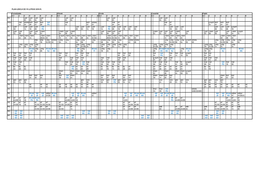 PLAN LEKCJI OD 15 LUTEGO 2016 R. Poniedziałek 0 1 2 ZG ADU JL KP j.pol 3D j.pol 3C GE ES JD JS Kw IK TM AA hist 3B mat 1A mat 1B fiz 3A 3 4 j.pol j.pol 2C 2C mat sztuka tech 3A 3A 2B j.pol j.pol 1A 1B j.pol j.pol 3B 3B j.niem j.niem j.niem 2A 3B 1A 5 j.pol 3A tech 2C j.pol 2B j.pol 2A plas 1A j.ang j.ang j.ang j.ang 2A 3B 1A 1B 45 min j.ang DC 1B hist hist hist 2B 2A 3C mat mat mat 2C 3D 2A mat 3C fiz fiz 3D 3C Wtorek 0 1 6 j.pol 3A tech 3B ind PN j.niem 2C j.niem 2B/2C plas 1B 7 8 j.ang 2B 30 min 60 min ind PN j.niem 3C j.ang sztuka 3C/3D 3C NJ KK hist 3A mat 2C GK AF AS biol 3A geo 2C geo 1A biol 3B j.niem 2A g wych 1A j.ang 2A chem 3B biol 1B biol 2A geo 2B TB rel 3D rel 1A 2 j.pol 2C mat 3A 3 j.pol 3A 5 6 7 j.pol 2B j.pol 3D tech 3C j.pol 1A sztuka 2A j.pol 1B j.pol 3B j.niem 1A j.ang 1A j.niem 1B j.niem j.niem j.niem 1B 3A 3B j.ang j.ang 3A 3B j.ang j.ang 3C 2C/2B ind j.ang PN 2B hist hist hist 3D 1A 1B mat mat mat 3D 2A 1A mat mat mat ind 3C 2B 3B PN ind inf inf PN 3C 2C chem chem chem 3C 2C 3A ind chem PN 2A geo 2A rel rel rel rel 1B 3B 3D 3C rel 2C rel 2B wdżwr 60 min 2A/2B KK ind JD wf wf 2A/2B 1A/2C wf wf wf 3C/3D 2A/2B 2C wf wf 3C/3D 1A Środa 8 0 1 4 j.niem j.niem 3A 3C/3D j.ang 3D j.ang 3A 60 min FI 2 j.pol 3A 3 j.pol 2C mat 3A j.pol ind j.pol 1A PN 2B j.pol j.niem j.pol 3C 2B 2A j.niem j.niem 2B/2C 3C/3D sztuka j.ang j.ang 3B 2A 3D j.ang j.ang j.ang 1B 2A 3C j.ang j.ang 1B 2C hist 2C mat 1B inf 2B chem 3D wos 3B rel 2A mat 2C mat 2B fiz 2A mat 1A mat 3B fiz 1B mat 1B fiz 1A biol 3A wos 3D biol 3C geo 3D biol 3B ind PN 4 inf 3A j.pol 1B j.pol 2A j.niem 1A j.ang 3A j.ang 1A hist 3B mat 3D mat 3C fiz 2C geo 2B 5 6 7 8 j.pol 1B j.pol 3D j.pol 3D Czwartek 0 1 2 j.pol 3A 9 hist 2B fiz 2B inf 2A biol 3D geo 3A biol 1A wos 3C 45 min JD RB AD wf 2A/2B wf 2A/2B wf 1B wf 1B RG MG RP ind DC ind AO ind DC ind AO wf 1B wf 1B ind JD ind JD 30 min 45 min PN PN wf 3C/3D wf 3C/3D wf 3C/3D wf 3C/3D wf 3A/3B wf 3A/3B ind JD wf 1B wf 1B KK ind DC ind AO ind AO ind AO wdżwr 2C 45 min ind DC 5 6 j.pol 3D j.niem 1B j.niem 1B j.ang 3B j.pol 1A 7 j.pol 2A j.niem 3A j.ang g wych sztuka 3A 3D 3D hist 1A j.ang 60 min 2C FI hist g wych 1B 2B mat 3C inf 3B chem 3A fiz 3B inf 2C chem 3D geo 2C 8 geo 3C ind JD wf 1A/2C wf 2C wf 1A ind DC ind JD wf 3A/3B wf 3A/3B muz 1A ind JD 30 min 60 min KK KK wf 3A/3B wf 3A/3B g wych 3B ind DC ind AO ind AO 3 4 g wych tech 3A 3A j.pol 2B j.pol j.niem j.pol 3C 2B 3B j.ang 1A j.ang j.ang 2C/2B 1A j.ang 2C hist 3D mat mat 1A 2A mat 3C fiz 1B 5 tech 2A j.pol 1A tech 3D j.pol 2B j.pol 2A j.niem j.niem 3D 3B j.ang j.ang 3C/3D 3B j.ang 3C 6 g wych 1B j.niem 2A j.niem 3A j.ang 2A j.ang 3A 7 8 g wych 3C j.ang 3D 45 min 60 min NJ KK ind PN mat 1B mat 3B chem 2B geo 1B rel 2C biol 3C biol 3D rel 3A rel 2B g wych 2C wos 3A muz ind 1B PN ind 45 min 30 min JD JD JD 45 wf wf PN 2A/2B 2A/2B edb 3D ind DC Piątek 0 1 2 j.ang 1B j.ang 1B hist 2C mat 3D mat 2B fiz 1A geo 3B rel 2A rel 3A JG WL 4 inf 3A j.pol 1B j.niem j.pol j.pol j.pol 2C 3C 3C 3B j.niem j.niem 1A 3D j.ang j.ang 1A 3C/3D j.ang j.ang j.ang j.ang 2C/2B 3B 2A 3A j.ang 30 min 45 min 45 min 2B DC DC NJ hist ind hist 3A PN 2A g wych mat mat mat 2A 2C 3D 1A mat mat mat 3B 2B 1B inf inf inf inf 3D 3B 2A 3C chem chem 3C 3B chem chem biol biol 1B 1A 2B 2C wos wos 2A 2B j.niem j.niem j.niem 3B 2A 3C sztuka sztuka 2C 2B j.ang 3B hist 3C mat 2A 3 j.pol 2C mat 3A wf wf edb 2A/2B 2A/2B 3C ind DC geo 2A rel 3B wos 2C rel 1B rel 1A sztuka 3ABCD2ABC ind JD edb 3A ind AO ind AO ind JD 45 min wdżwr wdżwr KK wf 1A/2C wf wf wf 3C/3D 3A/3B 2C wf wf wf 3C/3D 3A/3B 1A ind ind DC DC ind AO 3C wf 1A/2C wf 2C wf 1A 2A/2B/2C wf 1B wf 1B edb 3B rel 3C