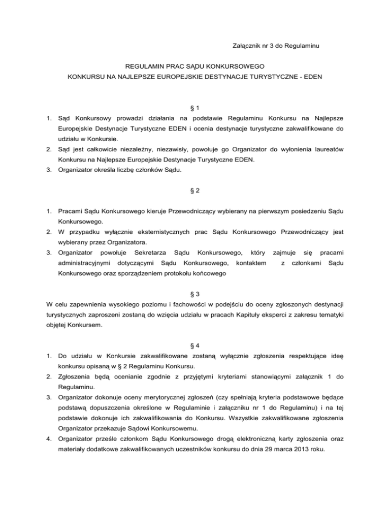 Załącznik nr 3 do Regulaminu REGULAMIN PRAC SĄDU KONKURSOWEGO KONKURSU NA NAJLEPSZE EUROPEJSKIE DESTYNACJE TURYSTYCZNE - EDEN §1 1. Sąd Konkursowy prowadzi działania na podstawie Regulaminu Konkursu na Najlepsze Europejskie Destynacje Turystyczne EDEN i ocenia destynacje turystyczne zakwalifikowane do udziału w Konkursie. 2. Sąd jest całkowicie niezaleŜny, niezawisły, powołuje go Organizator do wyłonienia laureatów Konkursu na Najlepsze Europejskie Destynacje Turystyczne EDEN. 3. Organizator określa liczbę członków Sądu. §2 1. Pracami Sądu Konkursowego kieruje Przewodniczący wybierany na pierwszym posiedzeniu Sądu Konkursowego. 2. W przypadku wyłącznie eksternistycznych prac Sądu Konkursowego Przewodniczący jest wybierany przez Organizatora. 3. Organizator powołuje administracyjnymi Sekretarza dotyczącymi Sądu Sądu Konkursowego, Konkursowego, który kontaktem zajmuje z się pracami członkami Sądu Konkursowego oraz sporządzeniem protokołu końcowego §3 W celu zapewnienia wysokiego poziomu i fachowości w podejściu do oceny zgłoszonych destynacji turystycznych zaproszeni zostaną do wzięcia udziału w pracach Kapituły eksperci z zakresu tematyki objętej Konkursem. §4 1. Do udziału w Konkursie zakwalifikowane zostaną wyłącznie zgłoszenia respektujące ideę konkursu opisaną w § 2 Regulaminu Konkursu. 2. Zgłoszenia będą ocenianie zgodnie z przyjętymi kryteriami stanowiącymi załącznik 1 do Regulaminu. 3. Organizator dokonuje oceny merytorycznej zgłoszeń (czy spełniają kryteria podstawowe będące podstawą dopuszczenia określone w Regulaminie i załączniku nr 1 do Regulaminu) i na tej podstawie dokonuje ich zakwalifikowania do Konkursu. Wszystkie zakwalifikowane zgłoszenia Organizator przekazuje Sądowi Konkursowemu. 4. Organizator prześle członkom Sądu Konkursowego drogą elektroniczną karty zgłoszenia oraz materiały dodatkowe zakwalifikowanych uczestników konkursu do dnia 29 marca 2013 roku. 5. Członkowie Sądu Konkursowego ocenią poszczególne zgłoszenia na dostarczonych im drogą elektroniczną kartach ocen oraz odeślą drogą elektroniczną wypełnione i podpisane karty ocen do dnia 08 kwietnia 2013 roku. 6. Zakończenie prac Sądu Konkursowego i wyłonienie laureatów nastąpi 11 kwietnia 2013 roku §5 1. W przypadku, gdy członek Sądu Konkursowego z przyczyn niezaleŜnych nie moŜe podjąć się oceny zgłoszeń, ma on prawo (po poinformowaniu Organizatora) do wskazania swojego zastępcy, który przejmuje prawo głosu członka Sądu Konkursowego. 2. W swojej pracy członkowie Sądu Konkursowego opierają się na dokumentacji dostarczonej przez Organizatora, a takŜe bazują na własnej wiedzy i doświadczeniu. 3. Członkowie Sądu Konkursowego nie mogą osobiście kontaktować się z uczestnikami Konkursu dla uzyskania dodatkowych informacji lub wyjaśnień. Wszelkich informacji dotyczących zasad przeprowadzania Konkursu, jego przebiegu i formularzy udziela Organizator. §6 1. Zadaniem Sądu Konkursowego będzie dokonanie oceny zgłoszonych destynacji i wybór najlepszej. Przy dokonywaniu oceny i wyborze Sąd Konkursowy będzie stosował następujące zasady: a) Stosowana będzie ocena punktowa zgłoszonych destynacji - zgodnie z punktacją określoną w kryteriach Konkursu. b) Tytuł najlepszej uzyska destynacja, która otrzymała największą liczbę punktów. c) W przypadku równej liczby punktów o rozstrzygnięciu zadecyduje Przewodniczący Sądu Konkursowego. 2. Po zakończeniu oceny Sekretarz Sądu Konkursowego przygotuje oficjalny protokół z wynikami, który jest podawany do wiadomości publicznej podczas oficjalnego rozstrzygnięcia Konkursu z udziałem laureatów, gości, partnerów Konkursu oraz mediów. 3. W protokole Sąd Konkursowy podaje liczbę punktów uzyskanych przez poszczególne destynacje zgłoszone do udziału Konkursie. 4. Oficjalny protokół z wynikami Konkursu stanowi podstawę do wręczenia nagród. Wymagany jest podpis przewodniczącego Sądu Konkursowego i wszystkich członków biorących udział w ocenie prac konkursowych. 5. W przypadku stwierdzenia raŜąco niskiego poziomu zgłoszonej kandydatury Sądowi Konkursowemu przysługuje prawo wydania oceny negatywnej, co oznacza wyeliminowanie zgłoszenia z Konkursu. Na wniosek co najmniej 2 członków Sądu Konkursowego o wydanie oceny negatywnej dla kandydatury o raŜąco niskim poziomie Przewodniczący Sądu podejmuje decyzję o wyeliminowaniu zgłoszenia. §7 Członek Sądu Konkursowego ma obowiązek wycofać się z udziału w pracach Sądu, gdy nabiera przeświadczenia, Ŝe zachodzą okoliczności mogące podwaŜyć bezstronność jego oceny. §8 1. Członkowie Sądu Konkursowego są zobowiązani do zachowania ścisłej tajemnicy w sprawach dotyczących przebiegu prac Sądu Konkursowego i ostatecznych wyników Konkursu. 2. Wszystkie Karty Zgłoszenia i materiały dodatkowe dostarczone do Organizatora Konkursu i przekazane Sądowi Konkursowemu jego członkowie winni traktować jako poufne.