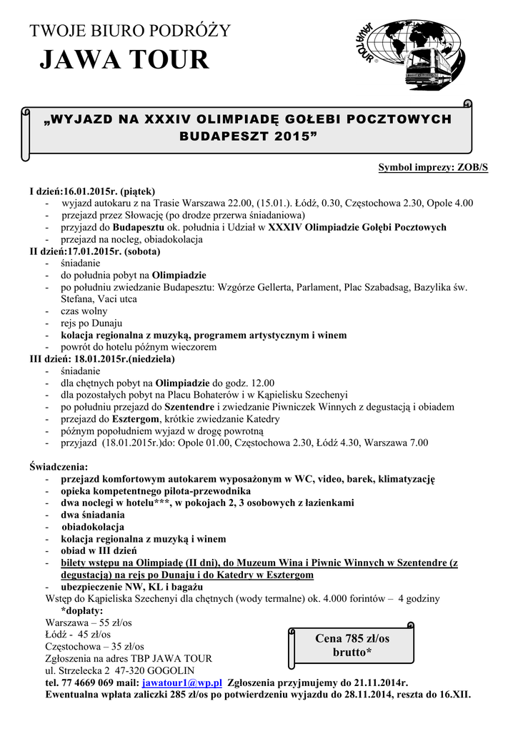 TWOJE BIURO PODRÓŻY JAWA TOUR „WYJAZD NA XXXIV OLIMPIADĘ GOŁEBI POCZTOWYCH BUDAPESZT 2015” Symbol imprezy: ZOB/S I dzień:16.01.2015r. (piątek) - wyjazd autokaru z na Trasie Warszawa 22.00, (15.01.). Łódź, 0.30, Częstochowa 2.30, Opole 4.00 - przejazd przez Słowację (po drodze przerwa śniadaniowa) - przyjazd do Budapesztu ok. południa i Udział w XXXIV Olimpiadzie Gołębi Pocztowych - przejazd na nocleg, obiadokolacja II dzień:17.01.2015r. (sobota) - śniadanie - do południa pobyt na Olimpiadzie - po południu zwiedzanie Budapesztu: Wzgórze Gellerta, Parlament, Plac Szabadsag, Bazylika św. Stefana, Vaci utca - czas wolny - rejs po Dunaju - kolacja regionalna z muzyką, programem artystycznym i winem - powrót do hotelu późnym wieczorem III dzień: 18.01.2015r.(niedziela) - śniadanie - dla chętnych pobyt na Olimpiadzie do godz. 12.00 - dla pozostałych pobyt na Placu Bohaterów i w Kąpielisku Szechenyi - po południu przejazd do Szentendre i zwiedzanie Piwniczek Winnych z degustacją i obiadem - przejazd do Esztergom, krótkie zwiedzanie Katedry - późnym popołudniem wyjazd w drogę powrotną - przyjazd (18.01.2015r.)do: Opole 01.00, Częstochowa 2.30, Łódź 4.30, Warszawa 7.00 Świadczenia: - przejazd komfortowym autokarem wyposażonym w WC, video, barek, klimatyzację - opieka kompetentnego pilota-przewodnika - dwa noclegi w hotelu***, w pokojach 2, 3 osobowych z łazienkami - dwa śniadania - obiadokolacja - kolacja regionalna z muzyką i winem - obiad w III dzień - bilety wstępu na Olimpiadę (II dni), do Muzeum Wina i Piwnic Winnych w Szentendre (z degustacją) na rejs po Dunaju i do Katedry w Esztergom - ubezpieczenie NW, KL i bagażu Wstęp do Kąpieliska Szechenyi dla chętnych (wody termalne) ok. 4.000 forintów – 4 godziny *dopłaty: Warszawa – 55 zł/os Łódź - 45 zł/os Cena 785 zł/os Częstochowa – 35 zł/os brutto* Zgłoszenia na adres TBP JAWA TOUR ul. Strzelecka 2 47-320 GOGOLIN tel. 77 4669 069 mail: [email protected] Zgłoszenia przyjmujemy do 21.11.2014r. Ewentualna wpłata zaliczki 285 zł/os po potwierdzeniu wyjazdu do 28.11.2014, reszta do 16.XII.
