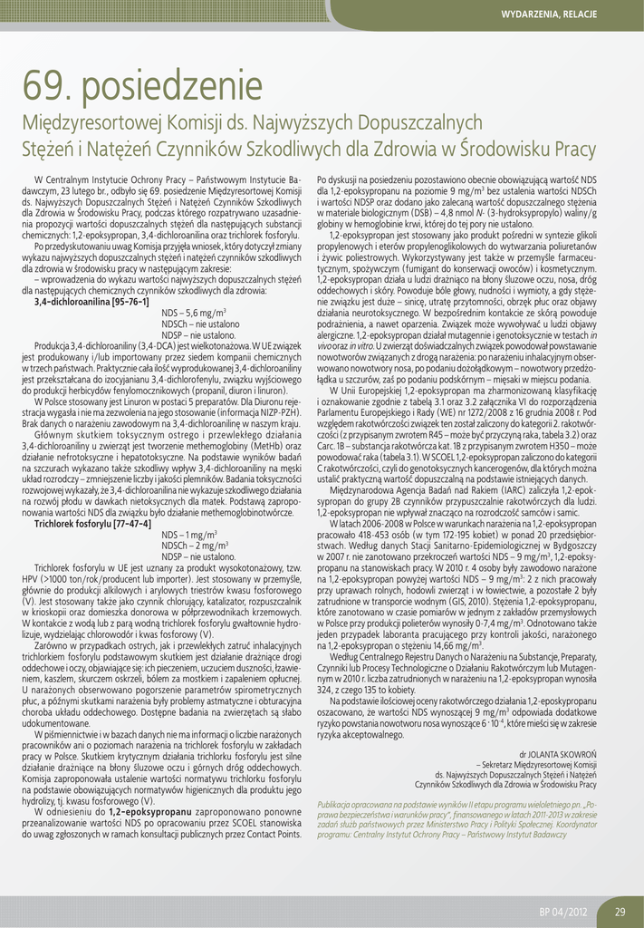 WYDARZENIA, RELACJE 69. posiedzenie Miêdzyresortowej Komisji ds. Najwy¿szych Dopuszczalnych Stê¿eñ i Natê¿eñ Czynników Szkodliwych dla Zdrowia w Środowisku Pracy W Centralnym Instytucie Ochrony Pracy – Pañstwowym Instytucie Badawczym, 23 lutego br., odby³o siê 69. posiedzenie Miêdzyresortowej Komisji ds. Najwy¿szych Dopuszczalnych Stê¿eñ i Natê¿eñ Czynników Szkodliwych dla Zdrowia w Środowisku Pracy, podczas którego rozpatrywano uzasadnienia propozycji wartości dopuszczalnych stê¿eñ dla nastêpuj¹cych substancji chemicznych: 1,2-epoksypropan, 3,4-dichloroanilina oraz trichlorek fosforylu. Po przedyskutowaniu uwag Komisja przyjê³a wniosek, który dotyczy³ zmiany wykazu najwy¿szych dopuszczalnych stê¿eñ i natê¿eñ czynników szkodliwych dla zdrowia w środowisku pracy w nastêpuj¹cym zakresie: – wprowadzenia do wykazu wartości najwy¿szych dopuszczalnych stê¿eñ dla nastêpuj¹cych chemicznych czynników szkodliwych dla zdrowia: 3,4-dichloroanilina [95-76-1] NDS – 5,6 mg/m3 NDSCh – nie ustalono NDSP – nie ustalono. Produkcja 3,4-dichloroaniliny (3,4-DCA) jest wielkotona¿owa. W UE zwi¹zek jest produkowany i/lub importowany przez siedem kompanii chemicznych w trzech pañstwach. Praktycznie ca³a ilośæ wyprodukowanej 3,4-dichloroaniliny jest przekszta³cana do izocyjanianu 3,4-dichlorofenylu, zwi¹zku wyjściowego do produkcji herbicydów fenylomocznikowych (propanil, diuron i linuron). W Polsce stosowany jest Linuron w postaci 5 preparatów. Dla Diuronu rejestracja wygas³a i nie ma zezwolenia na jego stosowanie (informacja NIZP-PZH). Brak danych o nara¿eniu zawodowym na 3,4-dichloroanilinê w naszym kraju. G³ównym skutkiem toksycznym ostrego i przewlek³ego dzia³ania 3,4-dichloroaniliny u zwierz¹t jest tworzenie methemoglobiny (MetHb) oraz dzia³anie nefrotoksyczne i hepatotoksyczne. Na podstawie wyników badañ na szczurach wykazano tak¿e szkodliwy wp³yw 3,4-dichloroaniliny na mêski uk³ad rozrodczy – zmniejszenie liczby i jakości plemników. Badania toksyczności rozwojowej wykaza³y, ¿e 3,4-dichloroanilina nie wykazuje szkodliwego dzia³ania na rozwój p³odu w dawkach nietoksycznych dla matek. Podstaw¹ zaproponowania wartości NDS dla zwi¹zku by³o dzia³anie methemoglobinotwórcze. Trichlorek fosforylu [77-47-4] NDS – 1 mg/m3 NDSCh – 2 mg/m3 NDSP – nie ustalono. Trichlorek fosforylu w UE jest uznany za produkt wysokotona¿owy, tzw. HPV (>1000 ton/rok/producent lub importer). Jest stosowany w przemyśle, g³ównie do produkcji alkilowych i arylowych triestrów kwasu fosforowego (V). Jest stosowany tak¿e jako czynnik chloruj¹cy, katalizator, rozpuszczalnik w krioskopii oraz domieszka donorowa w pó³przewodnikach krzemowych. W kontakcie z wod¹ lub z par¹ wodn¹ trichlorek fosforylu gwa³townie hydrolizuje, wydzielaj¹c chlorowodór i kwas fosforowy (V). Zarówno w przypadkach ostrych, jak i przewlek³ych zatruæ inhalacyjnych trichlorkiem fosforylu podstawowym skutkiem jest dzia³anie dra¿ni¹ce drogi oddechowe i oczy, objawiaj¹ce siê: ich pieczeniem, uczuciem duszności, ³zawieniem, kaszlem, skurczem oskrzeli, bólem za mostkiem i zapaleniem op³ucnej. U nara¿onych obserwowano pogorszenie parametrów spirometrycznych p³uc, a późnymi skutkami nara¿enia by³y problemy astmatyczne i obturacyjna choroba uk³adu oddechowego. Dostêpne badania na zwierzêtach s¹ s³abo udokumentowane. W piśmiennictwie i w bazach danych nie ma informacji o liczbie nara¿onych pracowników ani o poziomach nara¿enia na trichlorek fosforylu w zak³adach pracy w Polsce. Skutkiem krytycznym dzia³ania trichlorku fosforylu jest silne dzia³anie dra¿ni¹ce na b³ony śluzowe oczu i górnych dróg oddechowych. Komisja zaproponowa³a ustalenie wartości normatywu trichlorku fosforylu na podstawie obowi¹zuj¹cych normatywów higienicznych dla produktu jego hydrolizy, tj. kwasu fosforowego (V). W odniesieniu do 1,2-epoksypropanu zaproponowano ponowne przeanalizowanie wartości NDS po opracowaniu przez SCOEL stanowiska do uwag zg³oszonych w ramach konsultacji publicznych przez Contact Points. Po dyskusji na posiedzeniu pozostawiono obecnie obowi¹zuj¹c¹ wartośæ NDS dla 1,2-epoksypropanu na poziomie 9 mg/m3 bez ustalenia wartości NDSCh i wartości NDSP oraz dodano jako zalecan¹ wartośæ dopuszczalnego stê¿enia w materiale biologicznym (DSB) – 4,8 nmol N- (3-hydroksypropylo) waliny/g globiny w hemoglobinie krwi, której do tej pory nie ustalono. 1,2-epoksypropan jest stosowany jako produkt pośredni w syntezie glikoli propylenowych i eterów propylenoglikolowych do wytwarzania poliuretanów i ¿ywic poliestrowych. Wykorzystywany jest tak¿e w przemyśle farmaceutycznym, spo¿ywczym (fumigant do konserwacji owoców) i kosmetycznym. 1,2-epoksypropan dzia³a u ludzi dra¿ni¹co na b³ony śluzowe oczu, nosa, dróg oddechowych i skóry. Powoduje bóle g³owy, nudności i wymioty, a gdy stê¿enie zwi¹zku jest du¿e – sinicê, utratê przytomności, obrzêk p³uc oraz objawy dzia³ania neurotoksycznego. W bezpośrednim kontakcie ze skór¹ powoduje podra¿nienia, a nawet oparzenia. Zwi¹zek mo¿e wywo³ywaæ u ludzi objawy alergiczne. 1,2-epoksypropan dzia³a³ mutagennie i genotoksycznie w testach in vivo oraz in vitro. U zwierz¹t doświadczalnych zwi¹zek powodowa³ powstawanie nowotworów zwi¹zanych z drog¹ nara¿enia: po nara¿eniu inhalacyjnym obserwowano nowotwory nosa, po podaniu do¿o³¹dkowym – nowotwory przed¿o³¹dka u szczurów, zaś po podaniu podskórnym – miêsaki w miejscu podania. W Unii Europejskiej 1,2-epoksypropan ma zharmonizowan¹ klasyfikacjê i oznakowanie zgodnie z tabel¹ 3.1 oraz 3.2 za³¹cznika VI do rozporz¹dzenia Parlamentu Europejskiego i Rady (WE) nr 1272/2008 z 16 grudnia 2008 r. Pod wzglêdem rakotwórczości zwi¹zek ten zosta³ zaliczony do kategorii 2. rakotwórczości (z przypisanym zwrotem R45 – mo¿e byæ przyczyn¹ raka, tabela 3.2) oraz Carc. 1B – substancja rakotw