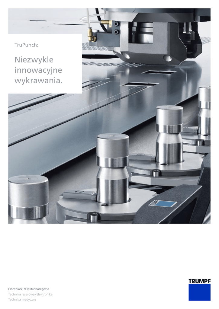 TruPunch: Niezwykle innowacyjne wykrawania. Obrabiarki / Elektronarzędzia Technika laserowa / Elektronika Technika medyczna Wydajność jedyna w swoim rodzaju. Spis treści Wydajność jedyna w swoim rodzaju. 2 Wykrawarki młoteczkowe TruPunch firmy TRUMPF zapewniają Państwu elastyczne możliwości w zakresie obrabianych detali. Dlaczego TruPunch przekonują. 4 Różnorodne możliwości zastosowań obejmują wytwarzanie prostych jak i skomplikowanych detali, z licznymi przeformo- Przemyślane wykrawanie. 6 waniami i z zachowaniem doskonałej jakości obrabianych powierzchni i krawędzi. Dzięki temu mogą Państwo obrabiać od Elastyczność bez ograniczeń. 7 początku do końca różnorodne detale na jednej maszynie. TruPunch 1000 8 Wykrawarki młoteczkowe TruPunch pracują nadzwyczaj ekonomicznie i wydajnie. Koncentrujemy się właśnie na eko- TruPunch 3000 12 nomicznym wykorzystywaniu energii i materiałów. Duży wybór wysokiej jakości narzędzi wykrawających własnej pro- TruPunch 5000 16 Komponenty, które się opłacą. 20 dukcji dopełnia naszą ofertę. Oprogramowanie: Zaprogramowany na sukces. 22 TruServices: Serwis jak żaden inny. 2 23 TruPunch: Zalety w skrócie. 1 Ekonomiczne wykorzystanie materiałów. 2 Wykrawanie, przeformowywanie i usuwanie gradu (na jednej maszynie). 3 Pełna elastyczność narzędzi. 4 Zachowanie jakości we wszystkich aplikacjach. 5 Indywidualna automatyzacja. TruPunch 1000 Ekonomiczna maszyna dla firm, kóre rozpoczynają obróbkę w zakresie wykrawania. Uniwersalna maszyna zapewnia Państwu optymalne rozpoczęcie obróbki w dziedzinie wykra wania. Jest bardzo łatwa w obsłudze, ekonomiczna i zajmuje niewiele miejsca. TruPunch 3000 Maszyna uniwersalna ekonomicznie wykorzystująca materiały. TruPunch 3000 do obróbki bez odpadu jako pierwsza maszyna na świecie pozwala na oszczędność materiału rzędu 10 %. Przemyślana automatyzacja gwarantuje najwyższy komfort pracy. TruPunch 5000 Produktywna maszyna zaawansowana technologicznie. TruPunch 5000 jest liderem w zakresie wydajności i jakości detali. Maksymalne możliwości formowania i indywidualna automatyzacja zapewniają różnorodność zastosowań. Także na tej maszynie mogą Państwo prowadzić bezodpadową obróbkę materiału. Chcemy pracować ekonomicznie i odpowiedzialnie. Dlatego wykorzystujemy materiały w rozsądny sposób. Obróbka bez odpadu zwiększa wykorzystanie powierzchni arkusza przeciętnie o 10 % i obniża przy tym koszty materiałowe. Wykrawarki TruPunch zapewniają doskonały bilans energetyczny dzięki odpowiedniemu zastosowaniu napędów: hydraulicznego i elektrycznego. Niskie zużycie sprężonego powietrza, materiałów i energii elektrycznej pozwala na efektywną produkcję. Wiecej informacji na temat efficiency+ pod adresem: www.trumpf.com/efficiencyplus 3 Dlaczego TruPunch przekonuje. Wytwarzanie standardowych konturów i przetłoczeń przy pomocy głowicy wykrawającej. Wykrawanie w trzech wymiarach. Przy pomocy głowicy wykrawającej możliwe jest wykrawanie otworów i wykonywanie trójwymiarowych konturów, takich jak zakładki czy gwinty. W ten sposób prowadzą Państwo kompletną obróbkę tylko na jednej maszynie. Elastyczność i ekonomiczność dzięki rotacji narzędzia o 360°. Nieograniczone możliwości formowania. Szybka obróbka. Pierwszorzędna jakość wykrawanych konturów. Łatwe przezbrajanie maszyny. Stabilność procesów i wygodny dostęp do maszyny. Konstrukcja wszystkich maszyn TruPunch oparta jest na ramie w kształcie litery C. W ten sposób zarówno maszyna, jak i obrabiany detal są dostępne z trzech stron. Pozostawia to dostatecznie dużo miejsca na podawanie i odbieranie detali z maszyny – ręcznie bądź automatycznie. Wysoka stabilność procesów maszyny zapewnia dokładną obróbkę bez zadrapań na powierzchni detali. Dostęp do maszyny z trzech stron. Wysoka dokładność. Obróbka bez zadrapań. Szybki odbiór detali przez zsuwnie. Komponenty automatyzacji. 4 Elastyczność narzędzi wykrawających. Firma TRUMPF to od 40 lat synonim jakości wytwarzanych narzędzi wykrawających: oferujemy Państwu największe spektrum oryginalnych narzędzi na rynku. Narzędzia wykrawające: firma TRUMPF oferuje do każ- Narzędzia do zastosowań specjalnych: oferujemy dej geometrii czy krawędzi cięcia odpowiednie narzędzie. odpowiednie narzędzia również do specjalistycznej obróbki, Narzędzia formujące: w procesie obróbki plastycznej blachy można formować na niej różnorodne elementy. Narzędzia formujące TRUMPF umożliwiają kompletną obróbkę arkusza blachy. Przy pomocy narzędzi – wielkość 5 – mogą Państwo dodatkowo wykonywać przetłoczenia o większych wymiarach. Narzędzia rolkowe: technika rolkowa pozwala na wyjątkowo szybkie formowanie lub rozdzielanie blachy. Co więcej, dzięki osi obrotu 360° możliwe jest wykonanie niemalże każdego konturu. Narzędzia do opisywania i znakowania: numer serii, rok produkcji lub logo firmy – specjalne narzędzia naniosą je na powierzchni blachy szybko i sprawnie. jak na przykład usuwanie zadziorów w celu uzyskania idealnych krawędzi. Nasi specjaliści wykonają narzędzia wykrawające dopasowane do indywidualnych potrzeb klienta. Dzięki własnej produkcji narzędzi i solidnym testom gwarantujemy najwyższą jakość. Zamówienie realizujemy w ciągu kilku dni. Akcesoria wykrawające: akcesoria wykrawające ułatwiają zbrojenie i konserwację oraz przedłużają okres żywotności Państwa narzędzi. Dokładnie nastawione i regularnie szlifowane narzędzia wykrawające osiągają optymalne wyniki. Zintegrowany system zarządzania narzędziami: wszystkie narzędzia zawsze pod ręką. System ułatwia proces przezbrajania i dobór narzędzi. Więcej na temat narzędzi wykrawających i akcesoriów dowiesz się pod adresem www.de.trumpf.comtrumpf-machines.com/services Narzędzia do usuwania gradu Narzędzie do usuwania gradu MultiTool 5 Przemyślane wykrawan