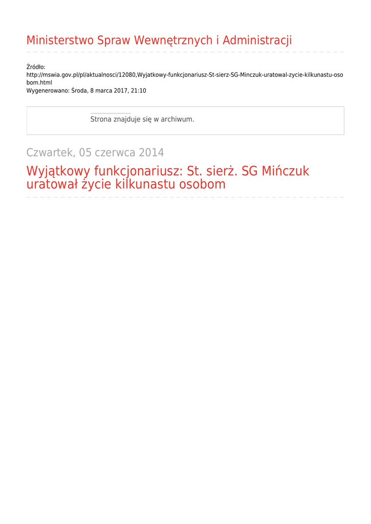 Ministerstwo Spraw Wewnętrznych i Administracji Źródło: http://mswia.gov.pl/pl/aktualnosci/12080,Wyjatkowy-funkcjonariusz-St-sierz-SG-Minczuk-uratowal-zycie-kilkunastu-oso bom.html Wygenerowano: Środa, 8 marca 2017, 21:10 Strona znajduje się w archiwum. Czwartek, 05 czerwca 2014 Wyjątkowy funkcjonariusz: St. sierż. SG Mińczuk uratował życie kilkunastu osobom - Wracałem z patrolu z koleżanką ze Straży Granicznej. Nagle zobaczyliśmy, że kierowca autobusu zachowuje się nienaturalnie. Ruszyliśmy w jego kierunku. Nim zdążyliśmy podejść, pojazd, którym jechaliśmy, uderzył z ogromną siłą w drzewo – wspomina st. sierż. SG Mariusz Mińczuk z Placówki Straży Granicznej w Węgorzewie. – Kilka osób zostało ciężko rannych. Musieliśmy im udzielić pomocy. Było naprawdę trudno – dodaje. Wieloletnie doświadczenie w Mazurskim Ochotniczym Pogotowiu Ratunkowym pozwoliło mu zachować zimną krew. Ratownikowi wiele zawdzięczają nie tylko uczestnicy tego wypadku. Mężczyzna uratował życie kilkunastu innym osobom, a jego zasługi docenił sam prezydent Lech Kaczyński. Przedstawiamy kolejną odsłonę z cyklu „Wyjątkowy funkcjonariusz”. – Z przyzwyczajenia noszę przy sobie podstawowe opatrunki i rękawice. Nigdy nie wiadomo, co może się wydarzyć – mówi st. sierż. SG Mariusz Mińczuk. Tak jak podczas pieszego patrolu przy granicy. Wraz z koleżanką po fachu wracali autobusem z terenu. Gdy zobaczyli, że kierowca autobusu źle się poczuł, postanowili od razu interweniować. Nagle pojazd uderzył w drzewo. – Mnie udało się uniknąć obrażeń. Koleżanka uderzyła w fotel. Na szczęście były to tylko niegroźne potłuczenia. Gorzej było z pasażerami. Kilku z nich było naprawdę ciężko rannych – wspomina wydarzenia z 2010 roku sierż. Mińczuk. Natychmiast wezwał pomoc i zajął się poszkodowanymi. – Musieliśmy zabezpieczyć kilkoro najciężej rannych. Kierowca wkrótce odzyskał przytomność. Pasażerowie byli przestraszeni, jedna z kobiet głośno płakała. Było naprawdę trudno - opowiada funkcjonariusz. Podkreśla, że był to dla niego poważny sprawdzian. - Masowy wypadek – tego nie było nawet na szkoleniach, a musiałem sobie poradzić – mówi. Dodaje, że jest wdzięczny koleżance z patrolu, bo choć nie była ratownikiem, nie spanikowała. Równie mocno zaangażowała się w pomoc poszkodowanym aż do przyjazdu ratowników medycznych. - Bo to tak już jest, że znajduję się we właściwym miejscu i o właściwej porze – mówi. Tak też było, gdy podczas innego patrolu pomógł mężczyźnie, który przewrócił się na ulicy. – To było niebezpieczne miejsce, na wzgórzu. Najpierw trzeba było zadbać o bezpieczeństwo, a później udzielić pomocy – opowiada. Dodaje, że mężczyzna stracił przytomność, mocno krwawił, Bo to tak już jest, że znajduję się we właściwym miejscu i o właściwej porze st. sierż. SG Mariusz Mińczuk dławił się krwią. Pomoc przyszła w porę. Przeżył. Mazurski ratownik Mariusz Mińczuk od wielu lat ochotniczo i zawodowo pomaga innym. Szczególnie na mazurskich jeziorach, które zna już od podszewki. – Zaraził mnie tym mój tato. To on zabierał mnie nad wodę. Pracuje na co dzień w Mazurskim Ochotniczym Pogotowiu Ratunkowym w Stacji Ratowniczej w Skłodowie. Niedawno obchodziliśmy 15-lecie działalności MOPR na Wielkich Jeziorach Mazurskich. Dodaje, że stacja ratownicza w Skłodowie to jak drugi dom.. – Tata jest ratownikiem, siostra i szwagier też tam pracują. Ja angażuję się ochotniczo, odkąd wstąpiłem do straży– dodaje. Wiele wysiłku kosztuje go godzenie dwóch służb. Wie jednak, że warto. – Satysfakcji z pomocy innym nie da się niczym zastąpić – odpowiada. Wspomina wtorek 21 sierpnia 2007 roku. Te dwa słowa na Mazurach to metafora tragedii. Zaczęło się od nagłego, porywistego wiatru. Potem zimny deszcz, grad i coraz większe fale na jeziorach. Zazwyczaj spokojna tafla wody zamienia się w śmiercionośny żywioł, który jakby bez wysiłku pokonywał kolejne łódki. - Wszystko działo się tak szybko. Byłem wtedy sternikiem wodnej karetki wypadkowej. Pamiętam widok tych łódek, która jedna przez drugą przewracały się na jeziorze. Widziałem ludzi pływających wokół nich w wodzie. Już z daleka modliłem się, żeby nikt nie był uwięziony pod łódką – wspomina dramatyczne wydarzenia st. sierż. SG Mińczuk. Najbardziej bał się, że będzie trzeba organizować akcję wchodzenia pod wodę, by ratować ludzi uwięzionych pod spodem. – Miałem na pokładzie samych ratowników medycznych. Według przepisów nie mogłem ich zostawić i wejść do wody – opowiada. Serce waliło mu jak młot, a w głowie rozgrywał się dylemat. Gdy tylko podpływał, dopytywał, czy wszyscy są wokół łódki. Całe szczęście, że byli. Po chwili zobaczył też za sobą nadpływającą pomoc ratowników wodnych. Najbardziej wzruszył go jednak uratowany kilkuletni chłopiec. – Miał może 7-8 lat. Trzymał się koła ratunkowego i trząsł z zimna. Gdy byłem już bardzo blisko, powiedziałem, by puścił się jedną ręką i mi ją podał. Chłopiec poczuł się już tak pewnie w naszej obecności, że puścił dwie. W sekundzie poszedł pod wodę. Szybko wychyliłem się i złapałem malca. Zachłysnął się wodą. Zmarzniętego zaprowadziłem do kabiny. Pytam: „wszystko ok?” Jego twarz złagodniała. „Ok. A jak szybko ta motorówka pływa?” – zapytał mnie. Uśmiechnąłem się. Wiedziałem, że z chłopcem wszystko dobrze – opowiada st. sierż. SG Mińczuk. Zaangażowanie i odwaga W trakcie tych wspomnień skupia się na detalach, obrazkach, które utkwiły mu w pamięci. Dopiero zapytany o liczbę uratowanych tego dnia osób przyznaje, że było ich sporo. – Dorośli, dzieci, okoliczni mieszkańcy i cudzoziemcy –wymienia. Wśród nich 17 tych, którzy właśnie st. sierż. SG Mińczukowi zaw