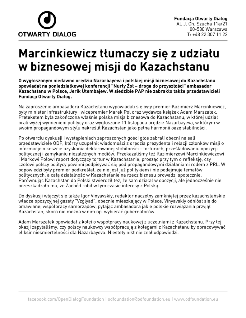 Fundacja Otwarty Dialog Al. J. Ch. Szucha 11a/21 00-580 Warszawa T: +48 22 307 11 22 Marcinkiewicz tłumaczy się z udziału w biznesowej misji do Kazachstanu O wygłoszonym niedawno orędziu Nazarbayeva i polskiej misji biznesowej do Kazachstanu opowiadał na poniedziałkowej konferencji "Nurły Żoł – droga do przyszłości" ambasador Kazachstanu w Polsce, Jerik Utembajew. W siedzibie PAP nie zabrakło także przedstawicieli Fundacji Otwarty Dialog. Na zaproszenie ambasadora Kazachstanu wypowiadali się były premier Kazimierz Marcinkiewicz, były minister infrastruktury i wicepremier Marek Pol oraz wydawca książek Adam Marszałek. Pretekstem była zakończona właśnie polska misja biznesowa do Kazachstanu, w której udział brali wyżej wymienieni politycy oraz wygłoszone 11 listopada orędzie Nazarbayeva, w którym w swoim propagandowym stylu nakreślił Kazachstan jako pełną harmonii oazę stabilności. Po otwarciu dyskusji i wystąpieniach zaproszonych gości głos zabrali obecni na sali przedstawiciele ODF, którzy uzupełnił wiadomości z orędzia prezydenta i relacji członków misji o informacje o koszcie uzyskania deklarowanej stabilności - torturach, prześladowaniu opozycji politycznej i zamykaniu niezależnych mediów. Przekazaliśmy też Kazimierzowi Marcinkiewiczowi i Markowi Polowi raport dotyczący tortur w Kazachstanie, prosząc przy tym o refleksję, czy czołowi polscy politycy powinni podpisywać się pod propagandowymi działaniami rodem z PRL. W odpowiedzi były premier podkreślał, że nie jest już politykiem i nie podejmuje tematów politycznych, a całą działalność w Kazachstanie na rzecz biznesu prowadzi społecznie. Porównując Kazachstan do Polski stwierdził też, że sam działał w opozycji, ale jednocześnie nie przeszkadzało mu, że Zachód robił w tym czasie interesy z Polską. Do dyskusji włączył się także Igor Vinyavskiy, redaktor naczelny zamkniętej przez kazachstańskie władze opozycyjnej gazety "Vzglyad", obecnie mieszkający w Polsce. Vinyavskiy odniósł się do omawianej współpracy samorządów, pytając ambasadora jakie polskie rozwiązania przyjął Kazachstan, skoro nie można w nim np. wybierać gubernatorów. Adam Marszałek opowiadał z kolei o współpracy naukowej z uczelniami z Kazachstanu. Przy tej okazji zapytaliśmy, czy polscy naukowcy współpracują z kolegami z Kazachstanu by opracowywać eliksir nieśmiertelności dla Nazarbayeva. Niestety nikt nie znał odpowiedzi. facebook.com/OpenDialogFoundation | [email protected] | www.odfoundation.eu