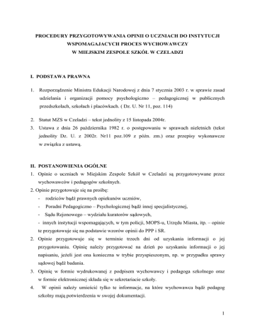 PROCEDURY PRZYGOTOWYWANIA OPINII O UCZNIACH DO INSTYTUCJI WSPOMAGAJACYCH PROCES WYCHOWAWCZY W MIEJSKIM ZESPOLE SZKÓŁ W CZELADZI I. PODSTAWA PRAWNA 1. Rozporządzenie Ministra Edukacji Narodowej z dnia 7 stycznia 2003 r. w sprawie zasad udzielania i organizacji pomocy psychologiczno – pedagogicznej w publicznych przedszkolach, szkołach i placówkach. ( Dz. U. Nr 11, poz. 114) 2. Statut MZS w Czeladzi – tekst jednolity z 15 listopada 2004r. 3. Ustawa z dnia 26 października 1982 r. o postępowaniu w sprawach nieletnich (tekst jednolity Dz. U. z 2002r. Nr11 poz.109 z późn. zm.) oraz przepisy wykonawcze w związku z ustawą. II. POSTANOWIENIA OGÓLNE 1. Opinie o uczniach w Miejskim Zespole Szkół w Czeladzi są przygotowywane przez wychowawców i pedagogów szkolnych. 2. Opinie przygotowuje się na prośbę: - rodziców bądź prawnych opiekunów uczniów, - Poradni Pedagogiczno – Psychologicznej bądź innej specjalistycznej, - Sądu Rejonowego – wydziału kuratorów sądowych, - innych instytucji wspomagających, w tym policji, MOPS-u, Urzędu Miasta, itp. – opinie te przygotowuje się na podstawie wzorów opinii do PPP i SR. 2. Opinie przygotowuje się w terminie trzech dni od uzyskania informacji o jej przygotowaniu. Opinię naleŜy przygotować na dzień po uzyskaniu informacji o jej napisaniu, jeŜeli jest ona konieczna w trybie przyspieszonym, np. w przypadku sprawy sądowej bądź badania. 3. Opinię w formie wydrukowanej z podpisem wychowawcy i pedagoga szkolnego oraz w formie elektronicznej składa się w sekretariacie szkoły. 4. W opinii naleŜy umieścić tylko te informacje, na które wychowawca bądź pedagog szkolny mają potwierdzenia w swojej dokumentacji. 1 III. POSTANOWIENIA SZCZEGÓŁOWE 1. Opinię do Sądu Rejonowego przygotowuje się według zamieszczonego poniŜej wzoru. Czeladź, dn. ……….. MZS -G1-…….-….…./2007 Sąd Rejonowy Sąd Rodzinny w Będzinie Sygn. akt. …………………………. Opinia dot. ucznia ( uczennicy ) …………………………………( imię i nazwisko ), urodzonego ( -ej ) …………… ( data urodzenia ), zamieszkałego ( -ej ) w ………………………….. ( adres zamieszkania ). 1. Dane dotyczące ucznia (w której jest klasie, czy ma opóźnienia edukacyjne, jak się uczy, itp.). 2. Zachowanie ucznia na terenie szkoły (czy sprawia kłopoty wychowawcze, czego one dotyczą). 3. Krótko nazwać problem, z którym zwracamy się do instytucji o pomoc (problemy w nauce, trudności wychowawcze, itp.) 4. Krótko umotywować, co szkoła zrobiła by pomóc uczniowi (uczennicy), jakie zastosowała procedury, metody oddziaływań 5. Kontakty ucznia z rówieśnikami (czy jest lubiany, akceptowany przez kolegów, koleŜanki). 6. Kontakty szkoły z domem rodzinnym (czy jest kontakt z rodzicami). Z powaŜaniem Wychowawca klasy 2 2. Opinię do Poradni Pedagogiczno – Psychologicznej i innej specjalistycznej – przygotowuje się według zamieszczonego poniŜej wzoru. Czeladź, dn. ……….. MZS -G1-…….-….…./2007 Poradnia Pedagogiczno – Psychologiczna w Czeladzi Opinia dot. ucznia ( uczennicy ) …………………………………( imię i nazwisko ), urodzonego ( -ej ) …………… ( data urodzenia ), zamieszkałego ( -ej ) w ………………………….. ( adres zamieszkania ). 1. Dane dotyczące ucznia (w której jest klasie, czy ma opóźnienia edukacyjne, jak się uczy, itp.). 2. Zachowanie ucznia na terenie szkoły (czy sprawia kłopoty wychowawcze, czego one dotyczą). 3. Krótko nazwać problem, z którym zwracamy się do instytucji o pomoc (problemy w nauce, trudności wychowawcze, itp.) 4. Krótko umotywować, co szkoła zrobiła by pomóc uczniowi (uczennicy), jakie zastosowała procedury, metody oddziaływań 5. Kontakty ucznia z rówieśnikami (czy jest lubiany, akceptowany przez kolegów, koleŜanki). 6. Kontakty szkoły z domem rodzinnym ( czy jest kontakt z rodzicami ). Z powaŜaniem Wychowawca klasy Procedurę opracowała pedagog szkolny mgr Agnieszka Szkutnik 3
