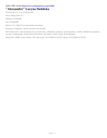 Adres URL strony http://www.urodaizdrowie.org/21005 "Alessandro" Lucyna Sieklicka Poznań, 60-111, woj. wielkopolskie Ulica: Głogowska 217 Telefon: 618302205 Fax: 618302205 Strona www: http://www.alessandro.poznan.pl Kategorie: Gabinety i salony kosmetyczne Poznań Słowa kluczowe: salon kosmetyczny poznań, tipsy, zakładanie, pedicure, profesjonalnie, cellulit, zdobnictwo paznokci, spa nail, wielkopolska, hurtownia kosmetyków, alessandro, pedix, dome, la biosthetique Numer ID: 21005, liczba odsłon: 226, aktywacja: 16/12/2010 16:49:30, edycja: 16/12/2010 16:49:30 Strona 1 / 1
