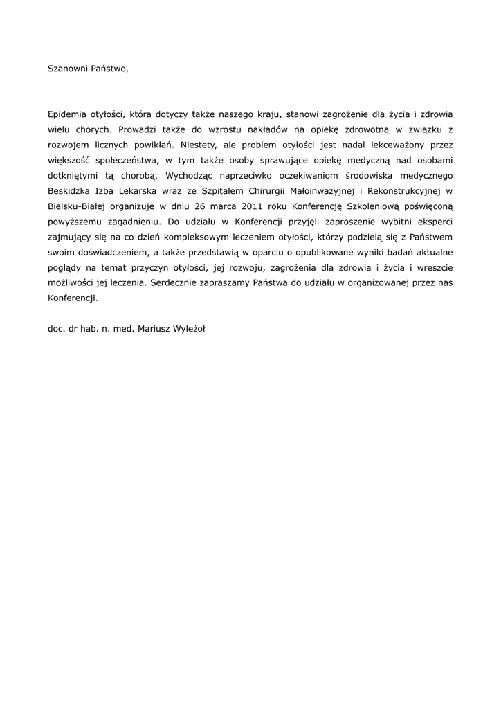 Szanowni Państwo, Epidemia otyłości, która dotyczy także naszego kraju, stanowi zagrożenie dla życia i zdrowia wielu chorych. Prowadzi także do wzrostu nakładów na opiekę zdrowotną w związku z rozwojem licznych powikłań. Niestety, ale problem otyłości jest nadal lekceważony przez większość społeczeństwa, w tym także osoby sprawujące opiekę medyczną nad osobami dotkniętymi tą chorobą. Wychodząc naprzeciwko oczekiwaniom środowiska medycznego Beskidzka Izba Lekarska wraz ze Szpitalem Chirurgii Małoinwazyjnej i Rekonstrukcyjnej w Bielsku-Białej organizuje w dniu 26 marca 2011 roku Konferencję Szkoleniową poświęconą powyższemu zagadnieniu. Do udziału w Konferencji przyjęli zaproszenie wybitni eksperci zajmujący się na co dzień kompleksowym leczeniem otyłości, którzy podzielą się z Państwem swoim doświadczeniem, a także przedstawią w oparciu o opublikowane wyniki badań aktualne poglądy na temat przyczyn otyłości, jej rozwoju, zagrożenia dla zdrowia i życia i wreszcie możliwości jej leczenia. Serdecznie zapraszamy Państwa do udziału w organizowanej przez nas Konferencji. doc. dr hab. n. med. Mariusz Wyleżoł