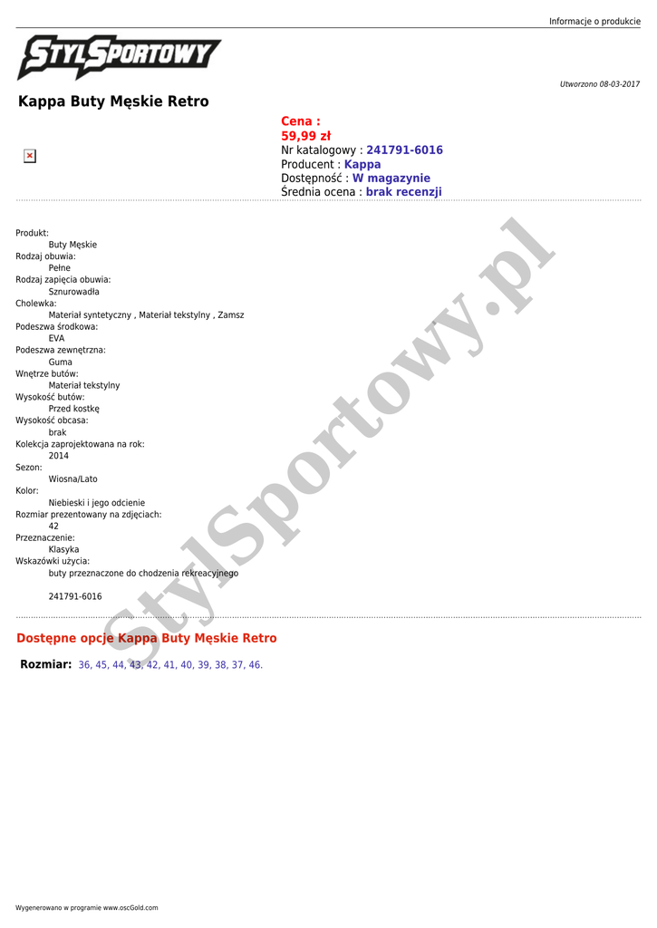 Informacje o produkcie Utworzono 08-03-2017 Kappa Buty Męskie Retro Cena : 59,99 zł St y lS p y. or to w Produkt: Buty Męskie Rodzaj obuwia: Pełne Rodzaj zapięcia obuwia: Sznurowadła Cholewka: Materiał syntetyczny , Materiał tekstylny , Zamsz Podeszwa środkowa: EVA Podeszwa zewnętrzna: Guma Wnętrze butów: Materiał tekstylny Wysokość butów: Przed kostkę Wysokość obcasa: brak Kolekcja zaprojektowana na rok: 2014 Sezon: Wiosna/Lato Kolor: Niebieski i jego odcienie Rozmiar prezentowany na zdjęciach: 42 Przeznaczenie: Klasyka Wskazówki użycia: buty przeznaczone do chodzenia rekreacyjnego pl Nr katalogowy : 241791-6016 Producent : Kappa Dostępność : W magazynie Średnia ocena : brak recenzji 241791-6016 Dostępne opcje Kappa Buty Męskie Retro Rozmiar: 36, 45, 44, 43, 42, 41, 40, 39, 38, 37, 46. Wygenerowano w programie www.oscGold.com