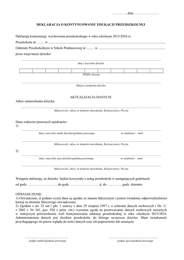 …………, dnia …………………. DEKLARACJA O KONTYNUOWANIU EDUKACJI PRZEDSZKOLNEJ Deklaruję kontynuację wychowania przedszkolnego w roku szkolnym 2015/2016 w: Przedszkolu nr ......... w .......................................................................................................................................... Oddziale Przedszkolnym w Szkole Podstawowej nr ......... w ............................................................................... przez moje/nasze dziecko: …………………………………………………………………………………………………………… Imię i nazwisko dziecka PESEL dziecka …………………………………………………………………………………………………………… Miejsce urodzenia dziecka AKTUALIZACJA DANYCH: Adres zamieszkania dziecka: …………………………………………………………………………………………………………… Miejscowość, ulica, nr domu/nr mieszkania, Kod pocztowy, Poczta Dane rodziców/prawnych opiekunów: 1) …………………………………………………………………………………………………………… Imię i nazwisko matki dziecka/opiekuna prawnego nr telefonu/e – mail …………………………………………………………………………………………………………… Miejscowość, ulica, nr domu/nr mieszkania, Kod pocztowy, Poczta 2) …………………………………………………………………………………………………………… Imię i nazwisko ojca dziecka/opiekuna prawnego nr telefonu/e – mail …………………………………………………………………………………………………………… Miejscowość, ulica, nr domu/nr mieszkania, Kod pocztowy, Poczta Wstępnie deklaruję, że dziecko będzie korzystało z usług przedszkola w następujących godzinach: od godz. …………………….. do godz. ……………………. tj. do …………. godz. dziennie OŚWIADCZENIE: 1) Oświadczam, iż podane wyżej dane są zgodne ze stanem faktycznym i jestem świadomy odpowiedzialności karnej za złożenie fałszywego oświadczenia. 2) Zgodnie z art. 23 ust.1 pkt. 1 ustawy z dnia 29 sierpnia 1997 r. o ochronie danych osobowych ( Dz. U. z 2002 r. Nr 101, poz. 926 z późn. zm.) wyrażam zgodę na przetwarzanie danych osobowych zawartych w niniejszym potwierdzeniu woli kontynuowania edukacji przedszkolnej w roku szkolnym 2015/2016. Administratorem danych jest dyrektor przedszkola, do którego uczęszcza dziecko. Mam świadomość przysługującego mi prawa wglądu do treści danych oraz ich poprawienia lub usunięcia. ……………………………….. podpis matki/opiekuna prawnego ……………………………………. podpis ojca/opiekuna prawnego