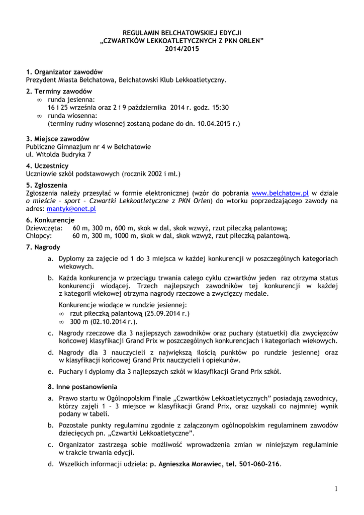 REGULAMIN BEŁCHATOWSKIEJ EDYCJI „CZWARTKÓW LEKKOATLETYCZNYCH Z PKN ORLEN” 2014/2015 1. Organizator zawodów Prezydent Miasta Bełchatowa, Bełchatowski Klub Lekkoatletyczny. 2. Terminy zawodów • runda jesienna: 16 i 25 września oraz 2 i 9 października 2014 r. godz. 15:30 • runda wiosenna: (terminy rudny wiosennej zostaną podane do dn. 10.04.2015 r.) 3. Miejsce zawodów Publiczne Gimnazjum nr 4 w Bełchatowie ul. Witolda Budryka 7 4. Uczestnicy Uczniowie szkół podstawowych (rocznik 2002 i mł.) 5. Zgłoszenia Zgłoszenia należy przesyłać w formie elektronicznej (wzór do pobrania www.belchatow.pl w dziale o mieście – sport – Czwartki Lekkoatletyczne z PKN Orlen) do wtorku poprzedzającego zawody na adres: [email protected] 6. Konkurencje Dziewczęta: 60 m, 300 m, 600 m, skok w dal, skok wzwyż, rzut piłeczką palantową; Chłopcy: 60 m, 300 m, 1000 m, skok w dal, skok wzwyż, rzut piłeczką palantową. 7. Nagrody a. Dyplomy za zajęcie od 1 do 3 miejsca w każdej konkurencji w poszczególnych kategoriach wiekowych. b. Każda konkurencja w przeciągu trwania całego cyklu czwartków jeden raz otrzyma status konkurencji wiodącej. Trzech najlepszych zawodników tej konkurencji w każdej z kategorii wiekowej otrzyma nagrody rzeczowe a zwycięzcy medale. Konkurencje wiodące w rundzie jesiennej: • rzut piłeczką palantową (25.09.2014 r.) • 300 m (02.10.2014 r.). c. Nagrody rzeczowe dla 3 najlepszych zawodników oraz puchary (statuetki) dla zwycięzców końcowej klasyfikacji Grand Prix w poszczególnych konkurencjach i kategoriach wiekowych. d. Nagrody dla 3 nauczycieli z największą ilością punktów po rundzie jesiennej oraz w klasyfikacji końcowej Grand Prix nauczycieli i opiekunów. e. Puchary i dyplomy dla 3 najlepszych szkół w klasyfikacji Grand Prix szkół. 8. Inne postanowienia a. Prawo startu w Ogólnopolskim Finale „Czwartków Lekkoatletycznych” posiadają zawodnicy, którzy zajęli 1 – 3 miejsce w klasyfikacji Grand Prix, oraz uzyskali co najmniej wynik podany w tabeli. b. Pozostałe punkty regulaminu zgodnie z załączonym ogólnopolskim regulaminem zawodów dziecięcych pn. „Czwartki Lekkoatletyczne”. c. Organizator zastrzega sobie możliwość wprowadzenia zmian w niniejszym regulaminie w trakcie trwania edycji. d. Wszelkich informacji udziela: p. Agnieszka Morawiec, tel. 501-060-216. 1 Tabela minimów dopuszczeniowych do udziału w Ogólnopolskim Finale „Czwartków Lekkoatletycznych” VI klasa V klasa IV klasa chł. dz. chł. dz. chł. dz. 60 m 8,4 8,7 8,9 9,0 9,2 9,4 300 m 46,1 49,0 49,8 51,3 52,6 54,8 600/1000m 3,18 1,58 3,28 2,02 3,37 2,12 rzut p. palantową 60,00 43,00 51,00 38,50 45,00 31,00 skok w dal 4,80 4,40 4,40 4,20 4,05 3,75 skok wzwyż 1,40 1,30 1,30 1,25 1,20 1,10 2