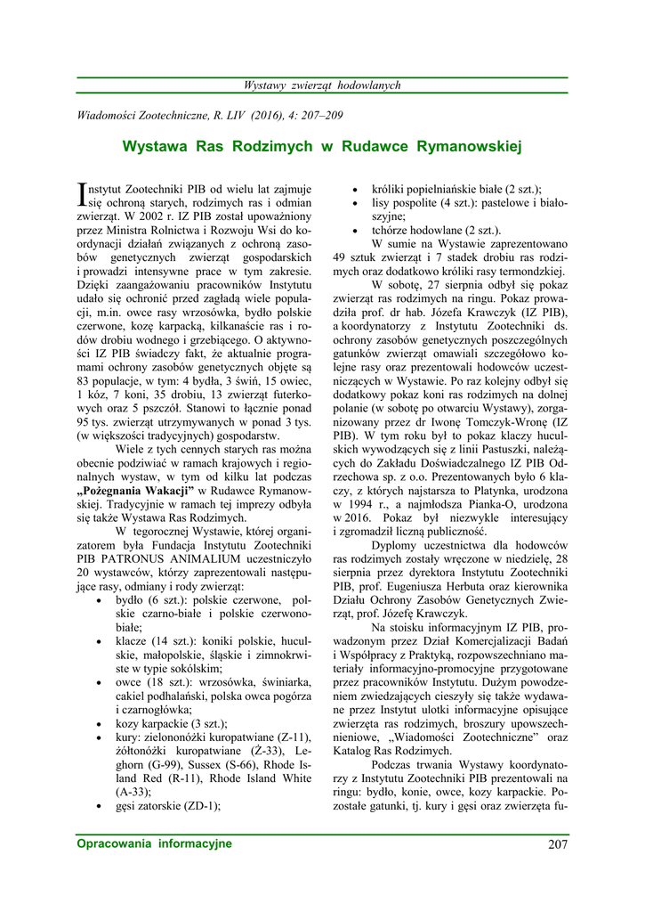 Wystawy zwierząt hodowlanych Wiadomości Zootechniczne, R. LIV (2016), 4: 207–209 Wystawa Ras Rodzimych w Rudawce Rymanowskiej I nstytut Zootechniki PIB od wielu lat zajmuje się ochroną starych, rodzimych ras i odmian zwierząt. W 2002 r. IZ PIB został upoważniony przez Ministra Rolnictwa i Rozwoju Wsi do koordynacji działań związanych z ochroną zasobów genetycznych zwierząt gospodarskich i prowadzi intensywne prace w tym zakresie. Dzięki zaangażowaniu pracowników Instytutu udało się ochronić przed zagładą wiele populacji, m.in. owce rasy wrzosówka, bydło polskie czerwone, kozę karpacką, kilkanaście ras i rodów drobiu wodnego i grzebiącego. O aktywności IZ PIB świadczy fakt, że aktualnie programami ochrony zasobów genetycznych objęte są 83 populacje, w tym: 4 bydła, 3 świń, 15 owiec, 1 kóz, 7 koni, 35 drobiu, 13 zwierząt futerkowych oraz 5 pszczół. Stanowi to łącznie ponad 95 tys. zwierząt utrzymywanych w ponad 3 tys. (w większości tradycyjnych) gospodarstw. Wiele z tych cennych starych ras można obecnie podziwiać w ramach krajowych i regionalnych wystaw, w tym od kilku lat podczas „Pożegnania Wakacji” w Rudawce Rymanowskiej. Tradycyjnie w ramach tej imprezy odbyła się także Wystawa Ras Rodzimych. W tegorocznej Wystawie, której organizatorem była Fundacja Instytutu Zootechniki PIB PATRONUS ANIMALIUM uczestniczyło 20 wystawców, którzy zaprezentowali następujące rasy, odmiany i rody zwierząt: bydło (6 szt.): polskie czerwone, polskie czarno-białe i polskie czerwonobiałe; klacze (14 szt.): koniki polskie, huculskie, małopolskie, śląskie i zimnokrwiste w typie sokólskim; owce (18 szt.): wrzosówka, świniarka, cakiel podhalański, polska owca pogórza i czarnogłówka; kozy karpackie (3 szt.); kury: zielononóżki kuropatwiane (Z-11), żółtonóżki kuropatwiane (Ż-33), Leghorn (G-99), Sussex (S-66), Rhode Island Red (R-11), Rhode Island White (A-33); gęsi zatorskie (ZD-1); Opracowania informacyjne króliki popielniańskie białe (2 szt.); lisy pospolite (4 szt.): pastelowe i białoszyjne; tchórze hodowlane (2 szt.). W sumie na Wystawie zaprezentowano 49 sztuk zwierząt i 7 stadek drobiu ras rodzimych oraz dodatkowo króliki rasy termondzkiej. W sobotę, 27 sierpnia odbył się pokaz zwierząt ras rodzimych na ringu. Pokaz prowadziła prof. dr hab. Józefa Krawczyk (IZ PIB), a koordynatorzy z Instytutu Zootechniki ds. ochrony zasobów genetycznych poszczególnych gatunków zwierząt omawiali szczegółowo kolejne rasy oraz prezentowali hodowców uczestniczących w Wystawie. Po raz kolejny odbył się dodatkowy pokaz koni ras rodzimych na dolnej polanie (w sobotę po otwarciu Wystawy), zorganizowany przez dr Iwonę Tomczyk-Wronę (IZ PIB). W tym roku był to pokaz klaczy huculskich wywodzących się z linii Pastuszki, należących do Zakładu Doświadczalnego IZ PIB Odrzechowa sp. z o.o. Prezentowanych było 6 klaczy, z których najstarsza to Platynka, urodzona w 1994 r., a najmłodsza Pianka-O, urodzona w 2016. Pokaz był niezwykle interesujący i zgromadził liczną publiczność. Dyplomy uczestnictwa dla hodowców ras rodzimych zostały wręczone w niedzielę, 28 sierpnia przez dyrektora Instytutu Zootechniki PIB, prof. Eugeniusza Herbuta oraz kierownika Działu Ochrony Zasobów Genetycznych Zwierząt, prof. Józefę Krawczyk. Na stoisku informacyjnym IZ PIB, prowadzonym przez Dział Komercjalizacji Badań i Współpracy z Praktyką, rozpowszechniano materiały informacyjno-promocyjne przygotowane przez pracowników Instytutu. Dużym powodzeniem zwiedzających cieszyły się także wydawane przez Instytut ulotki informacyjne opisujące zwierzęta ras rodzimych, broszury upowszechnieniowe, „Wiadomości Zootechniczne” oraz Katalog Ras Rodzimych. Podczas trwania Wystawy koordynatorzy z Instytutu Zootechniki PIB prezentowali na ringu: bydło, konie, owce, kozy karpackie. Pozostałe gatunki, tj. kury i gęsi oraz zwierzęta fu 207 Wystawy zwierząt hodowlanych terkowe demonstrowano przy klatkach. Koordynatorzy kolejno przybliżali historię poszczególnych ras oraz ich charakterystykę. W trakcie Wystawy przeprowadzono już tradycyjnie „Konkurs plastyczny dla dzieci”, który polegał na rysowaniu zwierząt gospodarskich. Wzięło w nim udział 30 dzieci. Przyznano po 3 nagrody w 3 kategoriach wiekowych. Ponadto, wszystkie dzieci otrzymały nagrody pocieszenia. Nagrody wręczył prezydent Kapituły Fundacji Instytutu Zootechniki PIB PATRONUS ANIMALIUM, prof. Eugeniusz Herbut. Wszystkim zwiedzającym umilały czas występy zespołów muzycznych, liczne degustacje wołowiny oraz tzw. „Ścieżka Huculska”. Swoją bogatą ofertę handlową prezentowały również firmy działające w sektorze rolnospożywczym. Wielkim zainteresowaniem cieszyła się loteria, w której główną nagrodą był koń huculski. W sobotni wieczór odbył się już tradycyjnie „Wieczór hodowcy”, a w godzinach wieczornych odwiedzający Wystawę mogli podziwiać pokaz laserowy i iluminację świetlną prezentującą logo organizatorów. 28 sierpnia 2016 r. podczas pokazu cieliczek, organizowanego przez Małopolskie Centrum Biotechniki w Krasnem sp. z o.o. Fundacja Instytutu Zootechniki PIB PATRONUS ANIMALIUM była współfundatorem nagród dla „Młodych Hodowców”. Nagrody wręczył wiceprezes Fundacji, mgr Piotr M. Mikosz. W podsumowaniu należy stwierdzić, że ekspozycja ras rodzimych cieszyła się ogromnym zainteresowaniem zwiedzających. Instytut ma nadzieję, że dla hodowców była to kolejna okazja nie tylko do spotkania, ale również wymiany wielu cennych doświadczeń i że Wystawa ta będzie rozwijać się w przyszłości, gromadząc jeszcze więcej hodowców i zwiedzających. Agnieszka Chełmińska, Piotr M. Mikosz, Paweł Radomski, Piotr Moskała Instytut Zootechniki PIB, Kraków-Balice Prezentacja krów: rasy polskiej czarno-białej i polskiej czerwono-białej Presentation of Polish Black-andWhite and Polish Red-an
