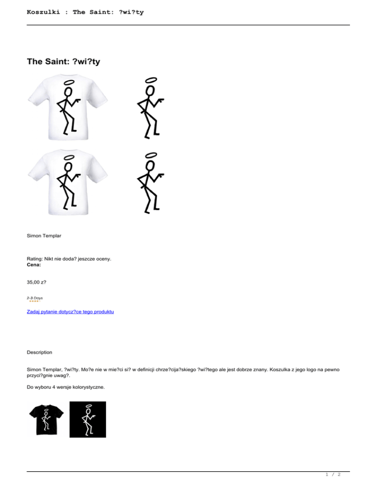 Koszulki : The Saint: ?wi?ty The Saint: ?wi?ty Simon Templar Rating: Nikt nie doda? jeszcze oceny. Cena: 35,00 z? Zadaj pytanie dotycz?ce tego produktu Description Simon Templar, ?wi?ty. Mo?e nie w mie?ci si? w definicji chrze?cija?skiego ?wi?tego ale jest dobrze znany. Koszulka z jego logo na pewno przyci?gnie uwag?. Do wyboru 4 wersje kolorystyczne. 1 / 2 Koszulki : The Saint: ?wi?ty "I am Marin Depores. I am from Spain but I am named for a Peruvian Saint, who could cure the sick, or the injured, by the laying of hands." Informacje dodatkowe ?redni czas dostawy 2-3 dni Dost?pne kolory: czarny, bia?y, czerwony, granatowy Zwroty i reklamacja Wed?ug regulaminu sklepu Dost?pno?? Na terenie Polski Dost?pne ?rodki p?atno?ci Przedp?ata na konto / p?atno?ci elektroniczne online 2 / 2 Powered by TCPDF (www.tcpdf.org)