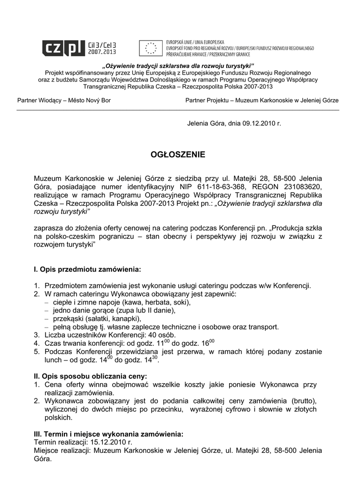 „Ożywienie tradycji szklarstwa dla rozwoju turystyki” Projekt współfinansowany przez Unię Europejską z Europejskiego Funduszu Rozwoju Regionalnego oraz z budżetu Samorządu Województwa Dolnośląskiego w ramach Programu Operacyjnego Współpracy Transgranicznej Republika Czeska – Rzeczpospolita Polska 2007-2013 Partner Wiodący – Mĕsto Nový Bor Partner Projektu – Muzeum Karkonoskie w Jeleniej Górze _________________________________________________________________________________________________ Jelenia Góra, dnia 09.12.2010 r. OGŁOSZENIE Muzeum Karkonoskie w Jeleniej Górze z siedzibą przy ul. Matejki 28, 58-500 Jelenia Góra, posiadające numer identyfikacyjny NIP 611-18-63-368, REGON 231083620, realizujące w ramach Programu Operacyjnego Współpracy Transgranicznej Republika Czeska – Rzeczpospolita Polska 2007-2013 Projekt pn.: „Ożywienie tradycji szklarstwa dla rozwoju turystyki” zaprasza do złożenia oferty cenowej na catering podczas Konferencji pn. „Produkcja szkła na polsko-czeskim pograniczu – stan obecny i perspektywy jej rozwoju w związku z rozwojem turystyki” I. Opis przedmiotu zamówienia: 1. Przedmiotem zamówienia jest wykonanie usługi cateringu podczas w/w Konferencji. 2. W ramach cateringu Wykonawca obowiązany jest zapewnić: – ciepłe i zimne napoje (kawa, herbata, soki), – jedno danie gorące (zupa lub II danie), – przekąski (sałatki, kanapki), – pełną obsługę tj. własne zaplecze techniczne i osobowe oraz transport. 3. Liczba uczestników Konferencji: 40 osób. 4. Czas trwania konferencji: od godz. 1100 do godz. 1600 5. Podczas Konferencji przewidziana jest przerwa, w ramach której podany zostanie lunch – od godz. 1400 do godz. 1430. II. Opis sposobu obliczania ceny: 1. Cena oferty winna obejmować wszelkie koszty jakie poniesie Wykonawca przy realizacji zamówienia. 2. Wykonawca zobowiązany jest do podania całkowitej ceny zamówienia (brutto), wyliczonej do dwóch miejsc po przecinku, wyrażonej cyfrowo i słownie w złotych polskich. III. Termin i miejsce wykonania zamówienia: Termin realizacji: 15.12.2010 r. Miejsce realizacji: Muzeum Karkonoskie w Jeleniej Górze, ul. Matejki 28, 58-500 Jelenia Góra. IV. Kryterium oceny ofert: najniższa cena V. Oferty należy składać: w formie pisemnej w siedzibie Muzeum Karkonoskiego, 58-500 Jelenia Góra ul. Matejki 28 – sekretariat, lub przesłać faksem na nr 75 75 234 65 albo na adres e-mail: [email protected] w terminie do dnia 13.12.2010 r. Informację o wybranej przez Nas ofercie zamieścimy na naszej stronie internetowej www.muzeumkarkonoskie.pl VI. Wykaz dokumentów, jakie mają dostarczyć Wykonawcy: Ofertę określającą cenę wykonania zamówienia należy złożyć w formie pisemnej. Ponadto Wykonawca obowiązany jest załączyć do oferty szczegółowe menu. Z poważaniem Dyrektor Muzeum Karkonoskiego w Jeleniej Górze /-/ Gabriela Zawiła