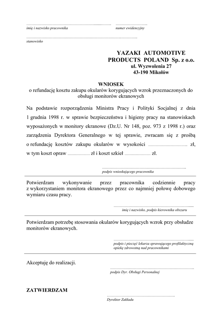 ……………………………………………….........…….. imię i nazwisko pracownika …………………….. numer ewidencyjny ………………………………………………………………….………….. stanowisko YAZAKI AUTOMOTIVE PRODUCTS POLAND Sp. z o.o. ul. Wyzwolenia 27 43-190 Mikołów WNIOSEK o refundację kosztu zakupu okularów korygujących wzrok przeznaczonych do obsługi monitorów ekranowych Na podstawie rozporządzenia Ministra Pracy i Polityki Socjalnej z dnia 1 grudnia 1998 r. w sprawie bezpieczeństwa i higieny pracy na stanowiskach wyposażonych w monitory ekranowe (Dz.U. Nr 148, poz. 973 z 1998 r.) oraz zarządzenia Dyrektora Generalnego w tej sprawie, zwracam się z prośbą o refundację kosztów zakupu okularów w wysokości ………………………….. zł, w tym koszt opraw ……………… zł i koszt szkieł ………………… zł. ………………………………………………………….. podpis wnioskującego pracownika Potwierdzam wykonywanie przez pracownika codziennie pracy z wykorzystaniem monitora ekranowego przez co najmniej połowę dobowego wymiaru czasu pracy. ……………………………………………………...... imię i nazwisko, podpis kierownika obszaru Potwierdzam potrzebę stosowania okularów korygujących wzrok przy obsłudze monitorów ekranowych. ……………………………………………………...... podpis i pieczęć lekarza sprawującego profilaktyczną opiekę zdrowotną nad pracownikami Akceptuję do realizacji. ………………………………………………………….. podpis Dyr. Obsługi Personalnej ZATWIERDZAM ………………………………………………. Dyrektor Zakładu ZASADY POSTĘPOWANIA 1. Okulary korygujące wzrok, przeznaczone do obsługi monitora ekranowego przysługują pracownikowi: u którego stwierdzono w wyniku badań profilaktycznych potrzebę ich stosowania, korzystającemu codziennie podczas swojej pracy z monitora ekranowego przez co najmniej połowę dobowego wymiaru czasu pracy, 2. Pracownik wypełnia wniosek i uzyskuje potwierdzenie stanu faktycznego przez: kierownika obszaru, na którym jest zatrudniony, lekarza sprawującego profilaktyczną opiekę nad pracownikami Spółki. 3. Zakup okularów korygujących wzrok, przeznaczonych do obsługi monitora ekranowego, może być realizowany przez pracownika w dowolnym zakładzie optycznym. 4. Do wniosku pracownik jest zobowiązany dołączyć fakturę lub rachunek potwierdzający dokonanie zakupu okularów. 5. Kompletny wniosek pracownik składa w dziale Obsługi Personalnej, gdzie dokonywana jest akceptacja wniosku i następuje przekazanie wniosku do Dyrektora Generalnego w celu zatwierdzenia. 6. Wypłata ekwiwalentu odbywa się poprzez listę płac z wynagrodzeniem za najbliższy miesiąc.
