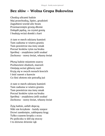 iSing.pl - Każdy może śpiewać! Bez słów – Wolna Grupa Bukowina Chodzą ulicami ludzie Maj przechodzą, lipiec, grudzień Zagubieni wsród ulic bram Przemarznięte grzeją dłonie Dokądś pędzą, za czymś gonią I budują wciaż domki z kart A tam w mech odziany kamień Tam zaduma w wiatru graniu Tam powietrze ma inny smak Porzuć kroków rytm na bruku Spróbuj - znajdziesz jeśli szukać Zechcesz - nowy świat, własny świat Płyną ludzie miastem szarzy Pozbawieni złudzeń, marzeń Omijają wciaż główny nurt Kryją się w swych norach krecich I śnić nawet o karecie Co lśni złotem nie potrafią już A tam w mech odziany kamień Tam zaduma w wiatru graniu Tam powietrze ma inny smak Porzuć kroków rytm na bruku Spróbuj - znajdziesz jeśli szukać Zechcesz - nowy świat, własny świat Żyją ludzie, asfalt depczą Nikt nie krzyknie - każdy szepce Drzwi zamknięte, zaklepany krąg Tylko czasem kropla z oczu Po policzku w dół się stoczy I to dziwne drżenie rąk Bo tam w mech odziany kamień Tam zaduma w wiatru graniu Tam powietrze ma inny smak Porzuć kroków rytm na bruku Spróbuj - znajdziesz jeśli szukać Zechcesz - nowy świat, własny świat Słowa: brak danych Muzyka: brak danych Rok wydania: brak danych Płyta: brak danych