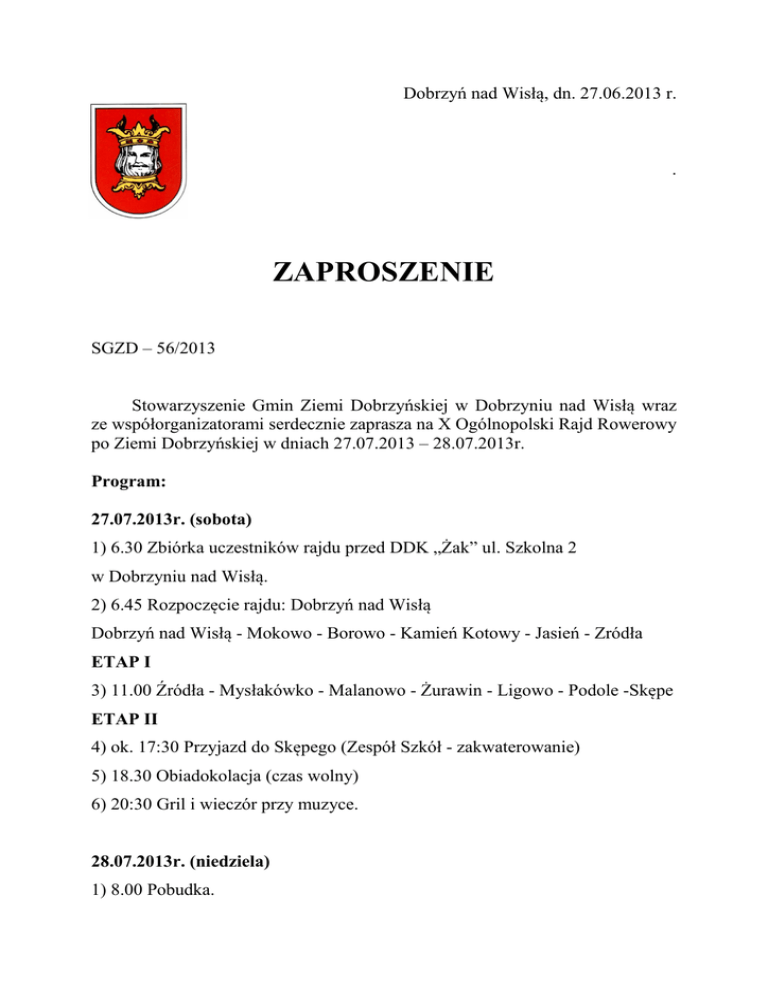 Dobrzyń nad Wisłą, dn. 27.06.2013 r. . ZAPROSZENIE SGZD – 56/2013 Stowarzyszenie Gmin Ziemi Dobrzyńskiej w Dobrzyniu nad Wisłą wraz ze współorganizatorami serdecznie zaprasza na X Ogólnopolski Rajd Rowerowy po Ziemi Dobrzyńskiej w dniach 27.07.2013 – 28.07.2013r. Program: 27.07.2013r. (sobota) 1) 6.30 Zbiórka uczestników rajdu przed DDK „Żak” ul. Szkolna 2 w Dobrzyniu nad Wisłą. 2) 6.45 Rozpoczęcie rajdu: Dobrzyń nad Wisłą Dobrzyń nad Wisłą - Mokowo - Borowo - Kamień Kotowy - Jasień - Zródła ETAP I 3) 11.00 Źródła - Mysłakówko - Malanowo - Żurawin - Ligowo - Podole -Skępe ETAP II 4) ok. 17:30 Przyjazd do Skępego (Zespół Szkół - zakwaterowanie) 5) 18.30 Obiadokolacja (czas wolny) 6) 20:30 Gril i wieczór przy muzyce. 28.07.2013r. (niedziela) 1) 8.00 Pobudka. 2) 9.00 Śniadanie. 3) 10.00 Wyjazd ze Skępego. Skępe - Józefowo - Suradówek - Czarne ETAP III 4) 12.30 Czarne - Wielgie - Płonczynek - Główczyn - Dobrzyń nad Wisłą ETAP IV 5) ok. 14.30 Przyjazd do Dobrzynia nad Wisłą (zakończenie rajdu). Regulamin: 1. Uczestnikiem rajdu może być osoba, która: wypełniła i złożyła kartę uczestnika oraz wpłaciła wpisowe 50,00zł do dnia 19.07.2013r. na konto BANK PEKAO S.A. Oddział w Lipnie nr 85 1240 3392 1111 0000 3023 1506 lub w Biurze Stowarzyszenia Gmin Ziemi Dobrzyńskiej w Dobrzyniu nad Wisłą tel/fax : 54 253-05-41. Decyduje kolejność zgłoszeń. 2. Dzieci i młodzież uczestniczą w wycieczce pod opieką pełnoletnich opiekunów. 3. Każdego uczestnika obowiązuje posiadanie karty rowerowej oraz znajomość przepisów ruchu drogowego i ich przestrzeganie. 4. Każdy uczestnik rajdu powinien zapoznać się z jej trasą i miejscami postoju (organizator przekazuje uczestnikom plan rajdu z opisem trasy wraz z zaznaczonymi miejscami postoju). 5. Każdy uczestnik rajdu powinien posiadać: nakrycie głowy, kurtkę przeciwdeszczową oraz kamizelkę odblaskową żółtą. Zaleca się także posiadanie kasku ochronnego. 6. Uczestnicy rajdu podzieleni są na grupy, wyznaczoną grupę prowadzi przewodnik grupy, wszelkie problemy należy zgłaszać przewodnikowi grupy. 7. Organizator rajdu zapewnia: - nocleg, obiadokolację i śniadanie, - podstawową opiekę medyczną, - zabezpieczenie techniczne na trasie rajdu. 8. Rajd prowadzi Komandor Rajdu: Ryszard Bartoszewski. 9. Organizatorami rajdu są: - Krajowe Zrzeszenie LZS w Warszawie, - Powiatowe Zrzeszenie LZS w Lipnie z/s w Dobrzyniu nad Wisłą, - Dobrzyński Dom Kultury „ŻAK” w Dobrzyniu nad Wisłą, - Stowarzyszenie Gmin Ziemi Dobrzyńskiej w Dobrzyniu nad Wisłą, - Dobrzyńskie Towarzystwo Rozwoju w Dobrzyniu nad Wisłą, - Dobrzyńskie Centrum Sportu i Turystyki w Dobrzyniu nad Wisłą. Serdecznie zapraszamy! Prezes Zarządu