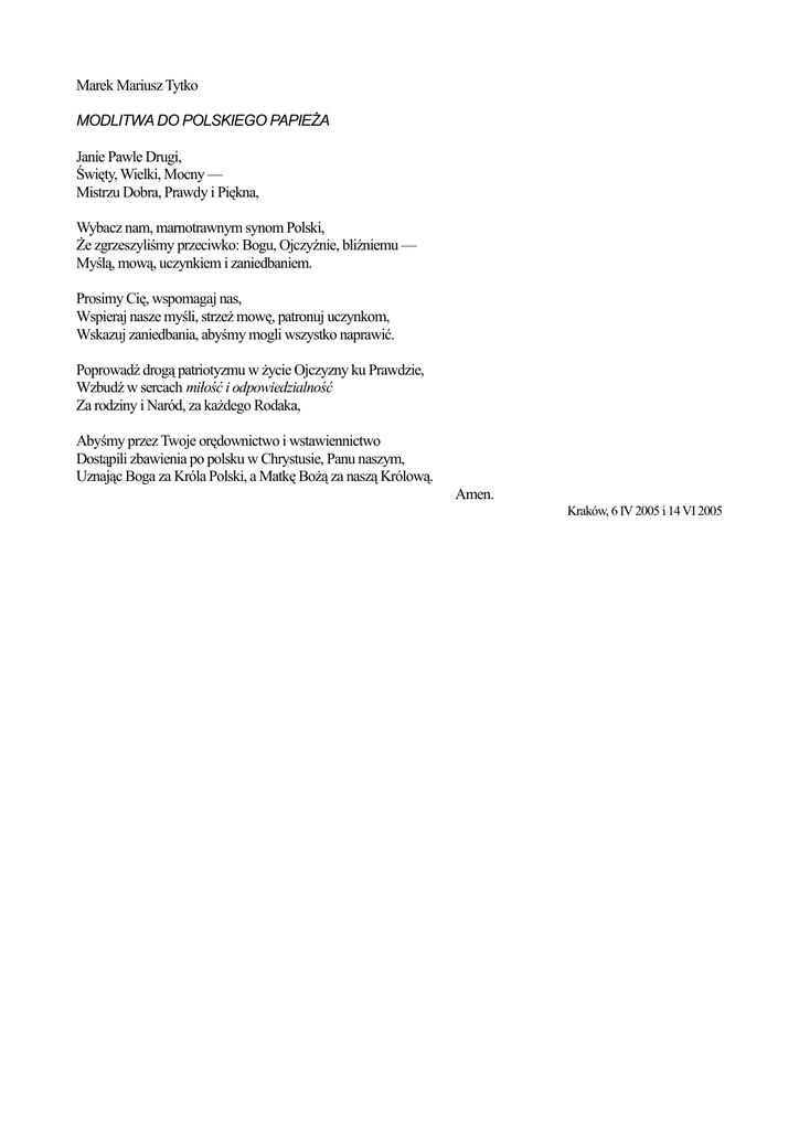 Marek Mariusz Tytko MODLITWA DO POLSKIEGO PAPIEŻA Janie Pawle Drugi, Święty, Wielki, Mocny — Mistrzu Dobra, Prawdy i Piękna, Wybacz nam, marnotrawnym synom Polski, Że zgrzeszyliśmy przeciwko: Bogu, Ojczyźnie, bliźniemu — Myślą, mową, uczynkiem i zaniedbaniem. Prosimy Cię, wspomagaj nas, Wspieraj nasze myśli, strzeż mowę, patronuj uczynkom, Wskazuj zaniedbania, abyśmy mogli wszystko naprawić. Poprowadź drogą patriotyzmu w życie Ojczyzny ku Prawdzie, Wzbudź w sercach miłość i odpowiedzialność Za rodziny i Naród, za każdego Rodaka, Abyśmy przez Twoje orędownictwo i wstawiennictwo Dostąpili zbawienia po polsku w Chrystusie, Panu naszym, Uznając Boga za Króla Polski, a Matkę Bożą za naszą Królową. Amen. Kraków, 6 IV 2005 i 14 VI 2005