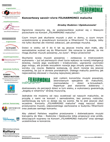 K AT O W I C E org anizator BUJNOWICZ Konsorcjum Koncertowy savoir-vivre FILHARMONII malucha wsp ół org a niz ato r Drodzy Rodzice i Opiekunowie! www.filharmoniaslaska.pl C Z Ę S T O C H OW A org anizator www.yamahaczestochowa.pl wsp ół org a niz ato r www.filharmonia.com.pl m e c e n a s k u l t ur y Niepubliczna Placówka Artystyczna BUJNOWICZ Konsorcjum www.yamahakatowice.pl www.ZiarnoTalentu.pl pat ron honor owy Ogromnie cieszymy się, że postanowiliście wybrać się z Waszymi pociechami na Koncert „FILHARMONII malucha”. Czym innym jest słuchanie muzyki z płyt w domu, a czym innym uczestniczenie w prawdziwym koncercie w filharmonii! To okazja, żeby nie tylko słuchać ale również zobaczyć, jak powstaje muzyka. Dzieci w wieku od 0 do 6 lat są jeszcze trochę zbyt małe, aby samodzielnie wybrać się do filharmonii. Nie oznacza to jednak, że nie mogą słuchać muzyki poważnej „na żywo”. Wręcz przeciwnie! Słuchanie żywej muzyki poważnej – zwłaszcza w mistrzowskim wykonaniu – już od pierwszych chwil życia wpływa na rozwój inteligencji dziecka, rozwój jego wyobraźni i kreatywności, usprawnia czynności jego mózgu, ale przede wszystkim rozwija jego zmysły pamięci, słuchu, wzroku czy czucia. Badania wykazują, że słuch rozwija się jeszcze wcześniej, bo już w okresie prenatalnym. Dlatego maluchy powinny jak najwcześniej obcować z muzyką najwyższej jakości. jest cyklem koncertów muzyki poważnej, skierowanych specjalnie do maluchów, niemowlaków i dzieci w brzuszkach. Repertuar jest starannie dobierany i dostosowany do percepcji dzieci w tym wieku, a wykonawcy gwarantują „bogatą w witaminy” strawę muzyczną. Jednakże nie możemy od razu oczekiwać od naszych maluchów, że przyjdą z nami na koncert i samodzielnie, bez pomocy rodziców, zainteresują się tym co dzieje się na scenie. Na to jest jeszcze zbyt wcześnie. Koncerty „FILHARMONII malucha” mają nauczyć dzieci przeżywania muzyki, odpowiedniego zachowania w budynku filharmonii oraz podczas samego koncertu. Aby ułatwić Państwu wspólne przeżywanie i doświadczanie muzyki kierujemy do Was – Rodziców i Opiekunów kilka propozycji oraz próśb, dotyczących wyprawy na Koncert „FILHARMONII malucha” oraz samego uczestnictwa w koncercie. Utworzony przez BUJNOWICZ Konsorcjum Copyrights © by BUJNOWICZ Konsorcjum Wszelkie prawa zastrzeżone. Materiał ten jest ograniczony prawami autorskimi oraz innymi prawami i nie może być kopiowany, publikowany i rozprowadzany w żadnej formie. Data utworzenia 2013-08-21 ©1997-2013 BUJNOWICZ Konsorcjum. Wszelkie prawa zastrzeżone. Samodzielna Jednostka Organizacyjna K AT O W I C E org anizator BUJNOWICZ Konsorcjum wsp ół org a niz ato r www.filharmoniaslaska.pl Zanim wybierzesz się na koncert (intelektualne przygotowanie) n opowiedz maluchowi o koncercie oraz o miejscu, do którego się udajecie; n pokaż dziecku fotografie instrumentów, które usłyszy podczas koncertu; UWAGA: im bardziej wprowadzisz dziecko w atmosferę koncertu (jeszcze w domu), tym chętniej i aktywniej weźmie w nim udział. Udając się do Filharmonii powinnyśmy się do tego przygotować intelektualnie. Jest to, nota bene, bezwzględny obowiązek dla mężczyzny (Taty!). n ubiór do Filharmonii musi być elegancki, a dzieci uwielbiają się ubierać; C Z Ę S T O C H OW A org anizator Przybycie do filharmonii i czas przed koncertem n przybądź z dzieckiem do filharmonii odpowiednio wcześniej (na kwadrans przed rozpoczęciem koncertu), aby dziecko mogło poczuć atmosferę prawdziwej sali koncertowej; www.yamahaczestochowa.pl wsp ół org a niz ato r n zadbaj o to, aby maluch załatwił swoje potrzeby fizjologiczne przed koncertem (nawet, jeżeli nie wyraża chęci); n jeżeli macie jeszcze chwilkę nie traćcie czasu – pozwiedzajcie filharmonii i przygotowane dla dzieci atrakcje; budynek www.filharmonia.com.pl n nie pozwól dziecku biegać, szaleć – zmęczy się, zupełnie zatraci koncentrację niezbędną do aktywnego słuchania muzyki, a przy okazji rozproszy innych młodych słuchaczy; m e c e n a s k u l t ur y n na salę koncertową nie wnosimy słodyczy i napojów; przypomnij dziecku o zasadach kulturalnego zachowania: podczas koncertu się (1) nie je, (2) nie pije i (3) nie rozmawia; Niepubliczna Placówka Artystyczna BUJNOWICZ Konsorcjum www.yamahakatowice.pl www.ZiarnoTalentu.pl pat ron honor owy W trakcie koncertu (przestrzegaj zasad etykiety) n wspólnie z dzieckiem aktywnie słuchaj muzyki; aby dziecko było zainteresowane koncertem – sam musisz wykazywać to zainteresowanie. Dziecko bierze z Ciebie przykład i naśladuje Cię! n nie rozmawiaj z dzieckiem w trakcie koncertu a zwłaszcza podczas muzycznych prezentacji; wyobraź sobie, że 300 osób będących na sali zaczyna równocześnie rozmawiać ... L n jeżeli Twoje dziecko zacznie hałasować bądź przeszkadzać – zwróć mu uwagę i przypomnij, jak powinno się zachowywać podczas koncertu lub udaj się cichutko do przygotowanego na tę sytuację Muzycznego Miasteczka n nie spacerujcie w trakcie koncertu po sali i/lub scenie – jeżeli będziecie musieli wyjść, zróbcie to w przerwie między utworami; n w czasie koncertu nie nagrywamy, nie fotografujemy i nie filmujemy, aby całą swoją uwagę oraz dziecka zwrócić ku słuchaniu muzyki; n jeżeli Twój maluch będzie się nudził, protestował, domagał powrotu do domu czy w inny głośny sposób wyrażał swoje niezadowolenie – nie upieraj się! Powtórz próbę za kilka miesięcy. Z każdym koncertem będzie lepiej i wkrótce wysłucha go w całości. Plik:„pub-SavoirVivre130821” strona 2 z 3 Autor: BUJNOWICZ Konsorcjum, dn. 2013-08-21 ©1997-2013 BUJNOWICZ Konsorcjum. Wszelkie prawa zastrzeżone. Samodzielna Jednostka Organizacyjna K AT O W I C E org anizator BUJNOWICZ Konsorcjum „FILHARMONIA malucha” wsp ół org a niz ato r ma przyzwyczaić dzieci do słuchania muzyki i nauczyć je odpowiednie