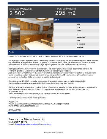 Toruń, Czerniewice DOM na WYNAJEM 295 m2 2 500 810 820 220 2008 7 Detached 295 2 500 PLN Asphalt Opis PRZESTRONNY WOLNOSTOJĄCY DOM W SPOKOJNEJ OKOLICY W SĄSIEDZTWIE LASU. Do wynajęcia dom o powierzchni całkowitej 295 m2 składający się z kilku kondygnacji. Dom składa się z osobnej dużej kuchni, salonu, 4 pokoi, 2 łazienek z WC, holu, przestrzeni na poddaszu oraz pomieszczeń w piwnicy które mogą być wykorzystane na cele mieszkalne lub biurowe. Dom jest utrzymany w dobrym standardzie. Na podłogach położone są deski oraz panele, na ścianach gładzie. Łazienki w płytkach. Kuchnia z obszerną zabudową. Jest częściowo umeblowany: 2 pojedyncze łóżka, komplet wypoczynkowy w salonie, zabudowana szafa typu Komandor, zabudowa kuchni wraz ze sprzętem AGD: piekarnik z płytą elektryczną, zmywarkę, lodówkę, stół z krzesłami w części jadalnianej. Czynsz najmu: 2500 zł + opłaty eksploatacyjne: prąd, woda, gaz, wywóz nieczystości. Kaucja zabezpieczająca w wysokości jednomiesięcznego czynszu najmu. Okolica jest bardzo spokojna i pełna zieleni. Kameralne osiedle domów jednorodzinnych w pobliżu lasu. Na osiedlu znajdują się sklepy, kilka punktów usługowych. W pobliżu szkoła, poczta, przystanek MZK. 5 km do nowego mostu drogowego łączącego Stawki z Rubinkowem. Termin przekazania: około miesiąc czasu. POLECAM! PEŁNĄ GALERIĘ ZDJĘĆ ZNAJDZIECIE PAŃSTWO NA NASZEJ STRONIE PANORAMA-NIERUCHOMOŚCI.net ZAPRASZAMY Panorama Nieruchomości tel. 56/687-19-76 email: [email protected] Panorama Nieruchomości Panorama Nieruchomości Powered by TCPDF (www.tcpdf.org)