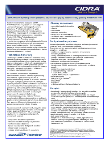 SONARtrac® System pomiaru przepływu objętościowego przy obecności fazy gazowej Model GVF-100 System monitorowania przepływu CiDRA SONARtrac® stanowi przełom w bezinwazyjnych „pełnoprzekrojowych” technologiach pomiaru przepływu. W odróżnieniu od innych typów przepływomierzy możliwość montażu systemu SONARtrac na pracujących rurociągach eliminuje konieczność zatrzymanie procesu i przestojów. System SONARtrac® nie jest systemem ultradźwiękowym. Pracuje w oparciu o opatentowaną, pasywną technologię nasłuchiwania i interpretowania fal akustycznych generowanych przez przepływające medium. Jest to metoda pasywna, która umożliwia pomiar zarówno jedno, jak i wielofazowych mieszanin oraz zawiesin przy stałym poziomie dokładności i czułości. Technologia Sonarowa Technologia CiDRA SONARtrac® ustanawia nową innowacyjną klasę przepływomierzy przemysłowych. Sonarowa technologia wykorzystuje techniki analizy szeregowej danych, podobnie jak przy zastosowaniu sonaru. Początkowo CiDRA opracowała system SONARtrac® dla najbardziej wymagających aplikacji, takich jak, pomiary przepływu przy odwiertach, wydobyciu ropy i gazu ziemnego. Po uzyskaniu potwierdzenia przydatności i niezawodności działania w branży wydobywczej ropy naftowej i gazu ziemnego, CiDRA z powodzeniem stosuje system SONARtrac® również w innych, wymagających dziedzinach przemysłu. System pomiarowy CiDRA SONARtrac® wykorzystuje do pomiaru czujniki umieszczone szeregowo w macie pomiarowej, która jest owijana wokół rurociągu. Natężenie przepływu jest określane poprzez pomiar przemieszczania się zaburzeń akustycznych generowanych przez mikroturbulencje w przemieszczającym się medium. Wielkość przepływu jest obliczana bezpośrednio na podstawie prędkości przemieszczania się turbulencji. Zawartość fazy gazowej obliczana jest bezpośrednio na podstawie mierzonej prędkości dźwięku. W zastosowaniach przemysłowych, wszystkie zalety i cechy charakterystyczne systemu pomiarowego CiDRA SONARtrac® GVF-100, umożliwiają użytkownikowi osiągnięcie następujących, wymiernych korzyści: - zwiększenie dokładności pomiarów - obniżenie kosztów instalacji i użytkowania - wydłużenie czasu działania - lepsze wykorzystanie dostępnych zasobów - niższe koszty operacyjne - wyższa jakość uzyskiwanych produktów Obszary zastosowań: - przeróbka kopalin i minerałów - chemia - energetyka - przemysł papierniczy - gospodarka wodno-ściekowa - wydobycie ropy z piasków bitumicznych - przemysł spożywczy Cechy charakterystyczne: Konstrukcja czujnika umożliwia całkowicie bezinwazyjny montaż przez owinięcie rurociągu matą czujników. Transmiter sygnału wyposażony jest w zintegrowany procesor przepływu i umożliwia: - możliwość programowania z poziomu zintegrowanej klawiatury bądź PC - odczyt i zapamiętywanie za pomocą złącza USB lub modułu pamięci Flash takich danych, jak: przepływ objętościowy, prędkość przepływu, temperatura czujnika - możliwość zdalnego odczytu danych - przesył danych diagnostycznych do działu wsparcia technicznego CiDRA, w przypadku konieczności uzyskania porady - standardowe sygnały wyjściowe: 2 niezależne kanały 4-20 mA 1 linia 4-20 mA HART wyjście alarmu impuls / częstotliwość - opcje dodatkowe: FOUNDATION FieldbusTM PROFIBUS® MODBUS® wyjście współczynnika jakości odczytu Korzyści: - dokładność i powtarzalność pomiaru, dla wszystkich mediów, w przypadku jedno i wielofazowych przepływów - pomiar nawet w przypadku wysokiej zawartości ciał stałych i obecności pęcherzyków gazu, również pomiar ilości niesionego gazu - określenie rzeczywistego przepływu cieczy - wykrywanie zmian w procesie spowodowanych pojawieniem się fazy gazowej w wyniku nieszczelności zaworów /uszczelnień itp. - brak konieczności okresowych kalibracji nawet w przypadku zmian gęstości medium bądź zmiany parametrów procesu - szybki, prosty montaż, wykonywany na pracującej instalacji bez konieczności osiowania lub montażu kołnierzy - pomiar „pełnoprzekrojowy” nie generujący spadku ciśnienia - wyeliminowanie ryzyka przecieku, brak dryftu - brak części ruchomych - obojętność na materiał rurociągu i rodzaj jego wyłożenia, możliwe pomiary w przypadku powłok teflonowych, HDPE, poliuretanowych, gumowych, chromowych, ceramicznych, betonowych itp. HART jest zarejestrowanym znakiem handlowym HART Communications Foundation. FOUNDATION Fieldbus jest zarejestrowanym znakiem handlowym Fieldbus Foundation. PROFIBUS PROCESS FIELD BUS jest zarejestrowanym znakiem handlowym PROFIBUS NUTZERORGANISATION e.V. MODBUS jest zarejestrowanym znakiem handlowym Schneider Automation, Inc. Teflon jest zarejestrowanym znakiem handlowym E.I. du Pont de Nemours and Co. SONARtrac i CiDRA są zarejestrowanymi znakami handlowymi CiDRA. System CiDRA SONARtrac® Parametr Średnica rurociągu Zakres prędkości Dokładność pomiaru Powtarzalność pomiaru Zawartość fazy gazowej Dokładność pomiaru fazy gazowej Powtarzalność pomiaru fazy gazowej Głowica pomiarowa Transmiter ze zintegrowanym procesorem przepływu Model GVF-100 dane techniczne Specyfikacja Uwagi DN50 do DN1500 (2” do 60”) *(a) Ciecz 0,9 do 9.0 m/s (3 do 30 ft/s) Gaz: >6 m/s (>20 ft/sec s) *(b) ±1.0% odczytu *(d) ±0.3% odczytu Do 20% ±5% odczytu, 0.01% do 20% * (e) Dostępne średnice nietypowe W przypadku cieczy prędkość ograniczona do 0,9m/s *(c) ±1% odczytu, 0.01% to 20% Mata czujnikowa montowana na obwodzie rurociągu Zaprojektowana do pojedynczego zastosowania / instalacji Możliwość programowania, zaimplementowane algorytmy auto diagnostyczne Zakres temperatur Transmiter Głowica – temperatura robocza Głowica – temperatura otoczenia Temperatura przechowywania Transmiter Głowica Połączenie głowicy pomiarowej i transmitera Wejście analogowe -30°C do +80°C (-22°F do +176°F) -40°C do +85°C (-40°F do +185°F) Kabel poł