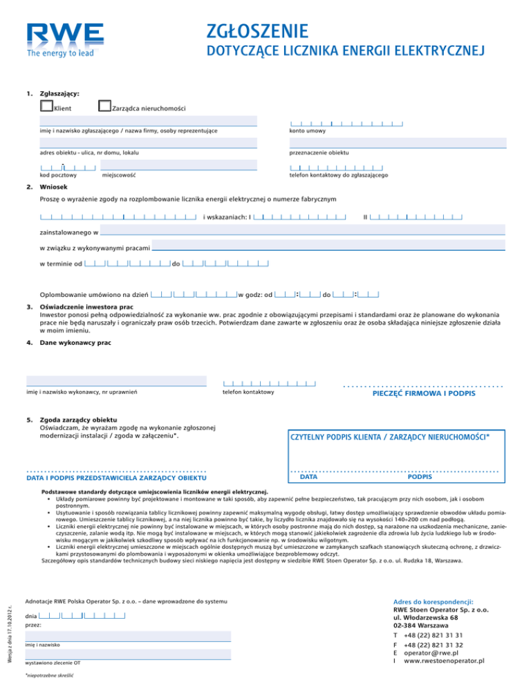 ZGŁOSZENIE DOTYCZĄCE LICZNIKA ENERGII ELEKTRYCZNEJ 1.Zgłaszający: Klient Zarządca nieruchomości imię i nazwisko zgłaszającego / nazwa firmy, osoby reprezentujące adres obiektu - ulica, nr domu, lokalu kod pocztowy miejscowość konto umowy przeznaczenie obiektu telefon kontaktowy do zgłaszającego 2.Wniosek Proszę o wyrażenie zgody na rozplombowanie licznika energii elektrycznej o numerze fabrycznym i wskazaniach: I zainstalowanego w w związku z wykonywanymi pracami w terminie od Oplombowanie umówiono na dzień II do w godz: od do 3. Oświadczenie inwestora prac Inwestor ponosi pełną odpowiedzialność za wykonanie ww. prac zgodnie z obowiązującymi przepisami i standardami oraz że planowane do wykonania prace nie będą naruszały i ograniczały praw osób trzecich. Potwierdzam dane zawarte w zgłoszeniu oraz że osoba składająca niniejsze zgłoszenie działa w moim imieniu. 4. Dane wykonawcy prac imię i nazwisko wykonawcy, nr uprawnień telefon kontaktowy ...................................... PIECZĘĆ FIRMOWA I PODPIS 5. Zgoda zarządcy obiektu Oświadczam, że wyrażam zgodę na wykonanie zgłoszonej modernizacji instalacji / zgoda w załączeniu*. CZYTELNY PODPIS KLIENTA / ZARZĄDCY NIERUCHOMOŚCI* ................................................... DATA I PODPIS PRZEDSTAWICIELA ZARZĄDCY OBIEKTU ........................................................... DATA PODPIS Podstawowe standardy dotyczące umiejscowienia liczników energii elektrycznej. • Układy pomiarowe powinny być projektowane i montowane w taki sposób, aby zapewnić pełne bezpieczeństwo, tak pracującym przy nich osobom, jak i osobom postronnym. • Usytuowanie i sposób rozwiązania tablicy licznikowej powinny zapewnić maksymalną wygodę obsługi, łatwy dostęp umożliwiający sprawdzenie obwodów układu pomiarowego. Umieszczenie tablicy licznikowej, a na niej licznika powinno być takie, by liczydło licznika znajdowało się na wysokości 140÷200 cm nad podłogą. • Liczniki energii elektrycznej nie powinny być instalowane w miejscach, w których osoby postronne mają do nich dostęp, są narażone na uszkodzenia mechaniczne, zanieczyszczenie, zalanie wodą itp. Nie mogą być instalowane w miejscach, w których mogą stanowić jakiekolwiek zagrożenie dla zdrowia lub życia ludzkiego lub w środowisku mogącym w jakikolwiek szkodliwy sposób wpływać na ich funkcjonowanie np. w środowisku wilgotnym. • Liczniki energii elektrycznej umieszczone w miejscach ogólnie dostępnych muszą być umieszczone w zamykanych szafkach stanowiących skuteczną ochronę, z drzwiczkami przystosowanymi do plombowania i wyposażonymi w okienka umożliwiające bezproblemowy odczyt. Szczegółowy opis standardów technicznych budowy sieci niskiego napięcia jest dostępny w siedzibie RWE Stoen Operator Sp. z o.o. ul. Rudzka 18, Warszawa. Wersja z dnia 17.10.2012 r. Adnotacje RWE Polska Operator Sp. z o.o. – dane wprowadzone do systemu dnia przez: imię i nazwisko wystawiono zlecenie OT *niepotrzebne skreślić Adres do korespondencji: RWE Stoen Operator Sp. z o.o. ul. Włodarzewska 68 02-384 Warszawa T +48 (22) 821 31 31 F +48 (22) 821 31 32 [email protected] Iwww.rwestoenoperator.pl