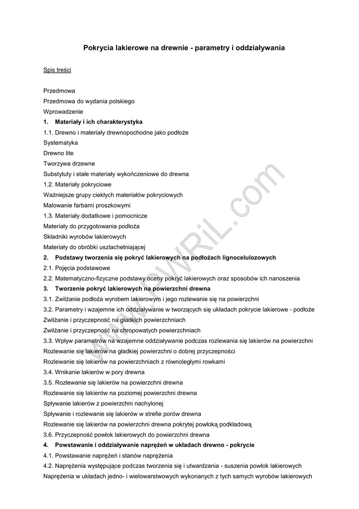 Pokrycia lakierowe na drewnie - parametry i oddziaływania Spis treści Przedmowa Przedmowa do wydania polskiego Wprowadzenie 1. Materiały i ich charakterystyka 1.1. Drewno i materiały drewnopochodne jako podłoŜe Systematyka Drewno lite Tworzywa drzewne Substytuty i stałe materiały wykończeniowe do drewna 1.2. Materiały pokryciowe WaŜniejsze grupy ciekłych materiałów pokryciowych Malowanie farbami proszkowymi 1.3. Materiały dodatkowe i pomocnicze Materiały do przygotowania podłoŜa Składniki wyrobów lakierowych Materiały do obróbki uszlachetniającej 2. Podstawy tworzenia się pokryć lakierowych na podłoŜach lignocelulozowych 2.1. Pojęcia podstawowe 2.2. Matematyczno-fizyczne podstawy oceny pokryć lakierowych oraz sposobów ich nanoszenia 3. Tworzenie pokryć lakierowych na powierzchni drewna 3.1. ZwilŜanie podłoŜa wyrobem lakierowym i jego rozlewanie się na powierzchni 3.2. Parametry i wzajemne ich oddziaływanie w tworzących się układach pokrycie lakierowe - podłoŜe ZwilŜanie i przyczepność na gładkich powierzchniach ZwilŜanie i przyczepność na chropowatych powierzchniach 3.3. Wpływ parametrów na wzajemne oddziaływanie podczas rozlewania się lakierów na powierzchni Rozlewanie się lakierów na gładkiej powierzchni o dobrej przyczepności Rozlewanie się lakierów na powierzchniach z równoległymi rowkami 3.4. Wnikanie lakierów w pory drewna 3.5. Rozlewanie się lakierów na powierzchni drewna Rozlewanie się lakierów na poziomej powierzchni drewna Spływanie lakierów z powierzchni nachylonej Spływanie i rozlewanie się lakierów w strefie porów drewna Rozlewanie się lakierów na powierzchni drewna pokrytej powłoką podkładową 3.6. Przyczepność powłok lakierowych do powierzchni drewna 4. Powstawanie i oddziaływanie napręŜeń w układach drewno - pokrycie 4.1. Powstawanie napręŜeń i stanów napręŜenia 4.2. NapręŜenia występujące podczas tworzenia się i utwardzania - suszenia powłok lakierowych NapręŜenia w układach jedno- i wielowarstwowych wykonanych z tych samych wyrobów lakierowych Wpływ utwardzaczy w lakierach chemoutwardzalnych Kształtowanie się napręŜeń w procesach suszenia i utwardzania powłok lakierowych w róŜnych warunkach klimatycznych NapręŜenia w układzie pokrycie lakierowe - podłoŜe 4.3. NapręŜenia wywołane czynnikami zewnętrznymi Powstawanie napręŜeń pod wpływem temperatury Powstawanie napręŜeń pod wpływem działania wilgotności 4.4. Parametry i ich wzajemne oddziaływanie na mechaniczne właściwości układów drewno - powłoki lakierowe Właściwości mechaniczne błon lakierowych Właściwości mechaniczne powłok i pokryć lakierowych Wpływ podłoŜa na mechaniczne właściwości pokryć lakierowych Wpływ warunków klimatycznych i procesów starzenia na mechaniczne właściwości pokryć lakierowych 5. Właściwości uŜytkowe układów drewno - pokrycie lakierowe i ich oddziaływanie 5.1. Właściwości uŜytkowe, ich znaczenie i badania 5.2. Czynniki wpływające na wady podczas tworzenia się pokryć lakierowych na podłoŜu Wpływ na właściwości dekoracyjne Wpływ obróbki mechanicznej podłoŜa na tworzenie się pokryć lakierowych ObniŜenie jakości wykończonych powierzchni w wyniku inhibitowania procesów suszenia i utwardzania pokryć lakierowych Zmiany właściwości uŜytkowych powłok w wyniku nadmiernego naniesienia wyrobu lakierowego 5.3. Czynniki wpływające na powstawanie wad podczas uŜytkowania i starzenia się pokryć lakierowych Wpływ róŜnych czynników na właściwości ochronne Wpływ czynników mechanicznych Wpływ czynników biologicznych i środowiska Literatura cytowana Literatura dodatkowa Suplement Skorowidz