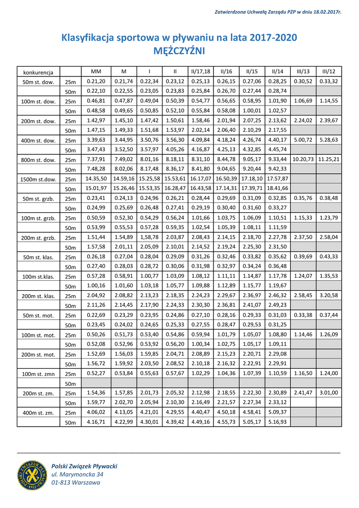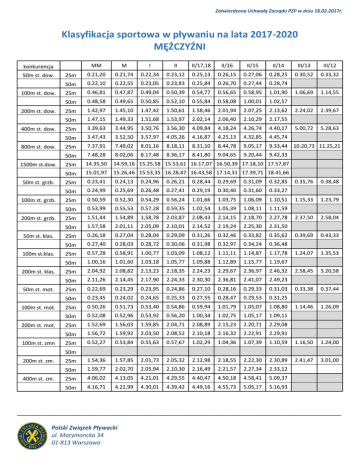Zatwierdzona Uchwałą Zarządu PZP w dniu 18.02.2017r. Klasyfikacja sportowa w pływaniu na lata 2017-2020 MĘŻCZYŹNI MM M I II II/17,18 II/16 II/15 II/14 III/13 III/12 25m 0.21,20 0.21,74 0.22,34 0.23,12 0.25,13 0.26,15 0.27,06 0.28,25 0.30,52 0.33,32 50m 0.22,10 0.22,55 0.23,05 0.23,83 0.25,84 0.26,70 0.27,44 0.28,74 25m 0.46,81 0.47,87 0.49,04 0.50,39 0.54,77 0.56,65 0.58,95 1.01,90 1.06,69 1.14,55 50m 0.48,58 0.49,65 0.50,85 0.52,10 0.55,84 0.58,08 1.00,01 1.02,57 25m 1.42,97 1.45,10 1.47,42 1.50,61 1.58,46 2.01,94 2.07,25 2.13,62 2.24,02 2.39,67 50m 1.47,15 1.49,33 1.51,68 1.53,97 2.02,14 2.06,40 2.10,29 2.17,55 25m 3.39,63 3.44,95 3.50,76 3.56,30 4.09,84 4.18,24 4.26,74 4.40,17 5.00,72 5.28,63 50m 3.47,43 3.52,50 3.57,97 4.05,26 4.16,87 4.25,13 4.32,85 4.45,74 25m 7.37,91 7.49,02 8.01,16 8.18,11 8.31,10 8.44,78 9.05,17 9.33,44 10.20,73 11.25,21 50m 7.48,28 8.02,06 8.17,48 8.36,17 8.41,80 9.04,65 9.20,44 9.42,33 25m 14.35,50 14.59,16 15.25,58 15.53,61 16.17,07 16.50,39 17.18,10 17.57,87 50m 15.01,97 15.26,46 15.53,35 16.28,47 16.43,58 17.14,31 17.39,71 18.41,66 25m 0.23,41 0.24,13 0.24,96 0.26,21 0.28,44 0.29,69 0.31,09 0.32,85 50m 0.24,99 0.25,69 0.26,48 0.27,41 0.29,19 0.30,40 0.31,60 0.33,27 25m 0.50,59 0.52,30 0.54,29 0.56,24 1.01,66 1.03,75 1.06,09 1.10,51 50m 0.53,99 0.55,53 0.57,28 0.59,35 1.02,54 1.05,39 1.08,11 1.11,59 25m 1.51,44 1.54,89 1,58,78 2.03,87 2.08,43 2.14,15 2.18,70 2.27,78 50m 1.57,58 2.01,11 2.05,09 2.10,01 2.14,52 2.19,24 2.25,30 2.31,50 25m 0.26,18 0.27,04 0.28,04 0.29,09 0.31,26 0.32,46 0.33,82 0.35,62 50m 0.27,40 0.28,03 0.28,72 0.30,06 0.31,98 0.32,97 0.34,24 0.36,48 25m 0.57,28 0.58,91 1.00,77 1.03,09 1.08,12 1.11,11 1.14,87 1.17,78 50m 1.00,16 1.01,60 1.03,18 1.05,77 1.09,88 1.12,89 1.15,77 1.19,67 25m 2.04,92 2.08,82 2.13,23 2.18,35 2.24,23 2.29,67 2.36,97 2.46,32 50m 2.11,26 2.14,45 2.17,90 2.24,33 2.30,30 2.36,81 2.41,07 2.49,23 25m 0.22,69 0.23,29 0.23,95 0.24,86 0.27,10 0.28,16 0.29,33 0.31,03 50m 0.23,45 0.24,02 0.24,65 0.25,33 0.27,55 0.28,47 0.29,53 0.31,25 25m 0.50,26 0.51,73 0.53,40 0.54,86 0.59,94 1.01,79 1.05,07 1.08,80 50m 0.52,08 0.52,96 0.53,92 0.56,20 1.00,34 1.02,75 1.05,17 1.09,11 25m 1.52,69 1.56,03 1.59,85 2.04,71 2.08,89 2.15,23 2.20,71 2.29,08 50m 1.56,72 1.59,92 2.03,50 2.08,52 2.10,18 2.16,32 2.22,91 2.29,91 25m 0.52,27 0.53,84 0.55,63 0.57,67 1.02,29 1.04,36 1.07,39 25m 1.54,36 1.57,85 2.01,73 2.05,32 2.12,98 2.18,55 50m 1.59,77 2.02,70 2.05,94 2.10,30 2.16,49 25m 4.06,02 4.13,05 4.21,01 4.29,55 50m 4.16,71 4.22,99 4.30,01 4.39,42 konkurencja 50m st. dow. 100m st. dow. 200m st. dow. 400m st. dow. 800m st. dow. 1500m st.dow. 50m st. grzb. 100m st. grzb. 200m st. grzb. 50m st. klas. 100m st.klas. 200m st. klas. 50m st. mot. 100m st. mot. 200m st. mot. 100m st. zmn 0.35,76 0.38,48 1.15,33 1.23,79 2.37,50 2.58,04 0.39,69 0.43,33 1.24,07 1.35,53 2.58,45 3.20,58 0.33,38 0.37,44 1.14,46 1.26,09 1.10,59 1.16,50 1.24,00 2.22,30 2.30,89 2.41,47 3.01,00 2.21,57 2.27,34 2.33,12 4.40,47 4.50,18 4.58,41 5.09,37 4.49,16 4.55,73 5.05,17 5.16,93 50m 200m st. zm. 400m st. zm. __________________________________________________________________________________________________ Polski Związek Pływacki ul. Marymoncka 34 01-813 Warszawa