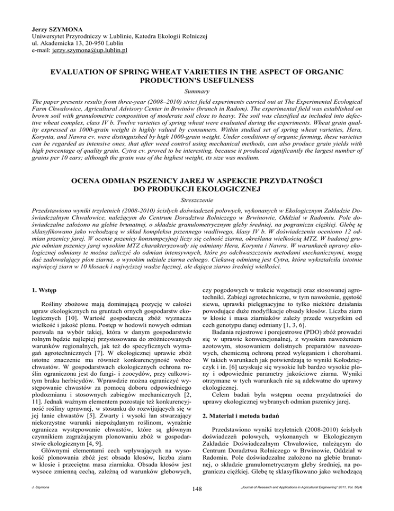 Jerzy SZYMONA Uniwersytet Przyrodniczy w Lublinie, Katedra Ekologii Rolniczej ul. Akademicka 13, 20-950 Lublin e-mail: [email protected] EVALUATION OF SPRING WHEAT VARIETIES IN THE ASPECT OF ORGANIC PRODUCTION'S USEFULNESS Summary The paper presents results from three-year (2008–2010) strict field experiments carried out at The Experimental Ecological Farm Chwałowice, Agricultural Advisory Center in Brwinów (branch in Radom). The experimental field was established on brown soil with granulometric composition of moderate soil close to heavy. The soil was classified as included into defective wheat complex, class IV b. Twelve varieties of spring wheat were evaluated during the experiments. Wheat grain quality expressed as 1000-grain weight is highly valued by consumers. Within studied set of spring wheat varieties, Hera, Korynta, and Nawra cv. were distinguished by high 1000-grain weight. Under conditions of organic farming, these varieties can be regarded as intensive ones, that after weed control using mechanical methods, can also produce grain yields with high percentage of quality grain. Cytra cv. proved to be interesting, because it produced significantly the largest number of grains per 10 ears; although the grain was of the highest weight, its size was medium. OCENA ODMIAN PSZENICY JAREJ W ASPEKCIE PRZYDATNOŚCI DO PRODUKCJI EKOLOGICZNEJ Streszczenie Przedstawiono wyniki trzyletnich (2008-2010) ścisłych doświadczeń polowych, wykonanych w Ekologicznym Zakładzie Doświadczalnym Chwałowice, należącym do Centrum Doradztwa Rolniczego w Brwinowie, Oddział w Radomiu. Pole doświadczalne założono na glebie brunatnej, o składzie granulometrycznym gleby średniej, na pograniczu ciężkiej. Glebę tę sklasyfikowano jako wchodzącą w skład kompleksu pszennego wadliwego, klasy IV b. W doświadczeniu oceniono 12 odmian pszenicy jarej. W ocenie pszenicy konsumpcyjnej liczy się celność ziarna, określana wielkością MTZ. W badanej grupie odmian pszenicy jarej wysokim MTZ charakteryzowały się odmiany Hera, Korynta i Nawra. W warunkach uprawy ekologicznej odmiany te można zaliczyć do odmian intensywnych, które po odchwaszczeniu metodami mechanicznymi, mogą dać zadowalający plon ziarna, o wysokim udziale ziarna celnego. Ciekawą odmianą jest Cytra, która wykształciła istotnie najwięcej ziarn w 10 kłosach i najwyższej wadze łącznej, ale dająca ziarno średniej wielkości. czy pogodowych w trakcie wegetacji oraz stosowanej agrotechniki. Zabiegi agrotechniczne, w tym nawożenie, gęstość siewu, uprawki pielęgnacyjne to tylko niektóre działania powodujące duże modyfikacje obsady kłosów. Liczba ziarn w kłosie i masa ziarniaków zależy przede wszystkim od cech genotypu danej odmiany [1, 3, 6]. Badania rejestrowe i porejestrowe (PDO) zbóż prowadzi się w uprawie konwencjonalnej, z wysokim nawożeniem azotowym, stosowaniem dolistnych preparatów nawozowych, chemiczną ochroną przed wyleganiem i chorobami. W takich warunkach jak potwierdzają to wyniki Kołodziejczyk i in. [6] uzyskuje się wysokie lub bardzo wysokie plony i odpowiednie parametry jakościowe ziarna. Wyniki otrzymane w tych warunkach nie są adekwatne do uprawy ekologicznej. Celem badań była wstępna ocena przydatności do uprawy ekologicznej wybranych odmian pszenicy jarej. 1. Wstęp Rośliny zbożowe mają dominującą pozycję w całości upraw ekologicznych na gruntach ornych gospodarstw ekologicznych [10]. Wartość gospodarczą zbóż wyznacza wielkość i jakość plonu. Postęp w hodowli nowych odmian pozwala na wybór takiej, która w danym gospodarstwie rolnym będzie najlepiej przystosowana do zróżnicowanych warunków regionalnych, jak też do specyficznych wymagań agrotechnicznych [7]. W ekologicznej uprawie zbóż istotne znaczenie ma również konkurencyjność wobec chwastów. W gospodarstwach ekologicznych ochrona roślin ograniczona jest do fungi- i zoocydów, przy całkowitym braku herbicydów. Wprawdzie można ograniczyć występowanie chwastów za pomocą doboru odpowiedniego płodozmianu i stosownych zabiegów mechanicznych [2, 11]. Jednak ważnym elementem pozostaje też konkurencyjność rośliny uprawnej, w stosunku do rozwijających się w jej łanie chwastów [5]. Zwarty i wysoki łan stwarzający niekorzystne warunki niepożądanym roślinom, wyraźnie ogranicza występowanie chwastów, które są głównym czynnikiem zagrażającym plonowaniu zbóż w gospodarstwie ekologicznym [4, 9]. Głównymi elementami cech wpływających na wysokość plonowania zbóż jest obsada kłosów, liczba ziarn w kłosie i przeciętna masa ziarniaka. Obsada kłosów jest wysoce zmienną cechą, zależną od warunków glebowych, J. Szymona 2. Materiał i metoda badań Przedstawiono wyniki trzyletnich (2008-2010) ścisłych doświadczeń polowych, wykonanych w Ekologicznym Zakładzie Doświadczalnym Chwałowice, należącym do Centrum Doradztwa Rolniczego w Brwinowie, Oddział w Radomiu. Pole doświadczalne założono na glebie brunatnej, o składzie granulometrycznym gleby średniej, na pograniczu ciężkiej. Glebę tę sklasyfikowano jako wchodzącą 148 „Journal of Research and Applications in Agricultural Engineering” 2011, Vol. 56(4) w skład kompleksu pszennego wadliwego, klasy IV b. Ocenie poddano następujące odmiany pszenicy jarej: Hera, Henika, Broma, Eta, Emitent, Torka, Thassos, Ostka Złotnicka, Cytra, Trios, Korynta, Nawra. Odmiany te uprawiano w następującym płodozmianie: 1. lucerna z trawami, 2. lucerna z trawami, 3. lucerna z trawami , 4. lucerna z trawami, 5. zboża jare, 6. strączkowe, 7. zboża ozime + wsiewka lucerny z trawami. Sezony wegetacyjne, w których prowadzono doświadczenie były cieplejsze, z większą sumą opadów, w porównaniu do średniej wieloletniej. Porównując poszczególne okresy wegetacji najcieplejszym okazał się w 2009 roku, w którym było najmniej opadów w stosunku do lat 2008 i 2010 (tab. 1). 3. Wyniki badań Ważną c