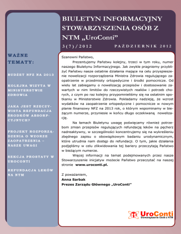 BIULETYN INFORMACYJNY STOWARZYSZENIA OSÓB Z NTM „UroConti” 3(7)/2012 WAŻNE PA Ź D Z I E R N I K 2 0 1 2 Szanowni Państwo, TEMATY: Prezentujemy Państwu kolejny, trzeci w tym roku, numer naszego Biuletynu Informacyjnego. Jak zwykle pragniemy przybli- BUDŻET NFZ NA 2013 żyć Państwu nasze ostatnie działania mające na celu przyspieszenie nowelizacji rozporządzenia Ministra Zdrowia regulującego zaopatrzenie w przedmioty ortopedyczne i środki pomocnicze. Od KOLEJNA WIZYTA W MINISTERSTWIE wielu lat zabiegamy o nowelizację przepisów i dostosowanie za- ZDROWIA rych, z czym po raz kolejny przypomnieliśmy się na ostatnim spo- wartych w nim limitów do rzeczywistych realiów i potrzeb chotkaniu w Ministerstwie Zdrowia. Pokładamy nadzieję, że wzrost JAKA JEST RZECZYWISTA REFUNDACJA ŚRODKÓW ABSORPCYJNYCH? wydatków na zaopatrzenie ortopedyczne i pomocnicze w nowym planie finansowy NFZ na 2013 rok, o którym wspominamy w bieżącym numerze, przyniesie w końcu długo oczekiwaną nowelizację. Na łamach Biuletynu uwagę poświęcamy również potrzebom zmian przepisów regulujących refundację leków na pęcherz PROJEKT ROZPORZĄ- nadreaktywny, w szczególności koncentrujemy się na wykreśleniu DZENIA O WZORZE zbędnego zapisu o obowiązkowym badaniu urodynamicznym, ZAOPATRZENIA – NASZE UWAGI które utrudnia nam dostęp do refundacji. O tym, jakie działania podjęliśmy w celu zlikwidowania tej bariery przeczytają Państwo w bieżącym numerze. SEKCJA PROSTATY W UROCONTI Więcej informacji na temat podejmowanych przez nasze Stowarzyszenie inicjatyw możecie Państwo przeczytać na naszej stronie www.uroconti.pl. REFUNDACJA LEKÓW NA NTM Z poważaniem, Anna Sarbak Prezes Zarządu Głównego „UroConti” STR. 2 3(7)/2012 Budżet NFZ na 2013, więcej środków na zaopatrzenie ortopedyczne i pomocnicze!!! W sierpniu Ministerstwo Zdrowia w porozumieniu z Ministrem Finansów zatwierdziło plan finansowy NFZ na 2013r. W przyszłorocznym planie, NFZ zwiększył wydatki na opiekę zdrowotną o 2,3 mld złotych w porównaniu do roku bieżącego, w tym największy procentowy wzrost wydatków przewidziano na sfinansowanie zaopatrzenia w sprzęt ortopedyczny i środki pomocnicze. Z planu wynika, że NFZ zakłada wzrost wydatków na zaopatrzenie nawet o 223,5 mln złotych więcej, co w porównaniu do budżetu na 2012r. stanowi wzrost o ok. 34%. Jest to najwyższy od lat wzrost wydatków na zaopatrzenie. Dotychczasowe zmiany ograniczały się zazwyczaj do kilku procent w stosunku do poprzedniego roku. Niezmiernie ucieszyła nas ta wiadomość. Mamy nadzieję, że tak duży wzrost wydatków na zaopatrzenie ortopedyczne i pomocnicze może zapowiadać wyczekiwaną od lat nowelizację rozporządzenia regulującego zaopatrzenie. Dzięki większym możliwościom finansowym w budżecie NFZ, rosną szanse na zbliżenie nas do europejskich poziomów. Wierzymy, że głoszone przez nas postulaty dotyczące zwiększenia limitów ilościowych refundowanych środków absorpcyjnych czy wprowadzenia jednostki chorobowej nietrzymanie moczu uprawniającej do otrzymania refundacji, w takiej sytuacji mają większą szanse na uwzględnienie w znowelizowanym projekcie rozporządzenia Ministerstwa Zdrowia. Wierzymy, że plan na 2013 rok przełoży się na realną poprawę sytuacji osób korzystających z zaopatrzenia w środki absorpcyjne i w niedalekiej przyszłości będziemy mogli je otrzymywać, w ilości zaspokajającej nasze codzienne potrzeby. 3(7)/2012 Kolejna wizyta w Ministerstwie Zdrowia W sierpniu po raz kolejny mieliśmy okazję uczestniczyć w spotkaniu z przedstawicielami Ministerstwa Zdrowia. Zaproszenie na spotkanie otrzymaliśmy z Departamentu Polityki Lekowej i Farmacji, który odpowiedzialny jest za prace nad nowelizacją rozporządzenia dotyczącego zaopatrzenia w przedmioty ortopedyczne i środki pomocnicze. Każde takie zaproszenie jest dla naszej organizacji szansą na zwrócenie uwagi urzędników na potrzeby osób z nietrzymaniem moczu oraz okazją do przypomnienia się Ministerstwu z naszymi propozycjami zmian rozporządzenia regulującego zaopatrzenie w środki pomocnicze. Ministerstwo wydelegowało na spotkanie dyrektora Departamentu Polityki Lekowej oraz Farmacji oraz Naczelnika Wydziału Wyrobów Medycznych. Naszą organizację reprezentował 3 osobowy zespół: Anna Sar- Tytuł bak, Barbara Woźniak, oraz Teresa Bodzak - przedstawicielka oddziału lubelskiego. Choć spotkanie nie trwało długo, udało się nam poruszyć szereg tematów dotyczących problematyki dostępu do leczenia oraz zaopatrzenia pomocniczego dla osób z nietrzymaniem moczu. Po raz kolejny zaprezentowałyśmy urzędnikom nasze postulaty: zmianę kryterium chorobowego na nietrzymanie moczu, poszerzenie listy lekarzy uprawnionych do wypisywania zleceń na środki absorpcyjne o ginekologa i geriatrę, wprowadzenie przy refundacji zróżnicowania w zależności od stopnia nietrzymania moczu: stopień lekki (nie podlega refundacji), stopień średni – refundacja do 60 sztuk wkładów urologicznych, pieluch anatomicznych, pieluchomajtek, w tym majtek chłonnych, zamiennie, stopień ciężki – refundacja do 90 sztuk pieluch anatomicznych, pieluchomajtek, w tym majtek chłonnych, zamiennie. STR. 3 STR. 4 3(7)/2012 Kolejna wizyta w Ministerstwie Zdrowia c.d. Korzystając z okazji zwróciłyśmy uwagę, że obowiązujące przepisy nie były nowelizowane już ponad 13 lat, a zawarte w nich limity mocno odbiegają od rzeczywistych kosztów ponoszonych przez chorych. Podkreśliłyśmy również, że środowisko osób niepełnosprawnych i przewlekle chorych wielokrotnie apelowało o nowelizację rozporządzenia, mimo to projekt nadal nie ukazał się w konsultacjach społecznych. W odpowiedzi na nasze postulaty, urzędnicy poinformowali nas, iż resort zdrowia nieustannie pracuje nad nowelizacją rozporządzenia. Dotychczas zostało przygotowanych już kilka projektów, które finalnie zostały odrzucone przez w
