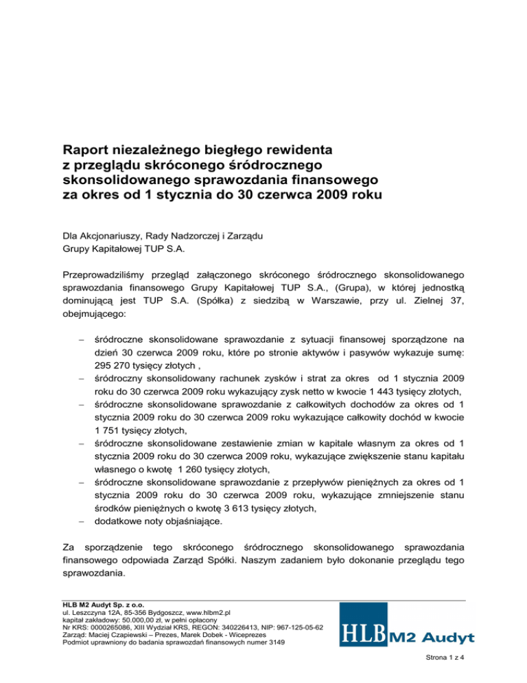 Raport niezaleŜnego biegłego rewidenta z przeglądu skróconego śródrocznego skonsolidowanego sprawozdania finansowego za okres od 1 stycznia do 30 czerwca 2009 roku Dla Akcjonariuszy, Rady Nadzorczej i Zarządu Grupy Kapitałowej TUP S.A. Przeprowadziliśmy przegląd załączonego skróconego śródrocznego skonsolidowanego sprawozdania finansowego Grupy Kapitałowej TUP S.A., (Grupa), w której jednostką dominującą jest TUP S.A. (Spółka) z siedzibą w Warszawie, przy ul. Zielnej 37, obejmującego: − − − − − − śródroczne skonsolidowane sprawozdanie z sytuacji finansowej sporządzone na dzień 30 czerwca 2009 roku, które po stronie aktywów i pasywów wykazuje sumę: 295 270 tysięcy złotych , śródroczny skonsolidowany rachunek zysków i strat za okres od 1 stycznia 2009 roku do 30 czerwca 2009 roku wykazujący zysk netto w kwocie 1 443 tysięcy złotych, śródroczne skonsolidowane sprawozdanie z całkowitych dochodów za okres od 1 stycznia 2009 roku do 30 czerwca 2009 roku wykazujące całkowity dochód w kwocie 1 751 tysięcy złotych, śródroczne skonsolidowane zestawienie zmian w kapitale własnym za okres od 1 stycznia 2009 roku do 30 czerwca 2009 roku, wykazujące zwiększenie stanu kapitału własnego o kwotę 1 260 tysięcy złotych, śródroczne skonsolidowane sprawozdanie z przepływów pienięŜnych za okres od 1 stycznia 2009 roku do 30 czerwca 2009 roku, wykazujące zmniejszenie stanu środków pienięŜnych o kwotę 3 613 tysięcy złotych, dodatkowe noty objaśniające. Za sporządzenie tego skróconego śródrocznego skonsolidowanego sprawozdania finansowego odpowiada Zarząd Spółki. Naszym zadaniem było dokonanie przeglądu tego sprawozdania. HLB M2 Audyt Sp. z o.o. ul. Leszczyna 12A, 85-356 Bydgoszcz, www.hlbm2.pl kapitał zakładowy: 50.000,00 zł, w pełni opłacony Nr KRS: 0000265086, XIII Wydział KRS, REGON: 340226413, NIP: 967-125-05-62 Zarząd: Maciej Czapiewski – Prezes, Marek Dobek - Wiceprezes Podmiot uprawniony do badania sprawozdań finansowych numer 3149 Strona 1 z 4 Przegląd przeprowadziliśmy stosownie do obowiązujących w Polsce przepisów prawa oraz norm wykonywania zawodu biegłego rewidenta, wydanych przez Krajową Radę Biegłych Rewidentów. Normy nakładają na nas obowiązek zaplanowania i przeprowadzenia przeglądu w taki sposób, aby uzyskać umiarkowaną pewność, Ŝe skonsolidowane sprawozdanie finansowe nie zawiera istotnych nieprawidłowości. Przeglądu dokonaliśmy głównie drogą analizy danych skróconego śródrocznego skonsolidowanego sprawozdania finansowego, wglądu w dokumentację konsolidacyjną oraz wykorzystania informacji uzyskanych od Zarządu Spółki oraz osób odpowiedzialnych za finanse i rachunkowość Grupy. Zakres i metoda przeglądu skonsolidowanego sprawozdania finansowego istotnie róŜni się od badań leŜących u podstaw opinii wyraŜanej o rzetelności, prawidłowości i jasności sprawozdania finansowego, dlatego nie moŜemy wydać takiej opinii o załączonym skróconym śródrocznym sprawozdaniu finansowym. Dokonany przez nas przegląd nie wykazał potrzeby dokonania istotnych zmian w załączonym skróconym śródrocznym skonsolidowanym sprawozdaniu finansowym, aby przedstawiało ono prawidłowo, rzetelnie i jasno sytuację majątkową i finansową Grupy na dzień 30 czerwca 2009 roku oraz jej wynik finansowy za okres od 1 stycznia 2009 roku do 30 czerwca 2009 roku, zgodnie z Międzynarodowymi Standardami Rachunkowości, Międzynarodowymi Standardami Sprawozdawczości Finansowej oraz związanymi z nimi interpretacjami ogłoszonymi w formie rozporządzeń wykonawczych Komisji Europejskiej i mającymi zastosowanie do sprawozdawczości śródrocznej. Nie zgłaszając konieczności dokonywania zmian w załączonym śródrocznym, skonsolidowanym sprawozdaniu finansowym, zwracamy uwagę na następujące kwestie: − Śródroczne sprawozdania finansowe spółek zaleŜnych Euroconstruction Sp. z o.o, Roda Sp. z o.o., Tanis Investments Sp. z o.o., Chmielowskie Sp. z o.o., System SL Sp. z o.o., Data Logistic Sp. z o.o., Port Jachtowy Nieporęt Sp. z o.o., TG Investment Sp. z o.o. objęte skonsolidowanym sprawozdaniem finansowym nie były poddane przeglądowi przez biegłych rewidentów. W odniesieniu do istotnych dla skonsolidowanego sprawozdania finansowego aktywów i pasywów Tanis Investments Sp. z o.o., System SL Sp. z o.o. oraz Chmielowskie Sp. z o.o. przeprowadziliśmy procedury analogiczne do procedur stosowanych przy przeglądzie sprawozdania finansowego. Dane finansowe pozostałych wspomnianych Spółek nie są istotne dla sprawozdania finansowego, w szczególności skumulowana wielkość sum bilansowych tych Spółek, przed wyłączeniami konsolidacyjnymi, stanowi 3 % sumy bilansowej skonsolidowanego sprawozdania finansowego Grupy Kapitałowej bez dokonywania wyłączeń konsolidacyjnych oraz skumulowana wielkość kapitałów własnych tych Spółek stanowi 0,5% kapitału własnego skonsolidowanego Dotyczy: Grupa Kapitałowa TUP S.A. Strona 2 z 4 sprawozdania finansowego konsolidacyjnych. Grupy Kapitałowej bez dokonywania wyłączeń − Inwestycje w nieruchomości wyceniane są w Grupie Kapitałowej TUP S.A. w wartościach godziwych, co bezpośrednio wpływa na wynik finansowy i wartość kapitałów własnych. Wartość godziwa nieruchomości inwestycyjnych nie będących przedmiotem wynajmu została ustalona w drodze wyceny przez niezaleŜnych rzeczoznawców na dzień 30 listopada 2008 roku i dokonywana jest raz na rok (następna wycena odbędzie się na koniec 2009 roku). Wartość godziwa nieruchomości będących przedmiotem lub przeznaczonych na wynajem została ustalona przez Spółki Grupy Kapitałowej samodzielnie i została zaktualizowana na dzień 30 czerwca 2009 roku. Metodologię samodzielnej wyceny oraz jej załoŜenia przedstawiono w dodatkowej nocie 9 do skonsolidowanego sprawozdania finansowego. − W skonsolidowanych naleŜnościach krótkoterminowych