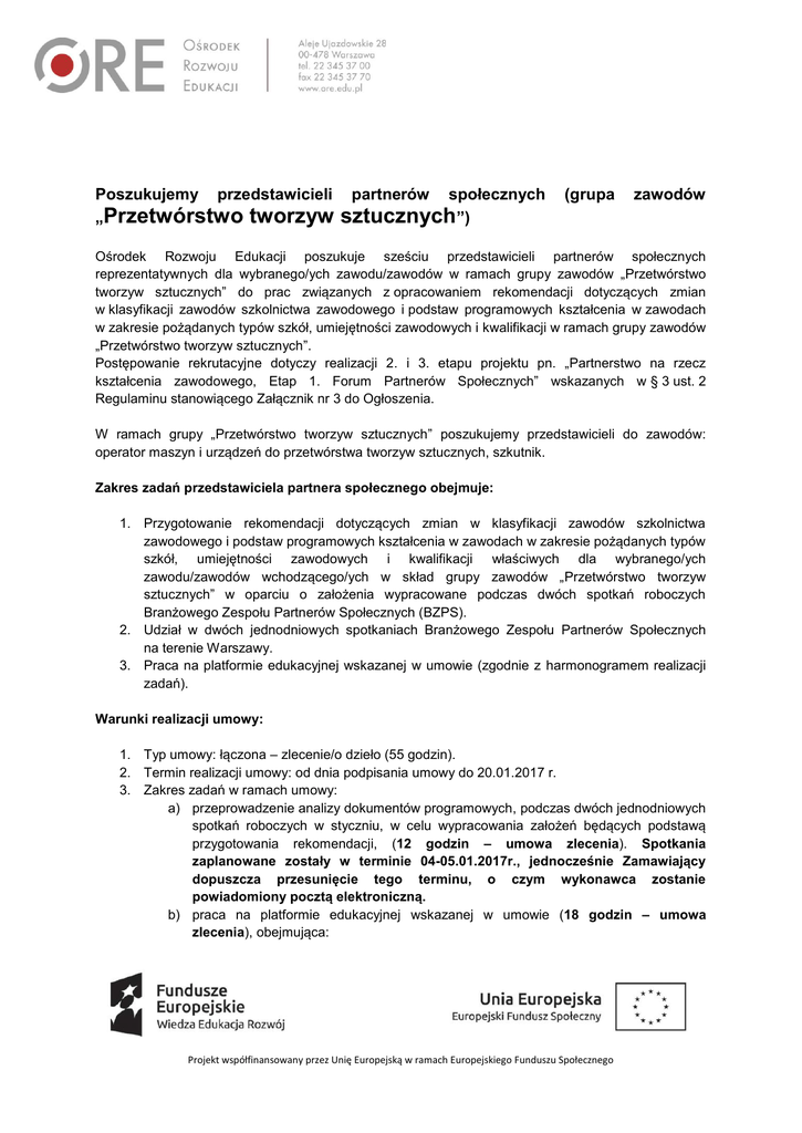 Poszukujemy przedstawicieli „Przetwórstwo tworzyw partnerów społecznych sztucznych”) (grupa zawodów Ośrodek Rozwoju Edukacji poszukuje sześciu przedstawicieli partnerów społecznych reprezentatywnych dla wybranego/ych zawodu/zawodów w ramach grupy zawodów „Przetwórstwo tworzyw sztucznych” do prac związanych z opracowaniem rekomendacji dotyczących zmian w klasyfikacji zawodów szkolnictwa zawodowego i podstaw programowych kształcenia w zawodach w zakresie pożądanych typów szkół, umiejętności zawodowych i kwalifikacji w ramach grupy zawodów „Przetwórstwo tworzyw sztucznych”. Postępowanie rekrutacyjne dotyczy realizacji 2. i 3. etapu projektu pn. „Partnerstwo na rzecz kształcenia zawodowego, Etap 1. Forum Partnerów Społecznych” wskazanych w § 3 ust. 2 Regulaminu stanowiącego Załącznik nr 3 do Ogłoszenia. W ramach grupy „Przetwórstwo tworzyw sztucznych” poszukujemy przedstawicieli do zawodów: operator maszyn i urządzeń do przetwórstwa tworzyw sztucznych, szkutnik. Zakres zadań przedstawiciela partnera społecznego obejmuje: 1. Przygotowanie rekomendacji dotyczących zmian w klasyfikacji zawodów szkolnictwa zawodowego i podstaw programowych kształcenia w zawodach w zakresie pożądanych typów szkół, umiejętności zawodowych i kwalifikacji właściwych dla wybranego/ych zawodu/zawodów wchodzącego/ych w skład grupy zawodów „Przetwórstwo tworzyw sztucznych” w oparciu o założenia wypracowane podczas dwóch spotkań roboczych Branżowego Zespołu Partnerów Społecznych (BZPS). 2. Udział w dwóch jednodniowych spotkaniach Branżowego Zespołu Partnerów Społecznych na terenie Warszawy. 3. Praca na platformie edukacyjnej wskazanej w umowie (zgodnie z harmonogramem realizacji zadań). Warunki realizacji umowy: 1. Typ umowy: łączona – zlecenie/o dzieło (55 godzin). 2. Termin realizacji umowy: od dnia podpisania umowy do 20.01.2017 r. 3. Zakres zadań w ramach umowy: a) przeprowadzenie analizy dokumentów programowych, podczas dwóch jednodniowych spotkań roboczych w styczniu, w celu wypracowania założeń będących podstawą przygotowania rekomendacji, (12 godzin – umowa zlecenia). Spotkania zaplanowane zostały w terminie 04-05.01.2017r., jednocześnie Zamawiający dopuszcza przesunięcie tego terminu, o czym wykonawca zostanie powiadomiony pocztą elektroniczną. b) praca na platformie edukacyjnej wskazanej w umowie (18 godzin – umowa zlecenia), obejmująca: Projekt współfinansowany przez Unię Europejską w ramach Europejskiego Funduszu Społecznego – przekazanie wniosków i uwag wynikających z analizy dokumentów programowych wskazanych w pkt.3 lit. a), – wypracowywanie uwag i wniosków (z pomocą narzędzia elektronicznego – ankieta online) będących podstawą przygotowania rekomendacji, – udzielanie informacji będących podstawą opracowania Raportu z prac zespołu branżowego przez moderatora; c) przygotowanie rekomendacji dotyczących zmian w klasyfikacji zawodów szkolnictwa zawodowego i podstaw programowych kształcenia w zawodach w zakresie pożądanych typów szkół, umiejętności zawodowych i kwalifikacji właściwych dla wybranego/ych zawodu/zawodów wchodzącego/ych w skład grupy zawodów „Przetwórstwo tworzyw sztucznych”, w oparciu o założenia wypracowane podczas dwóch spotkań roboczych Branżowych Zespołów Partnerów Społecznych (BZPS) oraz wypracowane uwagi i wnioski na platformie edukacyjnej wskazanej w umowie, według szablonu w załączniku do umowy (25 godzin – umowa o dzieło). 4. Warunki finansowe: Na podstawie wniosku o dofinansowanie projektu Zamawiający określa następujący maksymalny limit kosztów na poszczególne wydatki związane z opisanym zadaniem: realizacja przedmiotu umowy: 50 zł/godzina * 55 h = 2750 zł/os. Informacje uzupełniające: 1. Wykonawcy zobowiązani będą do przedstawiania oświadczenia w postaci protokołu o faktycznej liczbie godzin, którą przeznaczyli na realizację umowy w ujęciu miesięcznym oraz poświadczą, że łączna miesięczna liczba godzin zadań realizowanych w ramach wszystkich projektów finansowanych z funduszy strukturalnych i Funduszu Spójności oraz zadań finansowanych z innych źródeł, obejmujących okres realizacji umowy zawartej z ORE nie przekracza łącznie 276 godzin miesięcznie. Jednocześnie wykonawca będzie zobowiązany do złożenia oświadczenia, że obciążenie zawodowe nie wyklucza możliwości prawidłowej i efektywnej realizacji wszystkich zadań powierzonych mu w ramach projektu. 2. W ramach spotkań określonych w pkt 3 Zakresu zadań przedstawiciela partnera społecznego Zamawiający zapewnia i finansuje nocleg przed każdym spotkaniem oraz wyżywienie w trakcie każdego spotkania i zwraca koszty podróży uczestnikom każdego spotkania (do 200 zł - zgodnie z cennikiem biletów II klasy). 3. Spotkania BZPS odbywać się będą w weekendy. Zamawiający zastrzega sobie możliwość zmiany terminów spotkań (zgodnie z harmonogramem realizacji zadań). Zamawiający zastrzega sobie możliwość niewyłonienia Wykonawców bez podania przyczyny. Wymagania stawiane Wykonawcy Wymagania obowiązkowe (oceniane: spełnia/ nie spełnia): 1. Min. 3-letnie doświadczenie zawodowe w wybranym/ych zawodzie/zawodach w ramach grupy zawodów „Przetwórstwo tworzyw sztucznych”. Projekt współfinansowany przez Unię Europejską w ramach Europejskiego Funduszu Społecznego 2. Wykształcenie zawodowe co najmniej zasadnicze/średnie w wybranym/ych zawodzie/zawodach w ramach grupy zawodów „Przetwórstwo tworzyw sztucznych”. 3. Rekomendacja co najmniej jednego partnera społecznego, reprezentatywnego dla wybranego/ych zawodu/zawodów w ramach grupy zawodowej „Przetwórstwo tworzyw sztucznych”. 4. Średnie miesięczne zaangażowanie w realizację zadań we wszystkich projektach finansowanych z funduszy strukturalnych i Funduszu Spójności oraz z zadań finansowanych z innych źródeł (w tym umo