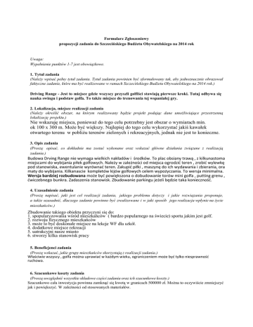 Formularz Zgłoszeniowy propozycji zadania do Szczecińskiego Budżetu Obywatelskiego na 2014 rok Uwaga: Wypełnienie punktów 1-7 jest obowiązkowe. 1. Tytuł zadania (Należy wpisać pełny tytuł zadania. Tytuł zadania powinien być sformułowany tak, aby jednoznacznie obrazował faktyczne zadanie, które ma być realizowane w ramach Szczecińskiego Budżetu Obywatelskiego na 2014 rok.) Driving Range - Jest to miejsce gdzie wszyscy przyszli golfiści stawiają pierwsze kroki. Tutaj odbywa się nauka swingu i podstaw golfa. To także miejsce do trenowania tej wspaniałej gry. 2. Lokalizacja, miejsce realizacji zadania (Należy określić obszar, na którym realizowany będzie projekt podając dane umożliwiające przestrzenną lokalizację projektu.) Nie wskazuję miejsca, ponieważ do tego celu potrzebny jest obszar o wymiarach min. ok 100 x 300 m. Może być większy. Najlepiej do tego celu wykorzystać jakiś kawałek otwartego terenu w pobliżu terenów zielonych i rekreacyjnych, jednak nie jest to konieczne. 3. Opis zadania (Proszę opisać, co dokładnie ma zostać wykonane oraz wskazać główne działania związane z realizacją zadania.) Budowa Drving Range nie wymaga wielkich nakładów i środków. To plac obsiany trawą , z kilkunastoma miejscami do wybijania piłek golfowych. Należy w zależności od miejsca ogrodzić teren , zrobić wylewkę pod stanowiska, ewentulanie wyrównać teren. Zakupić piłki , maszynę do ich wydawania i zbierania, ora maty do wybijania. Kilkanascie kompletów kijów golfowych celem wypożyczania. To wersja minimalna. Wersja bardziej rozbudowana może być powiększona o dobudowanie torów mini golfa , putting grenu , ćwiczebnego bunkra. Zadaszenia stanowisk. Zbudowanie parkingu jeżeli będzie taka konieczność. 4. Uzasadnienie zadania (Proszę napisać, jaki jest cel realizacji zadania, jakiego problemu dotyczy i jakie rozwiązania proponuje, a także uzasadnić, dlaczego zadanie powinno być zrealizowane i w jaki sposób jego realizacja wpłynie na życie mieszkańców.) Zbudowanie takiego obiektu przyczyni się do: 1. spopularyzowania wśród mieszkańców ( bardzo popularnego na świecie) sportu jakim jest golf. 2. rozwoju fizycznego mieszkańców 3. może to być doskonałe miejsce na lekcje WF dla szkół. 4. dodatkowe miejsce rekreacji 5. uatrakcyjni nasze miasto 6. stworzy kilka stanowisk pracy 5. Beneficjenci zadania (Proszę wskazać, jakie grupy mieszkańców skorzystają z realizacji zadania.) Właściwie wszyscy , golfa można uprawiać w każdym wieku, ograniczeniem może być tylko niesprawność ruchowa. 6. Szacunkowe koszty zadania (Proszę uwzględnić wszystkie składowe części zadania oraz ich szacunkowe koszty.) Szacunkowo cała inwestycja powinna zamknąć się kwotą w granicach 500000 zł. Można to oczywiście zmniejszyć jak i powiększyć. W zależności od stosowanych materiałów. Składowe części zadania Koszt 1.Mata do wybijania Classic Range Mat SQUARE 295,00 euro/szt. Ilość mat zależy od ilości stanowisk 3 300,00 euro/szt 2.Maszyna do zbierania piłek 3. Kije golfowe cena zestawu zleży od ilości stanowisk, orientacyjna cena 500 zł 1 kompletu z torbą 4. maszyna do wydawania piłek + piłki cena w zależności od ilości piłek orientacyjna cena piłki obok. Potrszeba ok. 10.000 piłek Od 2 do 6 zł za sztukę 5. Kosiarka do trawy 6000 zł Zbyt mało jest rubryk i trudno zawrzeć wszystkie czynności które należy wykonać. Wiele kosztów poznamy dopiero w momencie wskazania lokalizacji. Np. obszar do obsiania, budowa pawilonu czy magazynu na kije według projektu, itp. Szczegółowy kosztorys można sporządzić dopiero w momencie posiadania pełnych danych. Przyjąłem kwotę 500000 czyli 10% całego budżetu. Kwota ta zapewne będzie niższa. Zależy to jednak od rozmachu i potrzebnych materiałów. Łącznie: 500000 zł 7. Kontakt do autorów propozycji zadania Imię i nazwisko, adres zamieszkania Kontakt (e-mail, telefon) 8. Dodatkowe załączniki (nieobowiązkowe): a) zdjęcie/a dotyczące zgłaszanego zadania; b) mapa z zaznaczeniem lokalizacji zgłaszanego zadania; c) inne, istotne dla zgłaszanego zadania, jakie? (proszę wymienić) Dane osobowe zbierane i przetwarzane są na podstawie art. 23. ust. 1 pkt 4) ustawy z dnia 29 sierpnia 1997 r. o ochronie danych osobowych (tj. Dz. U. 2002 Nr 101, poz. 926) w celu: X X Przeprowadzenia konsultacji społecznych w ramach Szczecińskiego Budżetu Obywatelskiego, w tym zamieszczanie przesłanego formularza na stronie www.konsultuj.szczecin.pl Badań opinii i oczekiwań społecznych realizowanych przez Urząd Miasta Szczecin Dane będą przetwarzane w zbiorze roboczym i zostaną usunięte po zakończeniu konsultacji społecznych dotyczących Szczecińskiego Budżetu Obywatelskiego na 2014 rok.