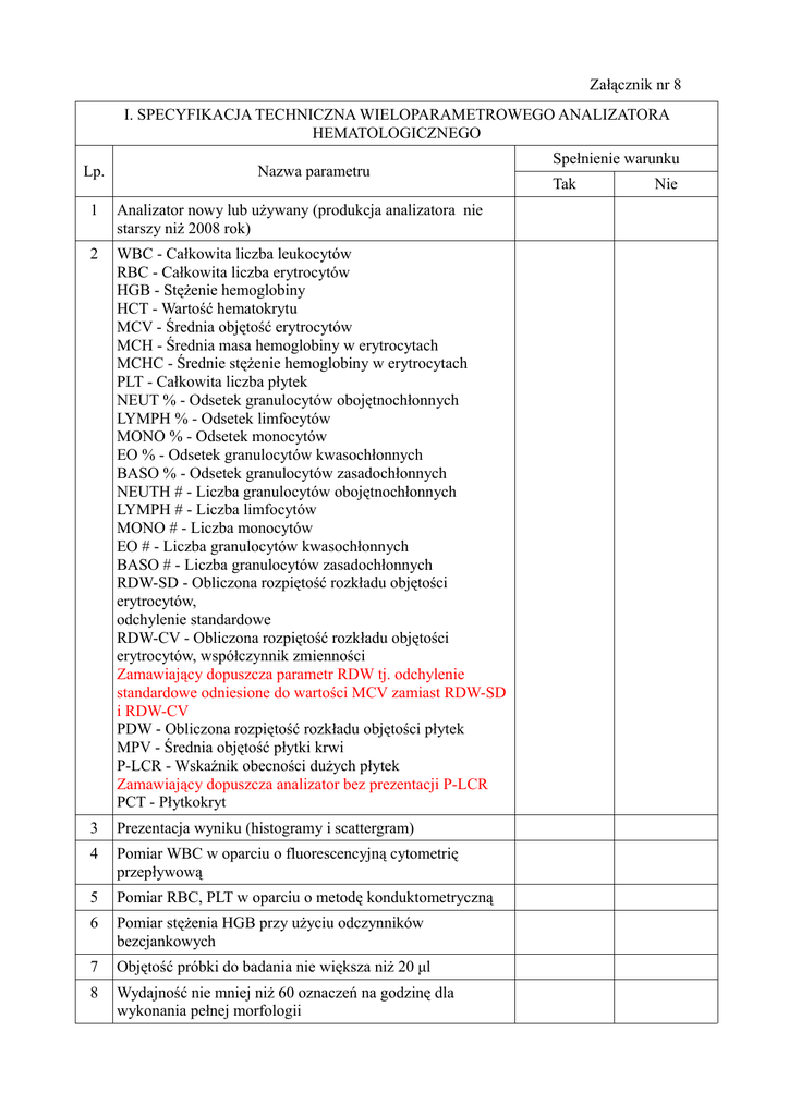 Załącznik nr 8 I. SPECYFIKACJA TECHNICZNA WIELOPARAMETROWEGO ANALIZATORA HEMATOLOGICZNEGO Lp. Nazwa parametru 1 Analizator nowy lub używany (produkcja analizatora nie starszy niż 2008 rok) 2 WBC - Całkowita liczba leukocytów RBC - Całkowita liczba erytrocytów HGB - Stężenie hemoglobiny HCT - Wartość hematokrytu MCV - Średnia objętość erytrocytów MCH - Średnia masa hemoglobiny w erytrocytach MCHC - Średnie stężenie hemoglobiny w erytrocytach PLT - Całkowita liczba płytek NEUT % - Odsetek granulocytów obojętnochłonnych LYMPH % - Odsetek limfocytów MONO % - Odsetek monocytów EO % - Odsetek granulocytów kwasochłonnych BASO % - Odsetek granulocytów zasadochłonnych NEUTH # - Liczba granulocytów obojętnochłonnych LYMPH # - Liczba limfocytów MONO # - Liczba monocytów EO # - Liczba granulocytów kwasochłonnych BASO # - Liczba granulocytów zasadochłonnych RDW-SD - Obliczona rozpiętość rozkładu objętości erytrocytów, odchylenie standardowe RDW-CV - Obliczona rozpiętość rozkładu objętości erytrocytów, współczynnik zmienności Zamawiający dopuszcza parametr RDW tj. odchylenie standardowe odniesione do wartości MCV zamiast RDW-SD i RDW-CV PDW - Obliczona rozpiętość rozkładu objętości płytek MPV - Średnia objętość płytki krwi P-LCR - Wskaźnik obecności dużych płytek Zamawiający dopuszcza analizator bez prezentacji P-LCR PCT - Płytkokryt 3 Prezentacja wyniku (histogramy i scattergram) 4 Pomiar WBC w oparciu o fluorescencyjną cytometrię przepływową 5 Pomiar RBC, PLT w oparciu o metodę konduktometryczną 6 Pomiar stężenia HGB przy użyciu odczynników bezcjankowych 7 Objętość próbki do badania nie większa niż 20 μl 8 Wydajność nie mniej niż 60 oznaczeń na godzinę dla wykonania pełnej morfologii Spełnienie warunku Tak Nie 9 Automatyczne mycie sondy pobierającej próbkę po każdym pomiarze. 10 Do analizatora dostarczony komputer z oprogramowaniem umożliwiającym prowadzenie bazy danych wyników z danymi demograficznymi pacjenta, zapis kontroli jakości, sporządzenie raportów miesięcznych kontroli jakości, możliwość dostępu, wyświetlania i wydrukowania wszystkich informacji z bazy danych. 11 Do analizatora dołączony zewnętrzny UPS zapewniający pracę analizatora przez co najmniej 5 min. 12 Możliwość podłączenia do analizatora czytnika kodów kreskowych. 13 Do analizatora dostarczona zewnętrzna drukarka laserowa oraz laserowy czytnik kodów 14 Dostawca podłączy analizator do informatycznego systemu Eskulap 2000 Politechniki Poznańskiej 15 Analizator objęty gwarancją przez okres trwania umowy 16 W ramach czynszu dzierżawnego Wykonawca zapewni roczne przeglądy 17 W ramach czynszu dzierżawnego nastąpi wymiana zużytych części podczas trwania umowy 18 W ramach czynszu dzierżawnego Wykonawca zapewni dojazd inżynierów serwisowych 19 W ramach czynszu dzierżawnego nastąpi serwis techniczny urządzeń dostarczonych z analizatorem w czasie trwania umowy. 20 Odczynniki do wykonania 30000 oznaczeń/12 miesięcy 21 Odczynniki do konserwacji analizatora na czas trwania umowy 22 Krew kontrolna 3 poziomy (L, N, H) do codziennej wewnętrznej kontroli jakości na czas trwania umowy