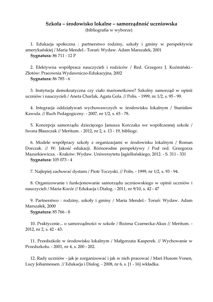 Szkoła – środowisko lokalne – samorządność uczniowska (bibliografia w wyborze) 1. Edukacja społeczna : partnerstwo rodziny, szkoły i gminy w perspektywie amerykańskiej / Maria Mendel.- Toruń: Wydaw. Adam Marszałek, 2001 Sygnatura: 86 711 - 12 P 2. Efektywna współpraca nauczycieli i rodziców / Red. Grzegorz J. Koźmiński.Złotów: Pracownia Wydawniczo-Edukacyjna, 2002 Sygnatura: 86 785 - 6 3. Instytucja demokratyczna czy ciało marionetkowe? Szkolny samorząd w opinii uczniów i nauczycieli / Aneta Charlak, Agata Gola. // Polis. - 1999, nr 1/2, s. 95 - 99. 4. Integracja oddziaływań wychowawczych w środowisku lokalnym / Stanisław Kawula. // Ruch Pedagogiczny. - 2007, nr 1/2, s. 65 - 78. 5. Koncepcja samorządu dziecięcego Janusza Korczaka we współczesnej szkole / Iwona Błaszczak // Meritum. - 2012, nr 2, s. 13 - 19, bibliogr. 6. Modele współpracy szkoły z organizacjami w środowisku lokalnym / Roman Dorczak. // W: Jakość edukacji. Różnorodne perspektywy / Pod red. Grzegorza Mazurkiewicza. - Kraków: Wydaw. Uniwersytetu Jagiellońskiego, 2012. - S. 311 - 331 Sygnatura: 105 073 - 4 7. Najlepiej zachować dystans / Piotr Toczyski. // Polis. - 1999, nr 1/2, s. 93 - 94. 8. Organizowanie i funkcjonowanie samorządu uczniowskiego w opinii uczniów i nauczycieli / Maria Kocór // Edukacja i Dialog. - 2011, nr 9/10, s. 42 - 47 9. Partnerstwo : rodziny, szkoły i gminy / Maria Mendel.- Toruń: Wydaw. Adam Marszałek, 2000 Sygnatura: 85 766 - 8 10. Praktycznie... o samorządności w szkole / Bożena Czarnecka-Akus // Meritum. 2012, nr 2, s. 42 - 43. 11. Przedszkole w środowisku lokalnym / Małgorzata Kasperek. // Wychowanie w Przedszkolu. - 2001, nr 4, s. 200 - 202. 12. Rady uczniów - jak je zorganizować i jak w nich pracować / Mari Husom Vonen, Lucy Johannessen. // Edukacja i Dialog. - 2008, nr 6, s. [1 - 16] wkładka. 13. Rodzice i szkoła : jak współuczestniczyć w edukacji dzieci / Maria Mendel.Toruń: Wydaw. Adam Marszałek, 2000 Sygnatura: 85 970 - 72 14. Rodzice partnerami szkoły. Partnerstwo, czyli co? / Stanisław Bobula. // W: Jakość edukacji. Różnorodne perspektywy / Pod red. Grzegorza Mazurkiewicza. - Kraków: Wydaw. Uniwersytetu Jagiellońskiego, 2012. - S. 297 - 310 Sygnatura: 105 073 - 4 15. Samorząd uczniowski - w stronę postaw prospołecznych? Refleksje na podstawie badań toruńskich gimnazjalistów / Violetta Kopińska. // Wychowanie na co dzień. 2010, nr 4/5, s. 24 - 28. 16. Samorząd uczniowski jako metoda wychowania społecznego w klasach początkowych / Tadeusz Robiński. // W: Szkoła polska u progu nadchodzącego wieku / pod red. Piotra Kowolika. - Kraków: Oficyna Wydawnicza "Impuls", 1999. - S. 49 - 52 Sygnatura: 84 008 17. Samorząd uczniowski jako narzędzie rozwijania kluczowych kompetencji obywatelskich, a szczególnie udziału w podejmowaniu decyzji / Joanna Pietrasik // Meritum. - 2012, nr 2, s. 2 - 6. 18. Samorząd uczniowski nie może być fikcją / Anna Stolarska. // Edukacja i Dialog. 2005, nr 2, s. 68 - 72. 19. Samorząd uczniowski powinien być organizacją uczniów / Teresa Szymczyk. // Wyzwania. - 1999, nr 8, s. 19. 20. Samorząd uczniowski w praktyce : co wiemy o jego kondycji na podstawie badań? / Olga Napiontek // Meritum. - 2012, nr 2, s. 24 - 27 21. Samorząd uczniowski, czyli szkoła działania / Michał Tragarz // Meritum. - 2012, nr 2, s. 7 - 12. 22. Samorządni uczniowie - mit czy wyzwanie współczesnych / Włodzimierz Kuzitowicz // Głos Pedagogiczny. - 2012, nr 10, s. 18 - 21 23. Samorządy uczniowskie aktywizują się / Bożena Jankowska. // Dyrektor Szkoły. 2000, nr 3, s. 18 - 19. 24. Szkoła - środowisko - współdziałanie / Dzierżymir Jankowski.- Toruń: Wydaw. Adam Marszałek, 2001 Sygnatura: 87 132 - 3 25. Transformacja w stosunkach rodziny i szkoły na przełomie XX i XXI wieku / Andrzej W. Janke.- Bydgoszcz: Wydaw. Akademii Bydgoskiej, 2002 Sygnatura: 90 004 - 5 26. W poszukiwaniu partnerstwa rodziny, szkoły i gminy / Red. Maria Mendel.Toruń: Wydaw. Adam Marszałek, 2000 Sygnatura: 85 123 27. Współdziałanie nauczyciela gimnazjum z uczniami / Agnieszka Kinga Szarkowska. // Edukacja. - 2007, nr 4, s. 85 - 92 28. Współpraca dyrektora z instytucjami pozaszkolnymi / Irena Dzierzgowska. // Dyrektor Szkoły. - 2008, nr 1, s. [I - VIII] wkładka. 29. Współpraca nauczycieli z rodzicami i szkoły ze środowiskiem lokalnym / Inetta Nowosad. // W: Jakość życia i jakość szkoły. Wprowadzenie w zagadnienia jakości i efektywności pracy szkoły / Red. nauk. Inetta Nowosad, Iris Mortag, Jana Ondrakova. - Zielona Góra: Oficyna Wydawnicza Uniwersytetu Zielonogórskiego, 2010. - S. 341 358 Sygnatura: 105 154 30. Współpraca rodziny i szkoły jako funkcja życia społecznego / Andrzej Olubiński. // Wychowanie na co dzień. - 2005, nr 1/2, s. 8 - 12. 31. Współpraca szkoły z instytucjami działającymi na rzecz dziecka i rodziny / Aneta Paszkiewicz. // Problemy Opiekuńczo-Wychowawcze. - 2013, nr 7, s. 14 - 18. 32. Współprzestrzenie edukacji: szkoła - rodzina - społeczeństwo - kultura / Red. Mirosława Nyczaj-Drąg, Michał Głażewski.- Kraków: Oficyna Wydaw. "Impuls", 2005 Sygnatura: 95 219 33. Wychowanie - wspólny trud rodziny i szkoły / Irena Makaruk. // Edukacja i Dialog. - 2001, nr 2, s. 21 - 23. 34. Wychowanie do demokracji przez działalność samorządu uczniowskiego / Mariusz Grążowski. // W: Samorządność wczoraj i dziś. Wychowanie do społeczeństwa obywatelskiego / Pod red. nauk. Andrzeja Murzyna. - Kraków: Oficyna Wydawnicza "Impuls", 2011. - S. 29 - 36 Sygnatura: 104 276 Opracowanie: Magdalena Gutowska PBP CDN w Pile