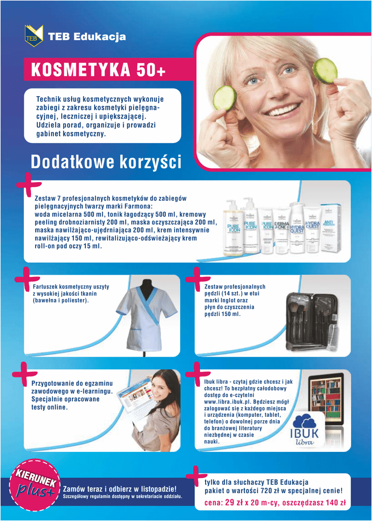 KOSMETYKA 50+ Technik usług kosmetycznych wykonuje zabiegi z zakresu kosmetyki pielęgnacyjnej, leczniczej i upiększającej. Udziela porad, organizuje i prowadzi gabinet kosmetyczny. Dodatkowe korzyści Zestaw 7 profesjonalnych kosmetyków do zabiegów pielęgnacyjnych twarzy marki Farmona: woda micelarna 500 ml, tonik łagodzący 500 ml, kremowy peeling drobnoziarnisty 200 ml, maska oczyszczająca 200 ml, maska nawilżająco-ujędrniająca 200 ml, krem intensywnie nawilżający 150 ml, rewitalizująco-odświeżający krem roll-on pod oczy 15 ml. Fartuszek kosmetyczny uszyty z wysokiej jakości tkanin (bawełna i poliester). Zestaw profesjonalnych pędzli (14 szt.) w etui marki Inglot oraz płyn do czyszczenia pędzli 150 ml. Przygotowanie do egzaminu zawodowego w e-learningu. Specjalnie opracowane testy online. Ibuk libra - czytaj gdzie chcesz i jak chcesz! To bezpłatny całodobowy dostęp do e-czytelni www.libra.ibuk.pl. Będziesz mógł zalogować się z każdego miejsca i urządzenia (komputer, tablet, telefon) o dowolnej porze dnia do branżowej literatury niezbędnej w czasie nauki. KIER UNE plus K Zamów teraz i odbierz w listopadzie! Szczegółowy regulamin dostępny w sekretariacie oddziału. tylko dla słuchaczy TEB Edukacja pakiet o wartości 720 zł w specjalnej cenie! cena: 29 zł x 20 m-cy, oszczędzasz 140 zł