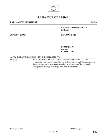 UNIA EUROPEJSKA PARLAMENT EUROPEJSKI RADA Bruksela, 4 listopada 2011 r. (OR. en) 2010/0064 (COD) PE-CONS 51/11 DROIPEN 91 JAI 601 CODEC 1398 AKTY USTAWODAWCZE I INNE INSTRUMENTY Dotyczy: DYREKTYWA PARLAMENTU EUROPEJSKIEGO I RADY w sprawie zwalczania niegodziwego traktowania w celach seksualnych i wykorzystywania seksualnego dzieci oraz pornografii dziecięcej, zastępująca decyzję ramową Rady 2004/68/WSiSW PE-CONS 51/11 PAW/alb/jaw DG H 2B PL DYREKTYWA PARLAMENTU EUROPEJSKIEGO I RADY 2011/.../UE z dnia w sprawie zwalczania niegodziwego traktowania w celach seksualnych i wykorzystywania seksualnego dzieci oraz pornografii dziecięcej, zastępująca decyzję ramową Rady 2004/68/WSiSW PARLAMENT EUROPEJSKI I RADA UNII EUROPEJSKIEJ, uwzględniając Traktat o funkcjonowaniu Unii Europejskiej, w szczególności jego art. 82 ust. 2 i art. 83 ust. 1, uwzględniając wniosek Komisji Europejskiej, po przekazaniu projektu aktu ustawodawczego parlamentom narodowym, uwzględniając opinię Europejskiego Komitetu Ekonomiczno-Społecznego1, po konsultacji z Komitetem Regionów, stanowiąc zgodnie ze zwykłą procedurą ustawodawczą2, 1 2 Dz.U. C 48 z 15.2.2011, s. 138. Stanowisko Parlamentu Europejskiego z dnia … 2011 r. (dotychczas nieopublikowane w Dzienniku Urzędowym) i decyzja Rady z dnia ... PE-CONS 51/11 PAW/alb/jaw DG H 2B 1 PL a także mając na uwadze, co następuje: (1) Niegodziwe traktowanie w celach seksualnych i wykorzystywanie seksualne dzieci, w tym pornografia dziecięca, stanowią poważne pogwałcenie praw podstawowych, w szczególności praw dzieci do ochrony i opieki niezbędnych dla ich dobra, przewidzianych w Konwencji ONZ o prawach dziecka z 1989 r. i w Karcie praw podstawowych Unii Europejskiej1. (2) Zgodnie z art. 6 ust. 1 Traktatu o Unii Europejskiej Unia uznaje prawa, swobody i zasady zawarte w Karcie praw podstawowych Unii europejskiej, której art. 24 ust. 2 stanowi, że we wszystkich działaniach dotyczących dzieci, zarówno podejmowanych przez władze publiczne, jak i instytucje prywatne, należy przede wszystkim uwzględnić najlepszy interes dziecka. Ponadto „Program sztokholmski - Otwarta i bezpieczna Europa dla dobra i ochrony obywateli”2 w sposób wyraźny nadaje priorytet walce z niegodziwym traktowaniem dzieci w celach seksualnych i seksualnym wykorzystywaniem dzieci oraz z pornografią dziecięcą. (3) Pornografia dziecięca, czyli obrazy przedstawiające niegodziwe traktowanie dzieci w celach seksualnych oraz inne szczególnie groźne formy niegodziwego traktowania w celach seksualnych i wykorzystywania seksualnego dzieci, jest przedmiotem coraz intensywniejszego obiegu i upowszechnia się poprzez wykorzystanie nowych technologii i internetu. 1 2 Dz.U. C 364 z 18.12.2000, s. 1. Dz.U. C 115 z 4.5.2010, s. 1. PE-CONS 51/11 PAW/alb/jaw DG H 2B 2 PL (4) Decyzja ramowa Rady 2004/68/WSiSW z dnia 22 grudnia 2003 r. dotycząca zwalczania seksualnego wykorzystywania dzieci i pornografii dziecięcej1 zbliża prawodawstwo państw członkowskich w celu kryminalizacji najgroźniejszych form niegodziwego traktowania w celach seksualnych i wykorzystywania seksualnego dzieci, rozszerzenia jurysdykcji krajowej i zapewnienia pokrzywdzonym minimalnego poziomu pomocy. Decyzja ramowa Rady 2001/220/WSiSW z dnia 15 marca 2001 r. w sprawie pozycji ofiar w postępowaniu karnym2 ustanawia pakiet praw przysługujących pokrzywdzonym w postępowaniu karnym, w tym prawo do ochrony i odszkodowania. Ponadto koordynacja ścigania przypadków niegodziwego traktowania dzieci w celach seksualnych i wykorzystywania seksualnego dzieci oraz pornografii dziecięcej zostanie ułatwiona dzięki wdrożeniu decyzji ramowej Rady 2009/948/WSiSW z dnia 30 listopada 2009 r. w sprawie zapobiegania konfliktom jurysdykcji w postępowaniu karnym i w sprawie rozstrzygania takich konfliktów3. 1 2 3 Dz.U. L 13 z 20.1.2004, s. 44. Dz.U. L 82 z 22.3.2001, s. 1. Dz.U. L 328 z 15.12.2009, s. 42. PE-CONS 51/11 PAW/alb/jaw DG H 2B 3 PL (5) Zgodnie z art. 34 Konwencji ONZ o prawach dziecka państwa będące stronami zobowiązują się chronić dzieci przed wszelkimi formami wykorzystywania seksualnego i niegodziwego traktowania w celach seksualnych. Protokół fakultatywny ONZ do Konwencji praw dziecka w sprawie handlu dziećmi, prostytucji dziecięcej i dziecięcej pornografii z 2000 r. oraz, w szczególności, Konwencja Rady Europy o ochronie dzieci przed seksualnym wykorzystywaniem i niegodziwym traktowaniem w celach seksualnych z 2007 r. są niezwykle ważnymi dokonaniami w procesie pogłębiania współpracy międzynarodowej w tej dziedzinie. (6) Poważne przestępstwa, takie jak wykorzystywanie seksualne dzieci i pornografia dziecięca, wymagają kompleksowego podejścia, obejmującego ściganie sprawców, ochronę pokrzywdzonych dzieci i zapobieganie powyższym zjawiskom. Przy podejmowaniu jakichkolwiek środków służących zwalczaniu tych przestępstw należy przede wszystkim uwzględnić najlepszy interes dziecka, zgodnie z Kartą praw podstawowych Unii Europejskiej oraz Konwencją ONZ o prawach dziecka. Decyzję ramową 2004/68/WSiSW należy zastąpić nowym instrumentem zapewniającym owe kompleksowe ramy prawne służące realizacji powyższego celu. PE-CONS 51/11 PAW/alb/jaw DG H 2B 4 PL (7) Niniejsza dyrektywa oraz dyrektywa 2011/36/UE Parlamentu Europejskiego i Rady z dnia 5 kwietnia 2011 r. w sprawie zapobiegania handlowi ludźmi i zwalczania tego procederu oraz ochrony ofiar, zastępująca decyzję ramową Rady 2002/629/WSiSW1 powinny w pełni się uzupełniać, ponieważ niektóre dzieci pokrzywdzone w wyniku niegodziwego traktowania w celach seksualnych lub wykorzystywania seksualnego są również ofiarami handlu ludźmi. (8) W kontekście kryminalizacji czynów związanych z przedstawieniem pornograficznym niniejsza dyrektywa odnosi się do czynów, które polegają na zorganizowanym, skierowanym do publiczności ukazywaniu na żywo, a tym samym wykluczają z definicji osobisty bezpośre