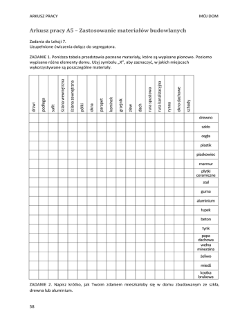 ARKUSZ PRACY MÓJ DOM Arkusz pracy A5 – Zastosowanie materiałów budowlanych Zadania do Lekcji 7. Uzupełnione ćwiczenia dołącz do segregatora. schody okno dachowe rynna rura kanalizacyjna rura spustowa dach zlew grzejnik kominek parapet okna półki ściana zewnętrzna ściana wewnętrzna sufit podłoga drzwi ZADANIE 1. Poniższa tabela przedstawia poznane materiały, które są wypisane pionowo. Poziomo wypisano różne elementy domu. Użyj symbolu „X”, aby zaznaczyć, w jakich miejscach wykorzystywane są poszczególne materiały. drewno szkło cegła plastik piaskowiec marmur płytki ceramiczne stal guma aluminium łupek beton tynk papa dachowa wełna mineralna żeliwo miedź kostka brukowa ZADANIE 2. Napisz krótko, jak Twoim zdaniem mieszkałoby się w domu zbudowanym ze szkła, drewna lub aluminium. 58 ARKUSZ PRACY MÓJ DOM Album Zacznij nowy dział zatytułowany Materiały budowlane. 1. Techniką frotażu wykonaj odbitki materiałów, które znajdują się w twoim otoczeniu (np. cegły, kamień, płytki ceramiczne, drewno). Dodaj je do Albumu wraz z innymi informacjami dotyczącymi Twojego domu. Podpisz odbitki i zaznacz, gdzie dokładnie znajdziesz materiały wykorzystane do ich wykonania. 2. Znajdź ilustracje, albo użyj techniki frotażu do zrobienia odbitek materiałów, których nie zastosowano do budowy Twojego domu. 3. Zbieraj ilustracje przedstawiające domy zbudowane z różnych materiałów. Słowniczek Do Słowniczka wpisz nowe wyrazy i ich definicje. 59