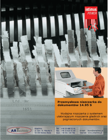 Przemysłowa niszczarka do dokumentów 14.95 S Wydajny silnik o mocy 4,0kW z zabezpieczeniem termicznym oraz wytrzymała przekładnia napędowa. Wytrzymałe wały tnące o niskim stopniu zużycia, wykonane ze specjalnej hartowanej stali, zapewniają optymalną wydajność cięcia. Szerokość robocza: 440 mm, przystosowana do powszechnie stosowanych formatów dokumentów. Profesjonalne rozwiązania: • Napełnianie za pomocą przenośnika taśmowego • Łopatki dozujące wciągają zarówno gładki papier jak również pomięte dokumenty • Kontrola pracy niszczarki za pomocą przełącznika Włącz / Wyłącz • Oddzielny wyłącznik główny • Elektroniczny system monitorowania stopnia napełnienia worka zbiorczego Standardowe urządzenia bezpieczeństwa: • Blokowany wyłącznik główny • Wyłącznik bezpieczeństwa na drzwiach do worka zbiorczego • Zabezpieczenia silników poprzez czujnik termiczny oraz przekaźnik nadprądowy Wyposażenie opcjonalne: • Przykręcane obustronnie poszerzenia stołu roboczego do wygodnego niszczenia większej ilości materiału • Listwa z wyłącznikiem bezpieczeństwa znajdująca się na stole roboczym; rozwiązanie wprowadzone w celu zapewnienia maksymalnego bezpieczeństwa operatora, oparte na aktualnych przepisach bezpieczeństwa Możliwość rozbudowy urządzenia: • Seryjnie przystosowane do podłączenia urządzenia odsysającego pył i kurz Wysoka elastyczność: Wyjmowany pojemnik na ścinki: • Jest częścią zestawu • Urządzenie mobilne na dwóch kółkach z blokadą i • Pojemności 200 litrów • Wyjmowany z prawej strony, na życzenie wykonanie z lewej dwóch kółkach skrętnych • Szerokość 800mm umożliwia łatwy przejazd przez standardowe drzwi • Uchwyt na kabel zasilający pod blatem umożliwia bezpieczne i łatwe transportowanie niszczarki strony • Przyjazny dla środowiska utylizacja w worku PE • Wygodne odstawienie napełnionego worka PE na paletę do transportu Niszczarka przemysłowa 14.95 S Wysoki komfort użytkowania : • Wytrzymały przełącznik do włączania / wyłączania oraz ruchu wstecz • Wyłącznik główny z możliwością zabezpieczenia kłódką w pozycji „0” chroni przed włączeniem urządzenia przez osobę nieupoważnioną • Kontrolki świetlne sygnalizujące stan pracy urządzenia Bezawaryjna eksploatacja : • Wszelkie funkcje urządzenia sterowane są poprzez sterownik PLC • Automatyczny ruch wsteczny noży tnących w przypadku przeciążenia lub zaklinowania dokumentów Niezwykła technologia doprowadzania surowca do urządzenia • Zintegrowany taśmociąg transportuje materiał do mechanizmu tnącego • Łopatki podające mechanizmu tnącego dostarczają do noży zarówno gładki papier jak również zmięte arkusze • Łatwy dostęp do noży tnących podczas konserwacji Optymalne pełne bezpieczeństwo • Rozbudowana instalacja bezpieczeństwa we wszystkich istotnych miejscach dla jeszcze lepszej ochrony operatora oraz maszyny Niszczarka przemysłowa 14.95 S DIN 32757-1 Klasa tajności 3 P-4 / F-1 / DIN 66 399 O-4 / T-4 / E-3 3 2 1 P-3 / O-3 P-2 / O-2 P-1 / O-1 T-3 / E-2 T-2 / E-2 T-2 / E-2 Wielkość ścinek mm 3,8 x 40 6 x 50 5,8 11,8 Wydajność¹ kartki 120-130 120-130 120-140 200-210 Wydajność² Kg/h 235 280 220 240 Szybkość cięcia ok. m/sek 0.30 0.30 0,28 0,28 Szerokość robocza ok. mm 440 440 440 440 Worek zbiorczy Litry Waga worka³ kg Poziom hałasu dBA Zasilanie V Moc zainstalowana kW 4kW Wymiary Dł x Szer x mm 1.670 x 800 x 1.630 220 20-38 68 400 trójfazowe Wys Waga Kg 443 ¹W oparciu o papier 70g/m2 DIN A4. Wydajność kartek zależna od właściwości papieru, może ulec zmianie. Spadek napięcia nominalnego może doprowadzić do niższej wydajności. ²W zależności od załadunku, materiału oraz zasilania, określone na bazie nowych mechanizmów tnących ³W zależności od materiału oraz szerokości cięcia Niszczarka przemysłowa 14.95 S Wysyłka: • • Zapakowane w drewnianą skrzynię Wymiary transportowe Dł x Szer x Wys 1.630 x 1.050 x 1.730 mm • Waga transportowa 510 kg Wskazówki dotyczące instalacji Minimalne odstępy od ścian Drzwi z lewej: 1. przynajmniej 100 mm 3. przynajmniej 950 mm Drzwi z prawej: 1. przynajmniej 950 mm 2. przynajmniej 1000mm 4. - 3. przynajmniej 100 mm Wymiary: 1. Długość 1670 mm 2. Wysokość 1630 mm 3. Szerokość z otwartymi drzwiami 1200mm 4. Szerokość 800 mm (z poszerzeniem stołu podawczego 1200mm) Pozycja panelu sterowania Przyłącze elektryczne 3 Fazy • • • długość kabla = 4,55 m 400 - 415 V/50 Hz z wtyczką CEE 32A, 5 – biegunową ... Inne warianty zasilania na zapytanie Wymagane zabezpieczenie przyłącza elektrycznego • Bezpiecznik z charakterystyką zwłoczną typ C • lub bezpiecznik gL/gG 1, zgodnie z normą IEC/EN 60947-4-1 400-415 V / 50 Hz = bezpiecznik 25A 220-230 V / 50-60 Hz = bezpiecznik 32A 200 V / 50-60 Hz = bezpiecznik 35A