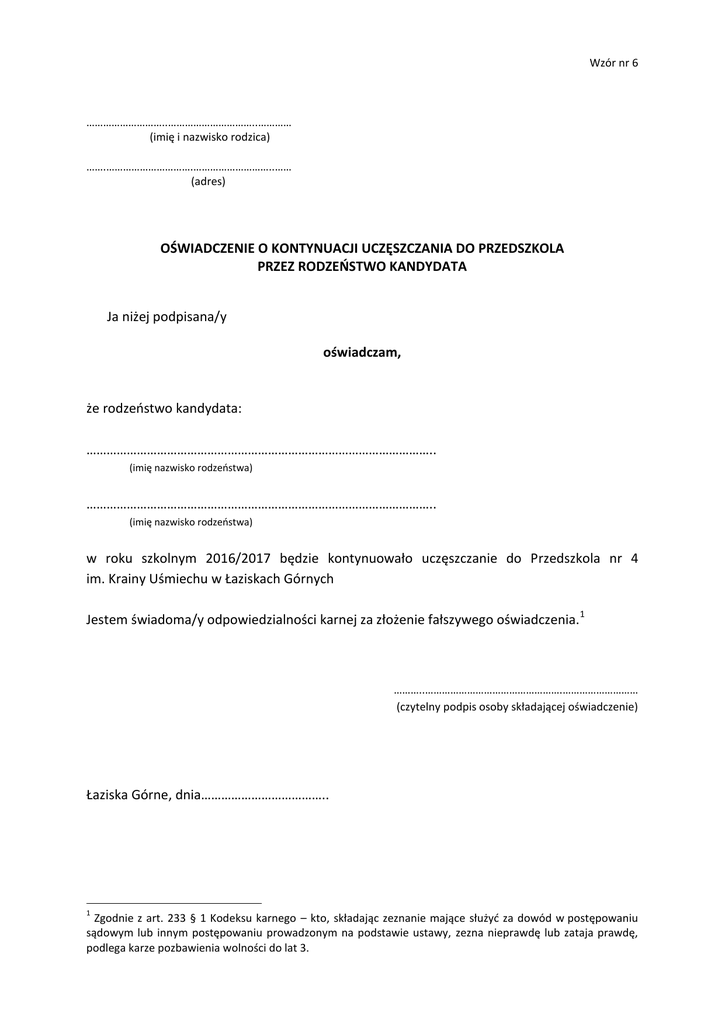 Wzór nr 6 ………………………..…………………………..………… (imię i nazwisko rodzica) …….………………………….………………………..…… (adres) OŚWIADCZENIE O KONTYNUACJI UCZĘSZCZANIA DO PRZEDSZKOLA PRZEZ RODZEŃSTWO KANDYDATA Ja niżej podpisana/y oświadczam, że rodzeństwo kandydata: ………………………………………………………………………………………….. (imię nazwisko rodzeństwa) ………………………………………………………………………………………….. (imię nazwisko rodzeństwa) w roku szkolnym 2016/2017 będzie kontynuowało uczęszczanie do Przedszkola nr 4 im. Krainy Uśmiechu w Łaziskach Górnych Jestem świadoma/y odpowiedzialności karnej za złożenie fałszywego oświadczenia. 1 ………..………………………………………….……………………… (czytelny podpis osoby składającej oświadczenie) Łaziska Górne, dnia……………………………….. 1 Zgodnie z art. 233 § 1 Kodeksu karnego – kto, składając zeznanie mające służyć za dowód w postępowaniu sądowym lub innym postępowaniu prowadzonym na podstawie ustawy, zezna nieprawdę lub zataja prawdę, podlega karze pozbawienia wolności do lat 3.
