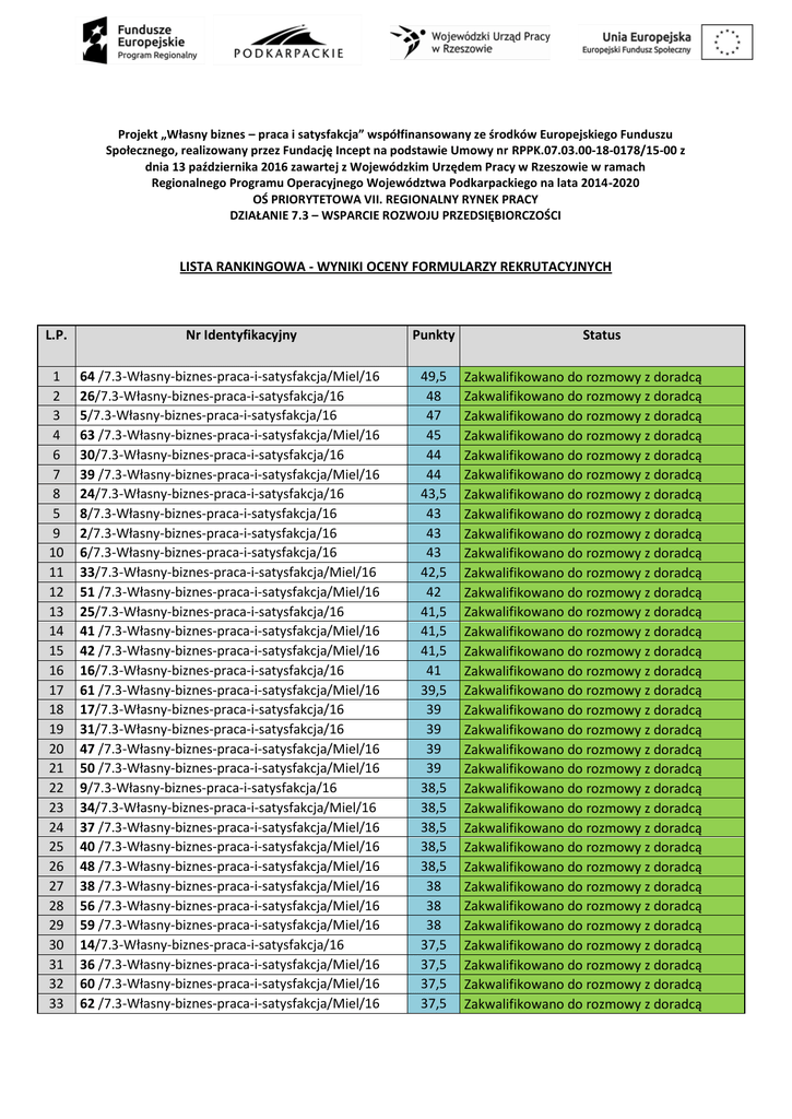 Projekt „Własny biznes – praca i satysfakcja” współfinansowany ze środków Europejskiego Funduszu Społecznego, realizowany przez Fundację Incept na podstawie Umowy nr RPPK.07.03.00-18-0178/15-00 z dnia 13 października 2016 zawartej z Wojewódzkim Urzędem Pracy w Rzeszowie w ramach Regionalnego Programu Operacyjnego Województwa Podkarpackiego na lata 2014-2020 OŚ PRIORYTETOWA VII. REGIONALNY RYNEK PRACY DZIAŁANIE 7.3 – WSPARCIE ROZWOJU PRZEDSIĘBIORCZOŚCI LISTA RANKINGOWA - WYNIKI OCENY FORMULARZY REKRUTACYJNYCH L.P. 1 2 3 4 6 7 8 5 9 10 11 12 13 14 15 16 17 18 19 20 21 22 23 24 25 26 27 28 29 30 31 32 33 Nr Identyfikacyjny 64 /7.3-Własny-biznes-praca-i-satysfakcja/Miel/16 26/7.3-Własny-biznes-praca-i-satysfakcja/16 5/7.3-Własny-biznes-praca-i-satysfakcja/16 63 /7.3-Własny-biznes-praca-i-satysfakcja/Miel/16 30/7.3-Własny-biznes-praca-i-satysfakcja/16 39 /7.3-Własny-biznes-praca-i-satysfakcja/Miel/16 24/7.3-Własny-biznes-praca-i-satysfakcja/16 8/7.3-Własny-biznes-praca-i-satysfakcja/16 2/7.3-Własny-biznes-praca-i-satysfakcja/16 6/7.3-Własny-biznes-praca-i-satysfakcja/16 33/7.3-Własny-biznes-praca-i-satysfakcja/Miel/16 51 /7.3-Własny-biznes-praca-i-satysfakcja/Miel/16 25/7.3-Własny-biznes-praca-i-satysfakcja/16 41 /7.3-Własny-biznes-praca-i-satysfakcja/Miel/16 42 /7.3-Własny-biznes-praca-i-satysfakcja/Miel/16 16/7.3-Własny-biznes-praca-i-satysfakcja/16 61 /7.3-Własny-biznes-praca-i-satysfakcja/Miel/16 17/7.3-Własny-biznes-praca-i-satysfakcja/16 31/7.3-Własny-biznes-praca-i-satysfakcja/16 47 /7.3-Własny-biznes-praca-i-satysfakcja/Miel/16 50 /7.3-Własny-biznes-praca-i-satysfakcja/Miel/16 9/7.3-Własny-biznes-praca-i-satysfakcja/16 34/7.3-Własny-biznes-praca-i-satysfakcja/Miel/16 37 /7.3-Własny-biznes-praca-i-satysfakcja/Miel/16 40 /7.3-Własny-biznes-praca-i-satysfakcja/Miel/16 48 /7.3-Własny-biznes-praca-i-satysfakcja/Miel/16 38 /7.3-Własny-biznes-praca-i-satysfakcja/Miel/16 56 /7.3-Własny-biznes-praca-i-satysfakcja/Miel/16 59 /7.3-Własny-biznes-praca-i-satysfakcja/Miel/16 14/7.3-Własny-biznes-praca-i-satysfakcja/16 36 /7.3-Własny-biznes-praca-i-satysfakcja/Miel/16 60 /7.3-Własny-biznes-praca-i-satysfakcja/Miel/16 62 /7.3-Własny-biznes-praca-i-satysfakcja/Miel/16 Punkty 49,5 48 47 45 44 44 43,5 43 43 43 42,5 42 41,5 41,5 41,5 41 39,5 39 39 39 39 38,5 38,5 38,5 38,5 38,5 38 38 38 37,5 37,5 37,5 37,5 Status Zakwalifikowano do rozmowy z doradcą Zakwalifikowano do rozmowy z doradcą Zakwalifikowano do rozmowy z doradcą Zakwalifikowano do rozmowy z doradcą Zakwalifikowano do rozmowy z doradcą Zakwalifikowano do rozmowy z doradcą Zakwalifikowano do rozmowy z doradcą Zakwalifikowano do rozmowy z doradcą Zakwalifikowano do rozmowy z doradcą Zakwalifikowano do rozmowy z doradcą Zakwalifikowano do rozmowy z doradcą Zakwalifikowano do rozmowy z doradcą Zakwalifikowano do rozmowy z doradcą Zakwalifikowano do rozmowy z doradcą Zakwalifikowano do rozmowy z doradcą Zakwalifikowano do rozmowy z doradcą Zakwalifikowano do rozmowy z doradcą Zakwalifikowano do rozmowy z doradcą Zakwalifikowano do rozmowy z doradcą Zakwalifikowano do rozmowy z doradcą Zakwalifikowano do rozmowy z doradcą Zakwalifikowano do rozmowy z doradcą Zakwalifikowano do rozmowy z doradcą Zakwalifikowano do rozmowy z doradcą Zakwalifikowano do rozmowy z doradcą Zakwalifikowano do rozmowy z doradcą Zakwalifikowano do rozmowy z doradcą Zakwalifikowano do rozmowy z doradcą Zakwalifikowano do rozmowy z doradcą Zakwalifikowano do rozmowy z doradcą Zakwalifikowano do rozmowy z doradcą Zakwalifikowano do rozmowy z doradcą Zakwalifikowano do rozmowy z doradcą 34 35 36 37 38 39 40 41 42 43 44 45 46 47 48 49 50 51 52 53 54 55 56 57 58 59 60 61 62 63 64 65 4/7.3-Własny-biznes-praca-i-satysfakcja/16 10/7.3-Własny-biznes-praca-i-satysfakcja/16 15/7.3-Własny-biznes-praca-i-satysfakcja/16 27/7.3-Własny-biznes-praca-i-satysfakcja/16 45 /7.3-Własny-biznes-praca-i-satysfakcja/Miel/16 55 /7.3-Własny-biznes-praca-i-satysfakcja/Miel/16 11/7.3-Własny-biznes-praca-i-satysfakcja/16 43 /7.3-Własny-biznes-praca-i-satysfakcja/Miel/16 46 /7.3-Własny-biznes-praca-i-satysfakcja/Miel/16 58 /7.3-Własny-biznes-praca-i-satysfakcja/Miel/16 1/7.3-Własny-biznes-praca-i-satysfakcja/16 65 /7.3-Własny-biznes-praca-i-satysfakcja/Miel/16 32/7.3-Własny-biznes-praca-i-satysfakcja/Miel/16 49 /7.3-Własny-biznes-praca-i-satysfakcja/Miel/16 35/7.3-Własny-biznes-praca-i-satysfakcja/Miel/16 44 /7.3-Własny-biznes-praca-i-satysfakcja/Miel/16 57 /7.3-Własny-biznes-praca-i-satysfakcja/Miel/16 3/7.3-Własny-biznes-praca-i-satysfakcja/16 7/7.3-Własny-biznes-praca-i-satysfakcja/16 13/7.3-Własny-biznes-praca-i-satysfakcja/16 19/7.3-Własny-biznes-praca-i-satysfakcja/16 12/7.3-Własny-biznes-praca-i-satysfakcja/16 28/7.3-Własny-biznes-praca-i-satysfakcja/16 29/7.3-Własny-biznes-praca-i-satysfakcja/16 53 /7.3-Własny-biznes-praca-i-satysfakcja/Miel/16 18/7.3-Własny-biznes-praca-i-satysfakcja/16 23/7.3-Własny-biznes-praca-i-satysfakcja/16 22/7.3-Własny-biznes-praca-i-satysfakcja/16 20/7.3-Własny-biznes-praca-i-satysfakcja/16 21/7.3-Własny-biznes-praca-i-satysfakcja/16 52 /7.3-Własny-biznes-praca-i-satysfakcja/Miel/16 54 /7.3-Własny-biznes-praca-i-satysfakcja/Miel/16 37 37 37 37 37 37 36,5 36,5 36,5 36,5 36 36 35,5 35,5 34,5 34,5 34,5 34 34 34 32,5 32 32 32 32 22 20 15 12 12 0 0 Zakwalifikowano do rozmowy z doradcą Zakwalifikowano do rozmowy z doradcą Zakwalifikowano do rozmowy z doradcą Zakwalifikowano do rozmowy z doradcą Zakwalifikowano do rozmowy z doradcą Zakwalifikowano do rozmowy z doradcą Zakwalifikowano do rozmowy z doradcą Zakwalifikowano do rozmowy z doradcą Zakwalifikowano do rozmowy z doradcą Zakwalifikowano do rozmowy z doradcą Zakwalifikowano do rozmowy z doradcą Zakwalifikowano do rozmowy z doradcą Zakwalifikowano do rozmowy z doradcą Zakwalifikowano do rozmowy z doradcą Zakwalifikowano do rozmowy z doradcą Zakwalifikowano do rozmowy z doradcą Zakwalifikowano 
