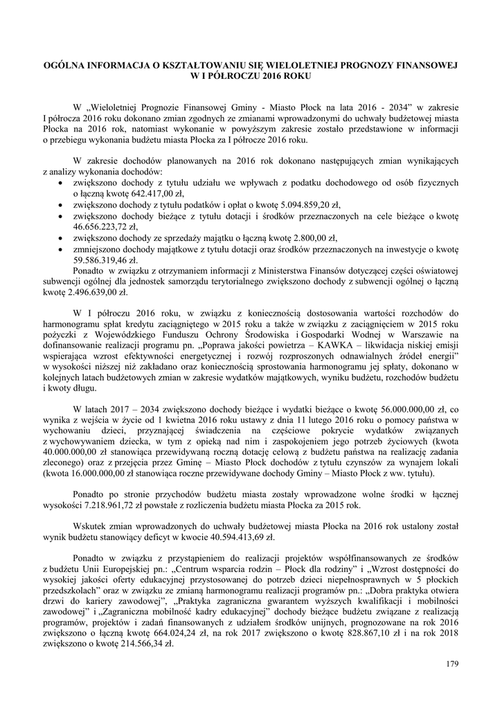 OGÓLNA INFORMACJA O KSZTAŁTOWANIU SIĘ WIELOLETNIEJ PROGNOZY FINANSOWEJ W I PÓŁROCZU 2016 ROKU W „Wieloletniej Prognozie Finansowej Gminy - Miasto Płock na lata 2016 - 2034” w zakresie I półrocza 2016 roku dokonano zmian zgodnych ze zmianami wprowadzonymi do uchwały budżetowej miasta Płocka na 2016 rok, natomiast wykonanie w powyższym zakresie zostało przedstawione w informacji o przebiegu wykonania budżetu miasta Płocka za I półrocze 2016 roku. W zakresie dochodów planowanych na 2016 rok dokonano następujących zmian wynikających z analizy wykonania dochodów: zwiększono dochody z tytułu udziału we wpływach z podatku dochodowego od osób fizycznych o łączną kwotę 642.417,00 zł, zwiększono dochody z tytułu podatków i opłat o kwotę 5.094.859,20 zł, zwiększono dochody bieżące z tytułu dotacji i środków przeznaczonych na cele bieżące o kwotę 46.656.223,72 zł, zwiększono dochody ze sprzedaży majątku o łączną kwotę 2.800,00 zł, zmniejszono dochody majątkowe z tytułu dotacji oraz środków przeznaczonych na inwestycje o kwotę 59.586.319,46 zł. Ponadto w związku z otrzymaniem informacji z Ministerstwa Finansów dotyczącej części oświatowej subwencji ogólnej dla jednostek samorządu terytorialnego zwiększono dochody z subwencji ogólnej o łączną kwotę 2.496.639,00 zł. W I półroczu 2016 roku, w związku z koniecznością dostosowania wartości rozchodów do harmonogramu spłat kredytu zaciągniętego w 2015 roku a także w związku z zaciągnięciem w 2015 roku pożyczki z Wojewódzkiego Funduszu Ochrony Środowiska i Gospodarki Wodnej w Warszawie na dofinansowanie realizacji programu pn. „Poprawa jakości powietrza – KAWKA – likwidacja niskiej emisji wspierająca wzrost efektywności energetycznej i rozwój rozproszonych odnawialnych źródeł energii” w wysokości niższej niż zakładano oraz koniecznością sprostowania harmonogramu jej spłaty, dokonano w kolejnych latach budżetowych zmian w zakresie wydatków majątkowych, wyniku budżetu, rozchodów budżetu i kwoty długu. W latach 2017 – 2034 zwiększono dochody bieżące i wydatki bieżące o kwotę 56.000.000,00 zł, co wynika z wejścia w życie od 1 kwietna 2016 roku ustawy z dnia 11 lutego 2016 roku o pomocy państwa w wychowaniu dzieci, przyznającej świadczenia na częściowe pokrycie wydatków związanych z wychowywaniem dziecka, w tym z opieką nad nim i zaspokojeniem jego potrzeb życiowych (kwota 40.000.000,00 zł stanowiąca przewidywaną roczną dotację celową z budżetu państwa na realizację zadania zleconego) oraz z przejęcia przez Gminę – Miasto Płock dochodów z tytułu czynszów za wynajem lokali (kwota 16.000.000,00 zł stanowiąca roczne przewidywane dochody Gminy – Miasto Płock z ww. tytułu). Ponadto po stronie przychodów budżetu miasta zostały wprowadzone wolne środki w łącznej wysokości 7.218.961,72 zł powstałe z rozliczenia budżetu miasta Płocka za 2015 rok. Wskutek zmian wprowadzonych do uchwały budżetowej miasta Płocka na 2016 rok ustalony został wynik budżetu stanowiący deficyt w kwocie 40.594.413,69 zł. Ponadto w związku z przystąpieniem do realizacji projektów współfinansowanych ze środków z budżetu Unii Europejskiej pn.: „Centrum wsparcia rodzin – Płock dla rodziny” i „Wzrost dostępności do wysokiej jakości oferty edukacyjnej przystosowanej do potrzeb dzieci niepełnosprawnych w 5 płockich przedszkolach” oraz w związku ze zmianą harmonogramu realizacji programów pn.: „Dobra praktyka otwiera drzwi do kariery zawodowej”, „Praktyka zagraniczna gwarantem wyższych kwalifikacji i mobilności zawodowej” i „Zagraniczna mobilność kadry edukacyjnej” dochody bieżące budżetu związane z realizacją programów, projektów i zadań finansowanych z udziałem środków unijnych, prognozowane na rok 2016 zwiększono o łączną kwotę 664.024,24 zł, na rok 2017 zwiększono o kwotę 828.867,10 zł i na rok 2018 zwiększono o kwotę 214.566,34 zł. 179 W związku z uzyskaną refundacją wydatków kwalifikowanych poniesionych w latach poprzednich na realizację projektu pn. „Budowa dróg wraz z infrastrukturą w zachodniej części Osiedla Borowiczki (od ulicy Harcerskiej w prawo) w Płocku – Etap II” zwiększono dochody majątkowe na programy, projekty i zadania finansowane z udziałem środków unijnych o kwotę 6.817.937,24 zł. Natomiast w związku ze zmianą harmonogramu realizacji przedsięwzięć zaplanowanych do realizacji w 2016 roku zmniejszono dochody majątkowe na programy, projekty i zadania finansowane z udziałem środków unijnych o kwotę 62.841.817,70 zł. Ponadto w związku ze zmianą przewidywanego harmonogramu pozyskiwania środków unijnych na realizację programów, projektów lub zadań finansowanych z udziałem środków unijnych ujętych w „Wykazie przedsięwzięć do WPF” dokonano zmian w kolejnych latach, w zakresie dochodów majątkowych, tj. w roku 2017 zmniejszono o kwotę 49.538.224,00 zł, natomiast w latach 2018 – 2020 zwiększono odpowiednio o kwoty: 49.991.140,00 zł, 16.038.560,00 zł i 18.800.000,00 zł. Kwoty wydatków bieżących i majątkowych na programy, projekty i zadania z udziałem środków unijnych zmieniono odpowiednio do zmian harmonogramu pozyskiwania ww. środków. Wieloletnia Prognoza Finansowa Gminy - Miasto Płock na lata 2016 - 2034 w 2016 roku ulegała także zmianom w zakresie poszczególnych przedsięwzięć. W wykazie przedsięwzięć, o których mowa w art. 226 Ustawy z dnia 27 sierpnia 2009 r. o finansach publicznych przedstawiono informację o przebiegu ich realizacji według stanu na 30 czerwca 2016 roku. W ww. załączniku ujęte zostały przedsięwzięcia realizowane na podstawie umów zawartych przed 2016 rokiem, które będą skutkowały płatnościami w latach następnych, wynikające z Uchwał Rady Miasta Płocka oraz dotyczące umów wieloletnich, które zawarto w 2016 roku lub zaplanowa