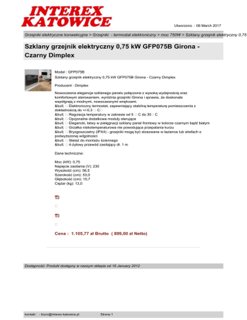 Utworzono : 08 March 2017 Grzejniki elektryczne konwekcyjne > Grzejniki - termostat elektroniczny > moc 750W > Szklany grzejnik elektryczny 0,75 Szklany grzejnik elektryczny 0,75 kW GFP075B Girona Czarny Dimplex Model : GFP075B Szklany grzejnik elektryczny 0,75 kW GFP075B Girona - Czarny Dimplex Producent : Dimplex Nowoczesna elegancja szklanego panelu połączona z wysoką wydajnością oraz komfortowym sterowaniem, wyróżnia grzejniki Girona i sprawia, że doskonale współgrają z modnymi, nowoczesnymi wnętrzami. • �Elektroniczny termostat, zapewniający stabilną temperaturę pomieszczenia z dokładnością do +/-0,3 �C� • �Regulacja temperatury w zakresie od 5 �C do 30�C • �Opcjonalne dodatkowe moduły sterujące • �Elegancki, łatwy w pielęgnacji szklany panel frontowy w kolorze czarnym bądź białym • �Grzałka niskotemperaturowa nie powodująca przepalania kurzu • �Bryzgoszczelny (IPX4) - grzejniki mogą być stosowane w łazience lub strefach o podwyższonej wilgotności • �Stelaż do montażu ściennego • �4-żyłowy przewód zasilający dł. 1 m Dane techniczne: Moc (kW): 0,75 Napięcie zasilania (V): 230 Wysokość (cm): 56,5 Szerokość (cm): 53,0 Głębokość (cm): 10,7 Ciężar (kg): 13,0 � � Cena : 1.105,77 zł Brutto ( 899,00 zł Netto) Dostępność: Produkt dostępny w naszym sklepie od 16 January 2012 kontakt : - [email protected] Strona 1