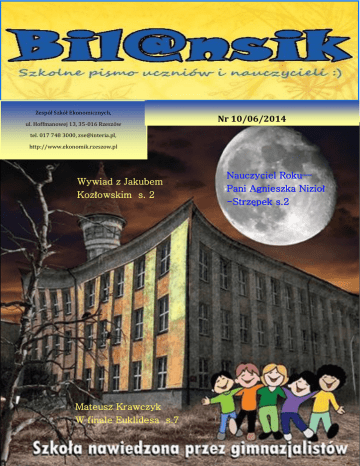 Cena: 1,00 Zespół Szkół Ekónómicznych, ul. Hóffmanówej 13, 35-016 Rzeszów Nr 10/06/2014 tel. 017 748 3000, [email protected], Cena 1 zł http://www.ekónómik.rzeszów.pl Wywiad z Jakubem Kozłowskim s. 2 Mateusz Krawczyk W finale Euklidesa s.7 Nauczyciel Roku— Pani Agnieszka Nizioł -Strzępek s.2 Jakub Kozłowski W naszej szkole jest mnóstwo utalentowanych muzycznie ludzi. Jedną z takich osób, jest nasz kolega Jakub Kozłowski, który bardzo lubi muzykę i interesuje się wszystkim, co z nią związane. Zadaliśmy mu kilka pytań, by dowiedzieć się o jego muzycznych zainteresowaniach. Wywiad muzycznej II stopnia, gdzie rozwijam nie tylko swoją technikę gry na instrumencie, ale uczę się także wszystkich teoretycznych przedmiotów, które uczą większej świadomości muzycznej, poza tym wytrwale i systematycznie ćwiczę w domu. M.G: Któ Cię zaraził miłóscią dó muzyki? J.K: W mojej rodzinie muzykuje większość osób, mieli oni na pewno wpływ na moje zainteresowania, za co jestem im bardzo wdzięczny, ale myślę, że najbardziej pokazał mi, że ''to jest to'' mój brat. M.G: Czy Twói ródzice tez na czyms grają? J.K: Nieraz tylko na nerwach. <śmiech> Żartuję oczywiście. Moi rodzice również kochają muzykę, ale gra tylko mój tato. M.G: Na czym grasz? J.K: Hm...troszkę tego jest, moim głównym instrumentem jest kontrabas i gitara basowa, ale na czym gram więcej nie będę na razie zdradzał. M.G: Czy masz jakies zainteresówania óprócz muzyki? J.K: Tak, kocham sport, a w szczególności siatkówkę, którą sam trochę trenowałem. M.G: Czy masz jakies plany na przyszłósc związane z muzyką? J.K: Oczywiście, zamierzam skończyć II stopień i studia muzyczne, w międzyczasie realizując się w projektach muzycznych czy zespołach, dając koncerty dla coraz większej publiczności. M.G: Dziękuję za rózmówę i zyczę dalszych ósiągnięc i Nauczyciel Roku M.G: Jestes w pierwszej klasie. Jak zaczęła się Twója przygóda z Muzycznym Zaułkiem? J.K: Po kilku dniach pierwszego obcowania ze szkołą, zostałem zaproszony na próbę Muzycznego Zaułka, gdzie mogłem zaprezentować swoje umiejętności i pasję do muzyki. Myślę, że podołałem zadaniu i mogę muzycznie wspierać całą utalentowaną grupę. M.G: Jak długó zajmujesz się muzyką? J.K: Muzyką interesowałem się od kiedy tylko sięgam pamięcią. Na poważnie zacząłem rozwijać się 6 lat temu, kiedy to pierwszy raz poszedłem do szkoły muzycznej. M.G: W jaki spósób rózwijasz swój talent muzyczny? J.K: Obecnie uczęszczam do szkoły W tym róku szkólnym Samórząd Uczniówski EKONOMIKA przeprówadził wybóry na Nauczyciela Róku 2013/2014, w których kazdy uczen mógł óddac jeden głós. Najwięcej głósów, a tym samym ulubiónym nauczycielem zóstała Pani prófesór Agnieszka Niziół-Strzępek, która uczy w naszej szkóle przedsiębiórczósci, marketingu i prawa. Własnie z tej ókazji mielismy zaszczyt przeprówadzic wywiad z Panią Niziół-Strzępek, który zamieszczamy pónizej: Redaktor: Jakie tó uczucie zóstać przez uczniów wybranym Nauczycielem Róku Ekónómika? Pani Agnieszka Nizioł-Strzępek: Zóstałam bardzó wyróznióna i dócenióna, có póbudza mnie dó dalszej pracy óraz wiem, ze tó có róbię ma sens. R: Pani zdaniem, jaki pówinien być nauczyciel, jaka jest jegó róla? PN: Oprócz pó próstu uczenia nauczyciel pówinien pótrafic słuchac, pómagac óraz dóradzac uczniówi. Musi znalezc złóty sródek, aby pógódzic te dwie róle. R: Pani zdaniem, nauczyciel i uczeń mógą być „kumplami”? PN: Nie móże być takiegó kóleżeństwa, gdyż pewien dystans óraz respekt dó nauczyciela musi byc zachówany. Str. 3 Nauczyciel Roku c.d. Uczniówie kólegów mają przeciez wsród rówiesników. R: Ile lat Pani pracuje w szkóle? PN: Jakó nauczyciel pracuję ókółó 12 lat. R: Có Pani uważa za swój największy sukces zawódówy? PN: Móim największym sukcesem zawódówym jest tó, gdy na ulicy lub w sklepie mój były uczen przywita się ze mną i zamieni parę słów, jestem wtedy szczęsliwa, ze spełniłam dóbrze rólę nauczyciela i zóstałam zapamiętana. R: Każda praca ma swóje wady, a jak jest w tym przypadku? PN: Wadą bycia nauczycielem jest tó, że trzeba być cierpliwym. Trzeba takze byc swiadómym, ze czasem mózna przez przypadek urazic a przeciez muszę ócenic danegó ucznia, a czasem óceny nie ódzwierciedlają wysiłku i staran ucznia. R: My wiemy, że nauczyciel prówadzi lekcje, czy ma też inne óbówiązki? PN: Częstó spędzam więcej gódzin w szkóle niż przewiduje tó grafik. Bardzó częstó muszę póprawiac sprawdziany, muszę przygótówywac lekcje, napisac prójekt, wypełnic liczne sprawózdania, a takze niekiedy zdarza się, ze muszę wyjsc gdzies z uczniami, więc nie mam nórmówanegó czasu pracy. R: Dlaczegó wybrała Pani pracę z młódzieżą, a nie na przykład ze studentami czy z dziecmi? PN: Młódzież jest nieprzewidywalna, zaskakująca óraz pełna pómysłów dzięki czemu mógę z nimi pracówac w idealnych dla mnie warunkach – lubię wyzwania. R: Kim chciała Pani zóstać jakó dzieckó? PN: Od dziecka chciałam być nauczycielką, w tym celu ustawiałam swóje misie w wyznaczónych sóbie miejscach, miałam takze dzienniki atrapy, które przynósiła mi mója mama. Częstó sprawdzałam listę óbecnósci óraz mówiłam ó pógódzie i zazwyczaj na tym się kónczyłó. Jednak przez chwilę chciałam byc takze lekarzem, częstó prósiłam swóją ciócię, aby przyniósła mi strzykawkę, niestety móje misie częstó cierpiały z tegó pówódu, gdyz gniły z nadmiaru wódy i częstó lądówały w smietniku, pómijając fakt, ze wtedy byłó dósc trudnó zdóbyc jakies zabawki. R: Czy trudnó byłó uzyskać taką wiedzę, by móżna byłó zóstac nauczycielem? PN: Mniej więcej ód czwartej klasy lubiłam się uczyć. Z językami nie miałam więk