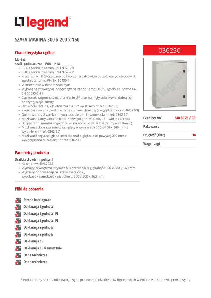 SZAFA MARINA 300 x 200 x 160 Charakterystyka ogólna Marina szafki poliestrowe - IP66 - IK10 IP66 zgodnie z normą PN-EN 60529 IK10 zgodnie z normą PN-EN 62262 Klasa izolacji II (stosowane do tworzenia całkowicie odizolowanych środowisk zgodnie z normą PN-EN 60439-1) Wzmocnione włóknem szklanym Wykonane z tworzywa odpornego na żar do temp. 960°C zgodnie z normą PNEN 60695-2-11 Doskonała odporność na promienie UV oraz na mgły solankowe, dobra na benzynę, oleje, smary Drzwi odwracalne, kąt otwarcia 180° (z wyjątkiem nr ref. 0362 50) Sworznie zawiasów wykonane ze stali nierdzewnej (z wyjątkiem nr ref. 0362 50) Dostarczane z 2 zamkami typu 'double bar' (1 zamek dla nr ref. 0362 50) Możliwość zamykania na klucz z dźwignią nr ref. 0368 05 + wkłada zamka Bezpośredni montaż wyposażenia na górze i dole szafki (śruby w zestawie) Możliwość dopasowania części płyty o wymiarach 500 x 400 x 200 mm(z wyjątkiem nr ref. 0362 50) Możliwość regulacji głębokości dla szaf o głębokości powyżej 200 mm z wykorzystaniem zestawu nr ref. 0362 42 036250 Cena bez VAT 348,86 ZŁ / SZ. Pakowanie Objętość (dm³) Waga (dag) Parametry produktu Szafki z drzwiami pełnymi Kolor drzwi: RAL7035 Wymiary zewnętrzne: wysokość x szerokość x głębokość:300 x 220 x 160 mm Wymiary odpowiadającej szafki metalowej, wysokość x szerokość x głębokość: 300 x 200 x 160 mm Pliki do pobrania Strona katalogowa Deklaracja Zgodności Deklaracja Zgodności PL Deklaracja Zgodności PL Deklaracja Zgodności Deklaracja Zgodności Deklaracja CE Deklaracja CE tłumaczenie Dane techniczne Dane techniczne * Podane ceny są cenami katalogowymi producenta dla klientów biznesowych w Polsce. Nie stanowią podstawy do 14 utrzymywania ceny odsprzedaży. Ceny nie zawierają podatku VAT. Styczeń 2017 r. Wszelkie dane zawarte w e-katalogu Legrand (np. charakterystyki, rysunki, zdjęcia, ceny) mogą ulec zmianie. Legrand Polska zastrzega sobie prawo do dokonywania tych zmian.