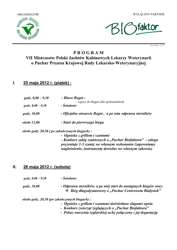 WYŁĄCZNY PARTNER ORGANIZATOR strona 1/2 PROGRAM VII Mistrzostw Polski Jachtów Kabinowych Lekarzy Weterynarii o Puchar Prezesa Krajowej Rady Lekarsko-Weterynaryjnej I. 25 maja 2012 r. (piątek) : godz. 8,00 – 9,30 – Biuro Regat : godz. 8,00 – 9,30 - zapisy do Regat (dla spóźnialskich) - Śniadanie godz. 10,00 - Oficjalne otwarcie Regat , a po nim odprawa sterników około 12,00 - Start do pierwszego biegu około godz. 20,30 ( po zakończonych biegach) : - Ognisko z grillem i szantami - Konkurs załóg szantowych o „Puchar Biofaktora” - załoga prezentuje 1-3 szanty we własnym wykonaniu (zapewniamy nagłośnienie, instrumenty dowolne we własnym zakresie) II. 26 maja 2012 r. (sobota) godz. 8,00 – 9,30 - Śniadanie godz. 10,00 - Odprawa sterników, a po niej start do następnych biegów oraz: Bieg długodystansowy o „Puchar Centrowetu Białystok” około godz. 20,30 (po zakończonych biegach) : - Ognisko z grillem i szantami doświetlane słupami ognia - Konkurs zwierząt żeglujących o „Puchar Biofaktora” - Pokaz warzenia żeglarskiej uchy połączony z jej degustacją III. 27 maja 2012 r. (niedziela): godz. 8,00 – 9,00 - Śniadanie godz. 9,30 - Odprawa sterników godz. 10,00 - Biegi regatowe ( czas i forma do decyzji sędziów ) około godz. 14,00 ( po zakończeniu biegów) - Obiad około godz. 15,00 - Ogłoszenie wyników i rozdanie nagród około godz. 15,30 - Zakończenie Regat Serdecznie zapraszamy do wspólnej zabawy!!! czarter jachtów w terminie pozaregatowym tel. (87) 4275179