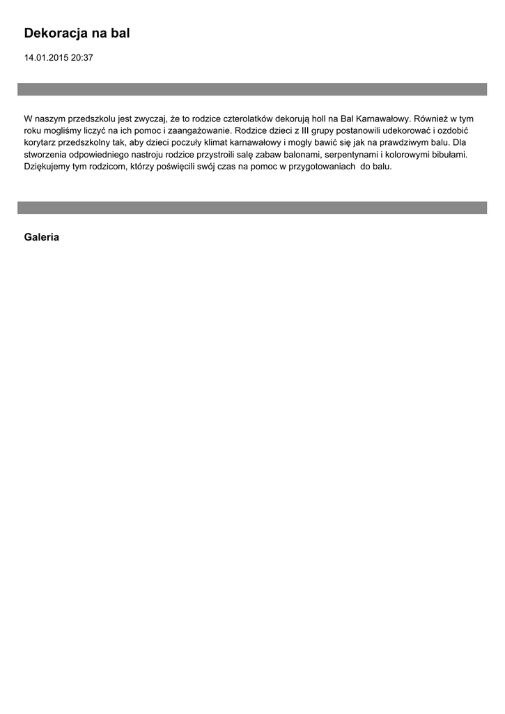 Dekoracja na bal 14.01.2015 20:37 W naszym przedszkolu jest zwyczaj, że to rodzice czterolatków dekorują holl na Bal Karnawałowy. Również w tym roku mogliśmy liczyć na ich pomoc i zaangażowanie. Rodzice dzieci z III grupy postanowili udekorować i ozdobić korytarz przedszkolny tak, aby dzieci poczuły klimat karnawałowy i mogły bawić się jak na prawdziwym balu. Dla stworzenia odpowiedniego nastroju rodzice przystroili salę zabaw balonami, serpentynami i kolorowymi bibułami. Dziękujemy tym rodzicom, którzy poświęcili swój czas na pomoc w przygotowaniach do balu. Galeria
