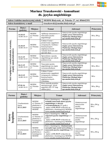Oferta szkoleniowa MODM, wrzesień 2015 - styczeń 2016 Mariusz Truszkowski - konsultant ds. języka angielskiego Adres i telefon macierzystej szkoły Adres kontaktowy e-mail Sieci współpracy i samokształcenia, warsztaty, zespoły samokształceniowe Forma Kursy bezpłatne Forma MODM Białystok, ul. Poleska 27, tel. 856642351 [email protected] Data i godziny Miejsce Temat 14.10.15 16:00-18:15 MODM ul. Poleska 27 Aplikacje internetowe w nauczaniu języka angielskiego Nauczyciele języka angielskiego Zapisy przez Internetową Platformę Obsługi http:// ipo.modm.bialystok.pl B4.a, B4.g 22.10.15 16:00-18:15 MODM ul. Poleska 27 Culture Corner promowanie zagadnień związanych z kulturą i historią krajów anglojęzycznych Autumn festivals and specials days Nauczyciele języka angielskiego Zapisy przez Internetową Platformę Obsługi http:// ipo.modm.bialystok.pl B4.a 12.11.15 16:00-18:15 MODM ul. Poleska 27 Sprawdzian z języka angielskiego po szkole podstawowej 26.11.15 16:00-18:15 MODM ul. Poleska 27 Nauczanie języka angielskiego na etapie wczesnoszkolnym 10.12.15 16:00-18:15 MODM ul. Poleska 27 07.01.16 16:00-18:15 MODM ul. Poleska 27 Data i godziny Adresaci Culture Corner promowanie zagadnień związanych z kulturą i historią krajów anglojęzycznych Christmas. Praca metodą projektu internetowego. Język angielski (III i IV etap edukacyjny) Miejsce Uruchomienie kursu 03.11.2015 MODM ul. Poleska 27 platforma elearningowa MODM Uruchomienie kursu 23.11.2015 MODM ul. Poleska 27 platforma elearningowa MODM Uruchomienie kursu 07.12.2015 MODM ul. Poleska 27 platforma elearningowa MODM Nauczyciele języka angielskiego Zapisy przez Internetową Platformę Obsługi http:// ipo.modm.bialystok.pl Nauczyciele języka angielskiego Zapisy przez Internetową Platformę Obsługi http:// ipo.modm.bialystok.pl Priorytety B4.a B4.a, B4.e Nauczyciele języka angielskiego Zapisy przez Internetową Platformę Obsługi http:// ipo.modm.bialystok.pl B4.a Nauczyciele języka angielskiego Zapisy przez Internetową Platformę Obsługi http:// ipo.modm.bialystok.pl B4.a, B4.g Temat Kurs e-learningowy - Metody i techniki nauczania dzieci języka angielskiego w okresie wczesnoszkolnym (25 godz.) zapisy od 01.10.15 wyłącznie na platformie e-learningowej MODM: www.emodm.modm.bialystok.pl Kurs e-learningowy: TIK na zajęciach języka angielskiego (15 godz.) zapisy od 01.10.15 wyłącznie na platformie e-learningowej MODM: www.emodm.modm.bialystok.pl Kurs e-learningowy: Zastosowanie narzędzi typu social networking w nauczaniu języka angielskiego (10 godz.) zapisy od 01.10.15 wyłącznie na platformie e-learningowej MODM: www.emodm.modm.bialystok.pl Adresaci Priorytety Zainteresowani nauczyciele języka angielskiego B4.a, B4.g, B4.e Zainteresowani nauczyciele języka angielskiego B4.a, B4.g Zainteresowani nauczyciele języka angielskiego B4.a, B4.g Oferta szkoleniowa MODM, wrzesień 2015 - styczeń 2016 Forma Data i godziny Inne (inne formy wspierania szkół no. Diagnozy, szkolenia Rad Pedagogicznych itp.). październik czerwiec 2015/2016 Miejsce YLRC/ MODM ul. Poleska 27 Temat Kurs kwalifikacyjny z zakresu metodyki nauczania języka angielskiego w okresie wczesnoszkolnym dla nauczycieli nauczania wczesnoszkolnego. Kurs obejmuje realizację 260 godzin dydaktycznych. Cena kursu - 1350 zł (przy grupie 15 osobowej) Zapisy do 30 września 2015 r. Adresaci Priorytety Nauczyciele nauczania wczesnoszkolnego P1, B4e Wszyscy nauczyciele P1, Nauczyciele języka angielskiego B4.a, B4.g Nauczyciele języka angielskiego Zapisy przez Internetową Platformę Obsługi http:// ipo.modm.bialyst ok.pl B4.a, B4.g Płatne kursy języka angielskiego dla dorosłych na różnych poziomach. październik czerwiec 2015/2016 Grudzień 2015 MODM ul. Poleska 27 YLRC/ MODM ul. Poleska 27 wrzesień listopad 2014 Podcasting in the Classroom Presenter: Jeff Kuhn Co-Teaching: Strategies for Sharing and Improving the Teaching Experience Presenter: Amy Hanna 07.10.15 14.00 - 15:00 04.11.15 14:00 - 15:00 18.11.15 14:00 - 15:00 III edycja konkursu dla nauczycieli języka angielskiego - ciekawa lekcja z wykorzystaniem technologii informacyjno-komunikacyjnych Szczegółowy regulamin zostanie opublikowany na stronie MODM: www.modm.bialystok.pl American English Webinars Series: (cykl 5 warsztatów on-line): 23.09.15 14.00 - 15:00 21.10.15 14:00 - 15:00 Kursy obejmuję 60 godzin lekcyjnych. Cena kursu - 480 zł Zapisy do 10 października 2015 r. tel. MODM 856642351 lub email: [email protected] YLRC/ MODM ul. Poleska 27 Learn It! Share It! Using a Variety of Tools for Sharing Best Practices and Materials Across Continents Presenter: Ryan Brux Building Student Autonomy through Cooperative Classroom Management Presenter: Gena Rhoades Making it Meaningful: Bringing Learning to Life with Culturally Relevant Teaching Presenter: Tabitha Kidwell