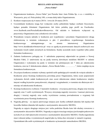 REGULAMIN KONKURSU „Nowa Fabia” 1. Organizatorem konkursu „Nowa Fabia” jest Porsche Inter Auto Polska Sp. z o.o. z siedzibą w Warszawie, przy ul. Połczyńskiej 108, a zwana dalej także Organizatorem. 2. Konkurs rozpoczyna się 6 marca 2015r. i trwa do 20 marca 2015r. 3. Uczestnikami konkursu mogą być wyłącznie osoby pełnoletnie będące osobami fizycznymi, będące ponadto klientami Organizatora lub które polubią jego profil na Facebooku: www.facebook.com/PorscheKrakowBronowice. Od udziału w konkursie wyłączeni są pracownicy Organizatora oraz członkowie ich rodzin. 4. Warunkiem wzięcia udziału w konkursie jest wypełnienie i przesłanie Organizatorowi drogą elektroniczną w terminie wskazanym w pkt. 2 prawidłowo wypełnionego formularza konkursowego udostępnionego na stronie internetowej Organizatora http://www.skodakrakowbronowice.pl wraz ze zgodą na przetwarzanie danych osobowych oraz wykonanie trzech zadań zawartych na formularzu. Każdy uczestnik może wypełnić tylko jeden formularz konkursowy. 5. Zadania konkursowe polegają na: 1/ udzieleniu poprawnej odpowiedzi na pytanie o Nowej Skodzie Fabii, 2/ umówieniu się na jazdę testową dowolnym modelem SKODY w salonie Organizatora i wykonaniu tej jazdy w terminie nie późniejszym niż 7 dniu po zakończeniu konkursu, oraz na 3/ dokończeniu zdania: „Nowa Skoda Fabia ……………”, które znajduje się na formularzu konkursowym. 6. Zwycięzca konkursu zostanie wybrany spośród osób spełniających warunki do wzięcia udziału w Konkursie przez Komisję konkursową powołaną przez Organizatora, która oceni poprawność wykonania dwóch zadań konkursowych oraz oceni dokończone zdanie konkursowe między innymi według kryteriów pomysłowości, ekspresji i oryginalności, w terminie nie dłuższym niż 1 miesiąc od zakończenia Konkursu. 7. Komisja konkursowa wybierze 3 laureatów konkursu –zwycięzcę pierwszej, drugiej oraz trzeciej nagrody oraz 5 osób wyróżnionych. Wszyscy otrzymają nagrody rzeczowe. Laureaci pierwszej, drugiej i trzeciej nagrody oraz osoby wyróżnione zostaną powiadomione o wygranej lub wyróżnieniu przez Komisję konkursową. 8. Nagrodą główną – za zajecie pierwszego miejsca jest: kurtka softshell (damska lub męska) lub koszulka fashion (damska lub męska) z asortymentów akcesoriów SKODA. Nagrodą za zajęcie drugiego miejsca jest: torba podróżna Skoda-Auto lub okulary rowerowe z asortymentów akcesoriów SKODA. Nagrodą za zajęcie trzeciego miejsca jest komplet pokrowców na koła (4 szt.) lub rękawiczki rowerowe z asortymentów akcesoriów SKODA. Osoba nagrodzona musi wskazać jedną z wymienionych nagród jako tę, którą chce otrzymać w ramach wygranej. Upominkami dla osób wyróżnionych w konkursie są kosmetyki samochodowe SKODA. 9. Dokładny termin odbioru nagrody zostanie ustalony wspólnie przez zwycięzców oraz Organizatora, a w przypadku braku porozumienia – samodzielnie przez Organizatora. 10. Ostateczne nabycie prawa do nagrody lub wyróżnienia w Konkursie nastąpi po potwierdzeniu przez Organizatora zgodności danych uczestnika, prawidłowości wypełnionego formularza oraz stwierdzeniu braku przesłanek wyłączających od udziału w konkursie. Uczestnik traci prawo do nagrody lub wyróżnienia w szczególności, jeżeli nie był uprawniony do udziału w konkursie, nie spełnia warunków regulaminu lub w sposób sprzeczny z przepisami prawa lub dobrymi obyczajami wpłynął lub starał się wpłynąć na wynik konkursu. W wypadku utraty przez uczestnika prawa do nagrody Komisja może ją przyznać w miejsce wyróżnienia jednej z osób wyróżnionych. 11. Organizator ma prawo żądać złożenia przez uczestnika stosownych oświadczeń niezbędnych dla prawidłowego przebiegu konkursu. 12. Organizator uprawniony jest do zmiany regulaminu w każdym czasie. Zmiana regulaminu wchodzi w życie po jej publicznym ogłoszeniu w miejscu prowadzenia konkursu. 13. Z ważnych powodów Organizator może zakończyć lub odwołać Konkurs przed upływem terminu wskazanego w pkt. 2, poprzez publiczne ogłoszenie zakończenia w miejscu prowadzenia konkursu.